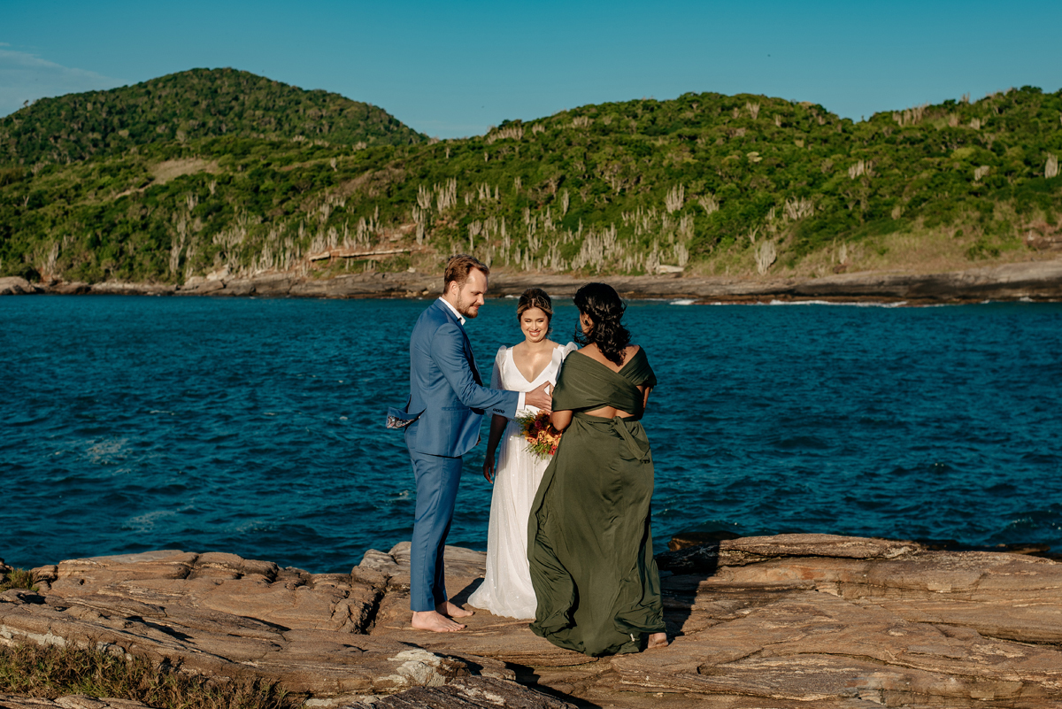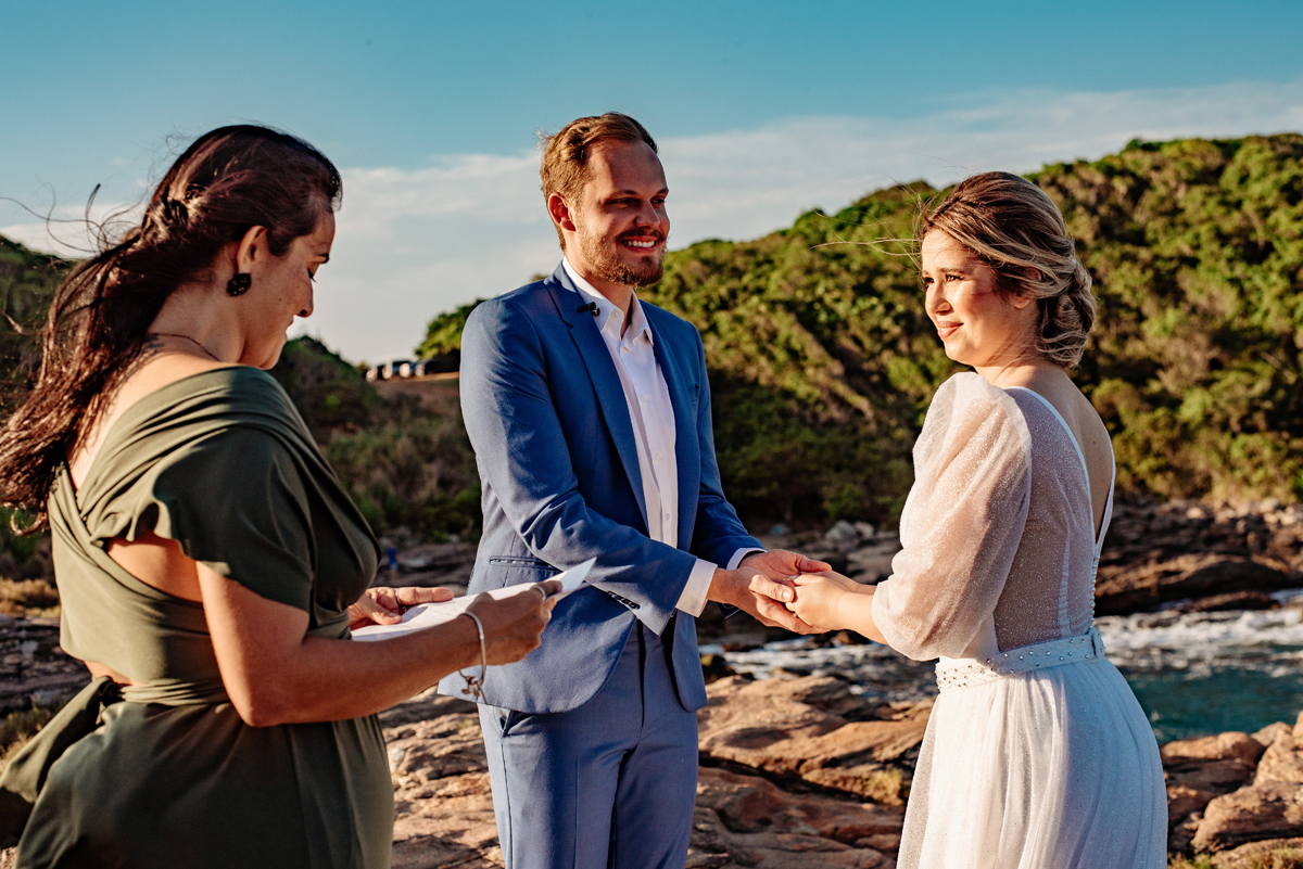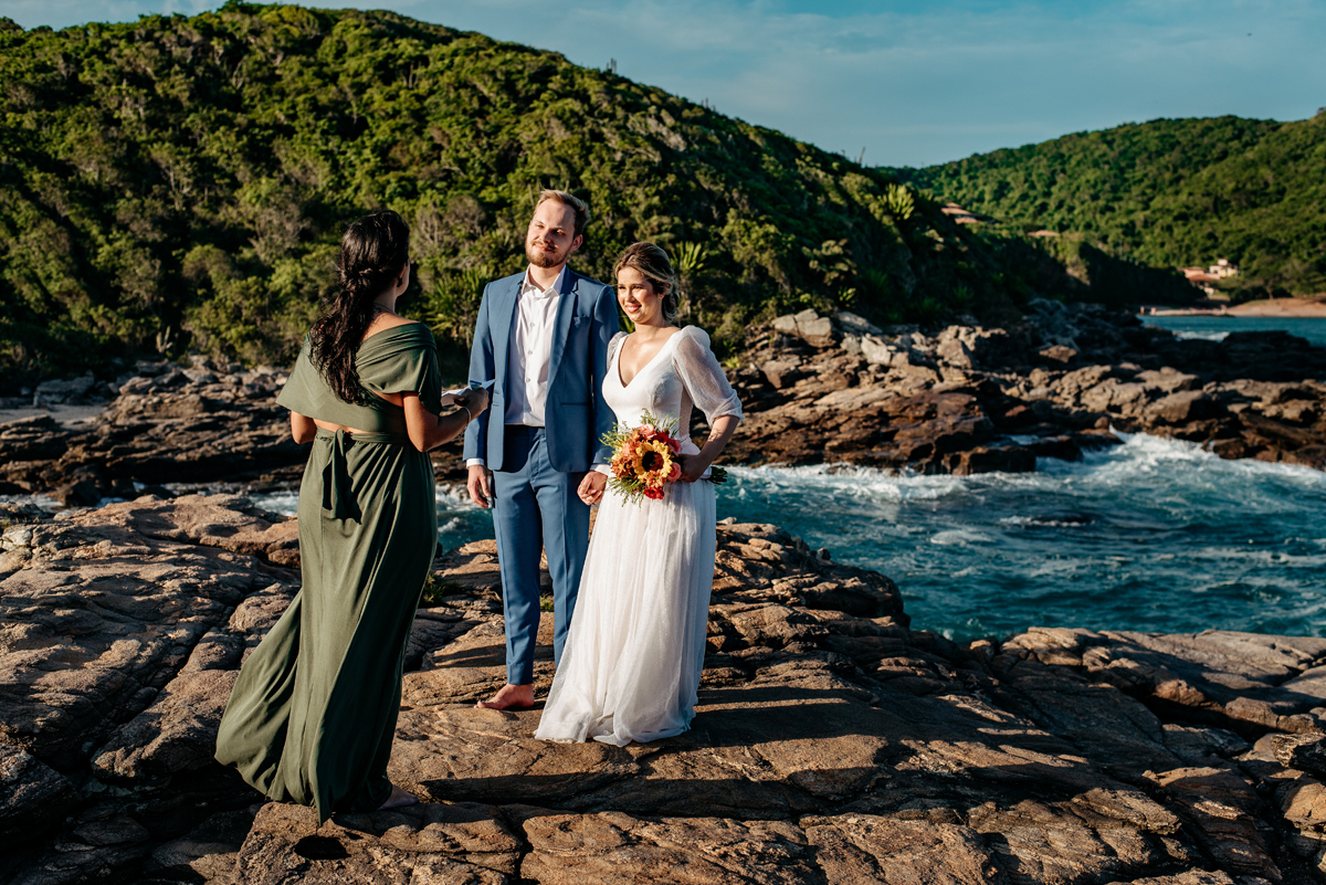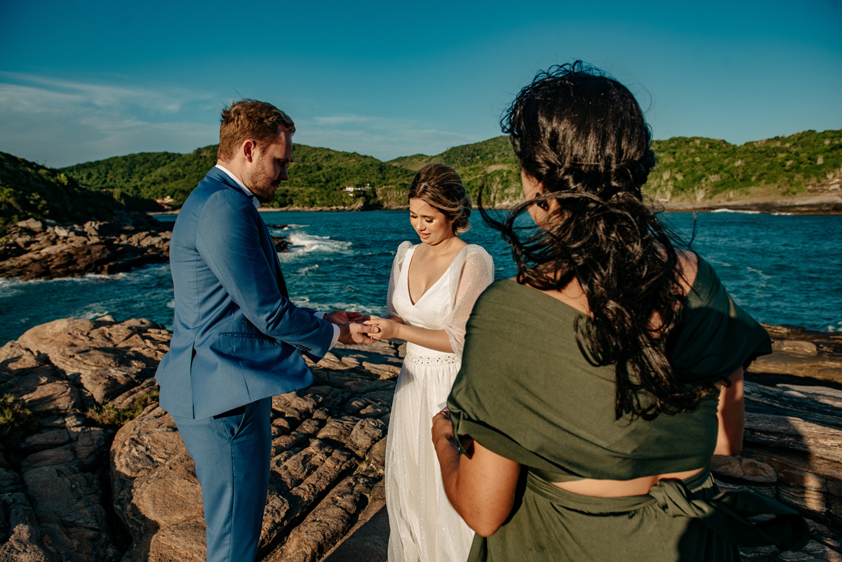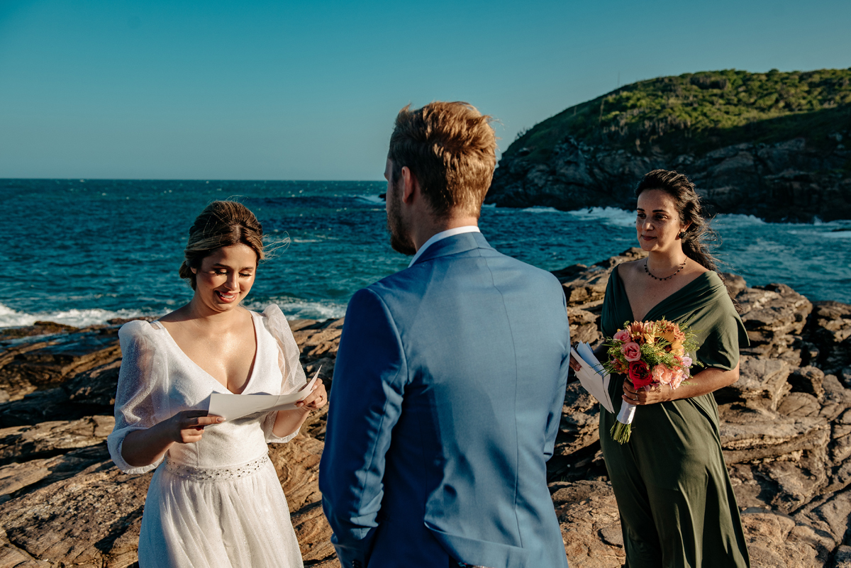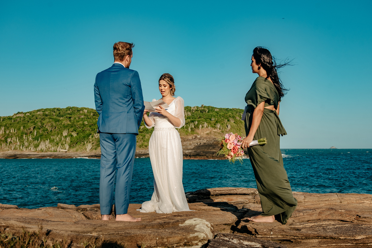 Com a luz dourada batendo no mar, o vento suave e uma sintonia que transbordava, eles disseram “sim” da forma mais autêntica: bonita, verdadeira e profundamente deles