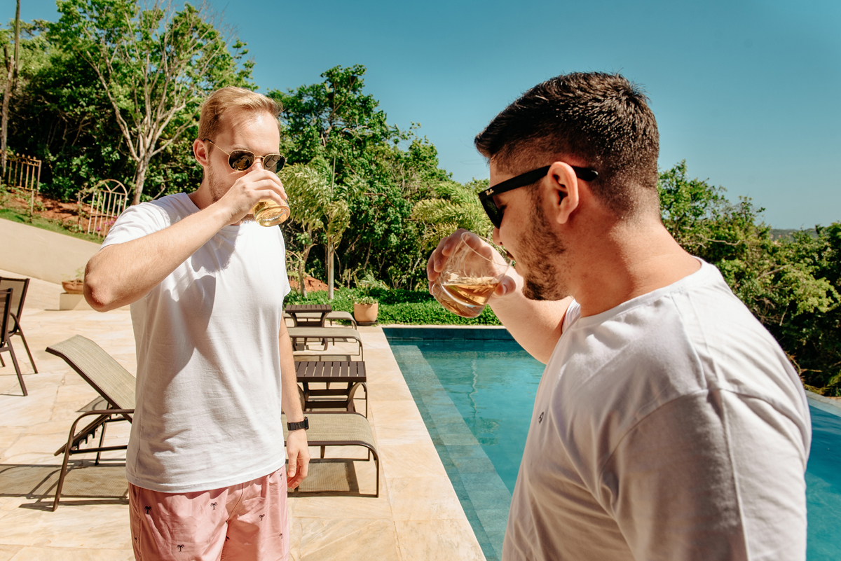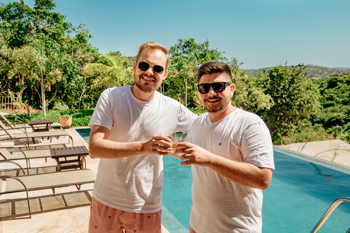 O dia começou entre amigos — ela brindando com espumante, ele trocando risadas ao lado do melhor amigo, cada detalhe carregado daquela leveza boa que só existe quando a gente está entre pessoas que importam.