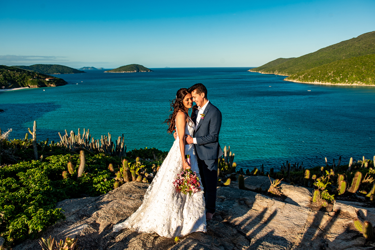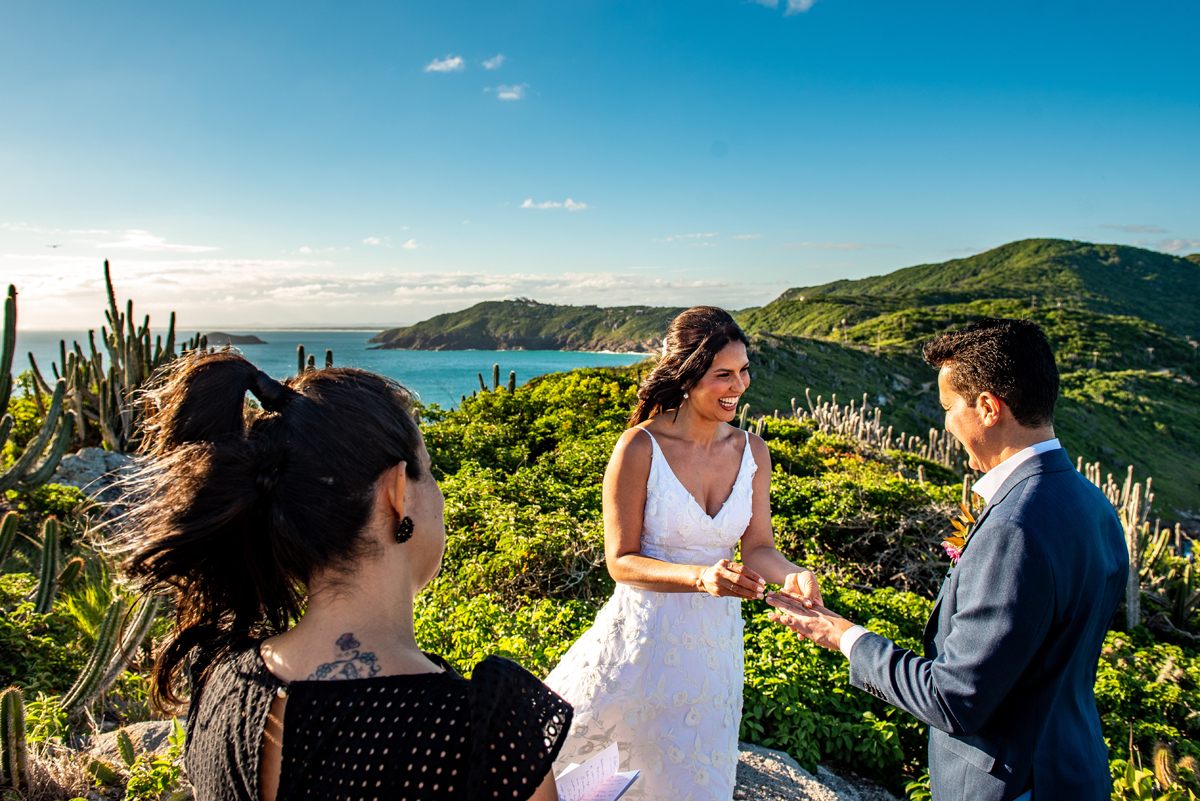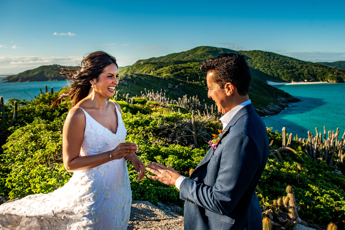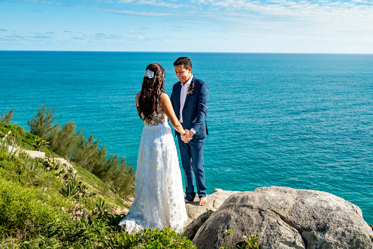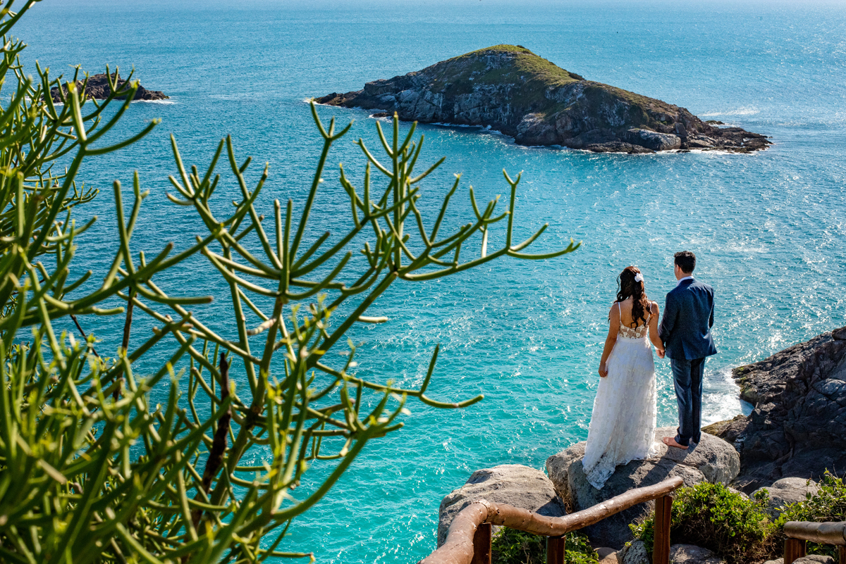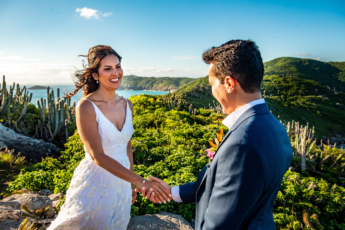 No alto de um mirante em Arraial do Cabo, com o mar azul profundo como testemunha, Rosi e Marcelo disseram “sim” ao amor que construíram com calma, verdade e parceria.