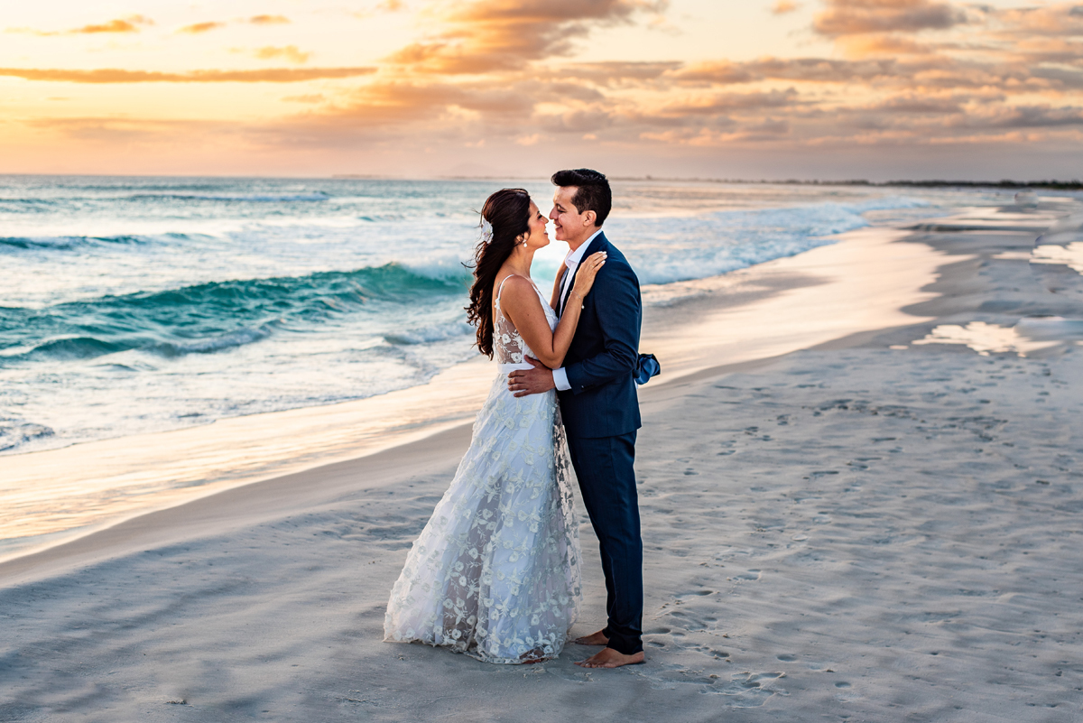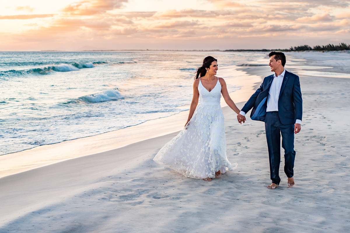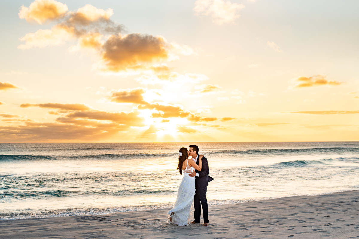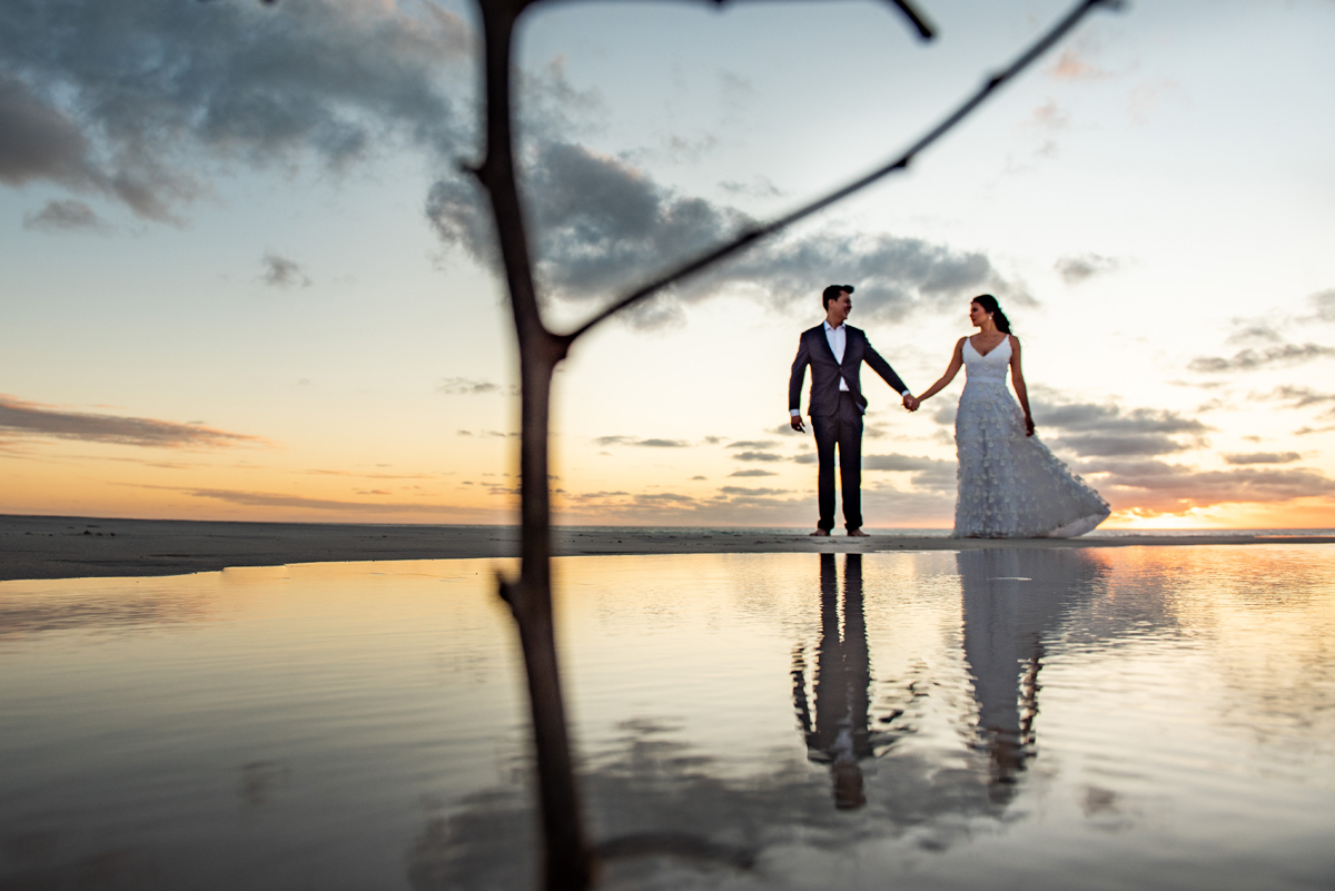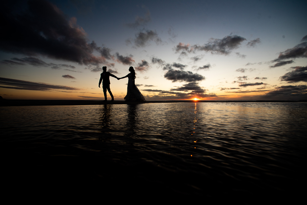 Depois da cerimônia, eles desceram para a praia, pé na areia e coração leve, deixando o pôr do sol pintar o ensaio com tons dourados.