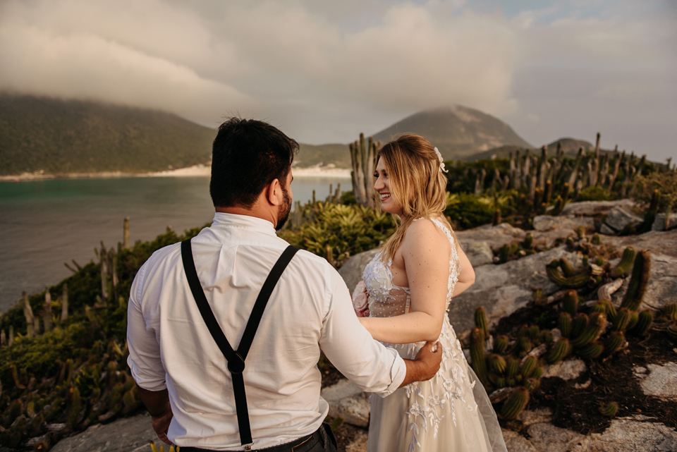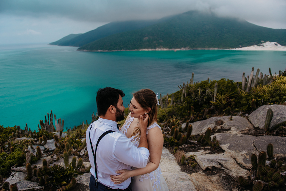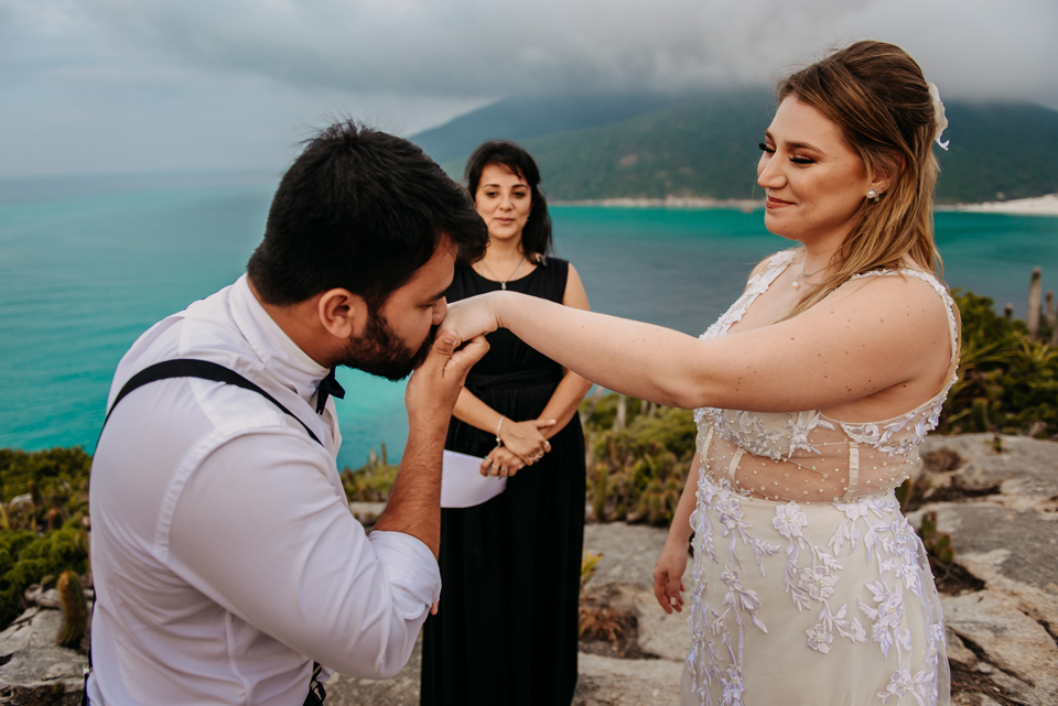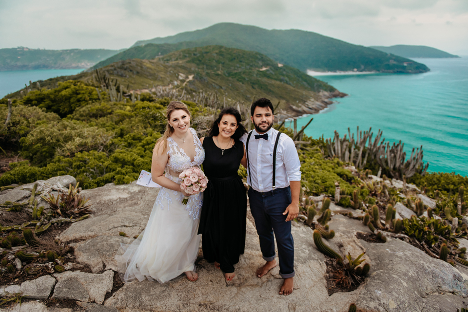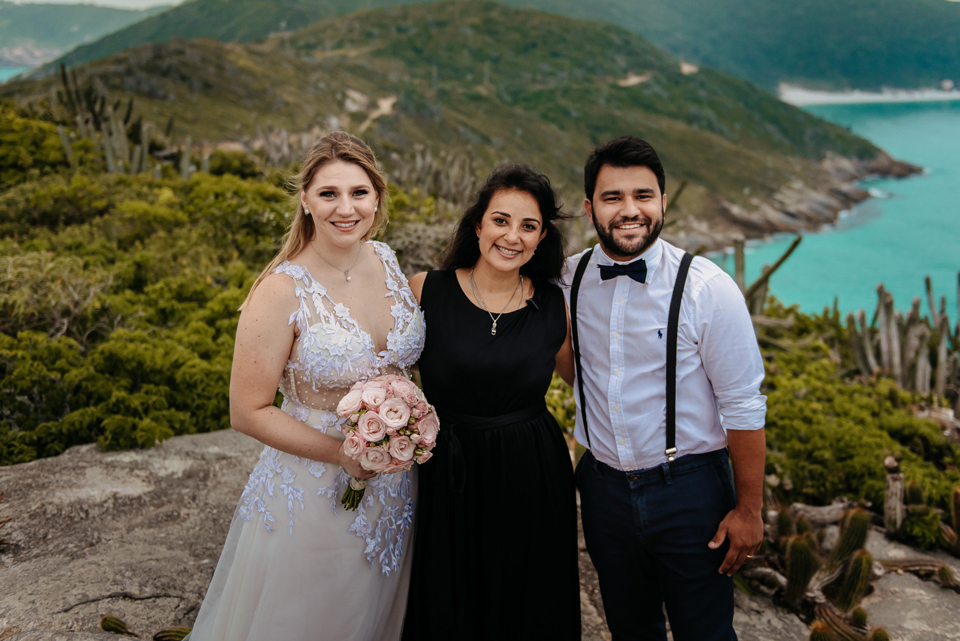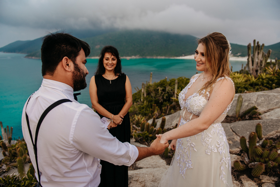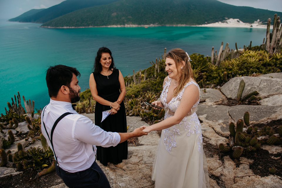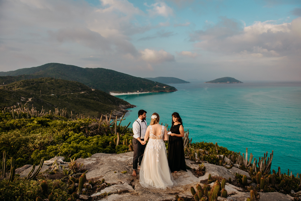 No mirante do Pontal do Atalaia, com o mar aberto e o vento soprando leve, Vivian e Pedro disseram “sim” do jeitinho deles: com risadas, leveza e aquela energia boa que só um casal divertido tem.