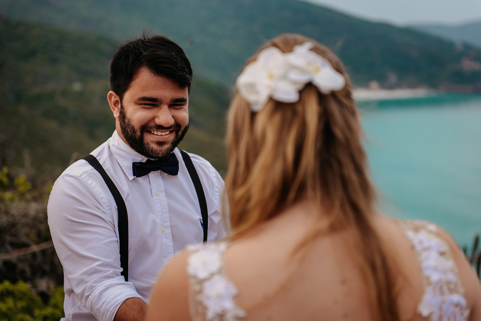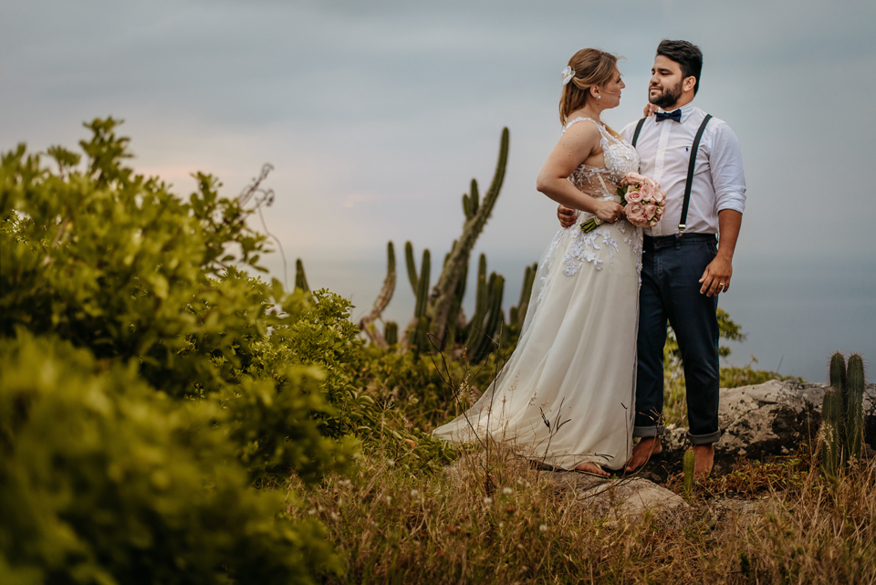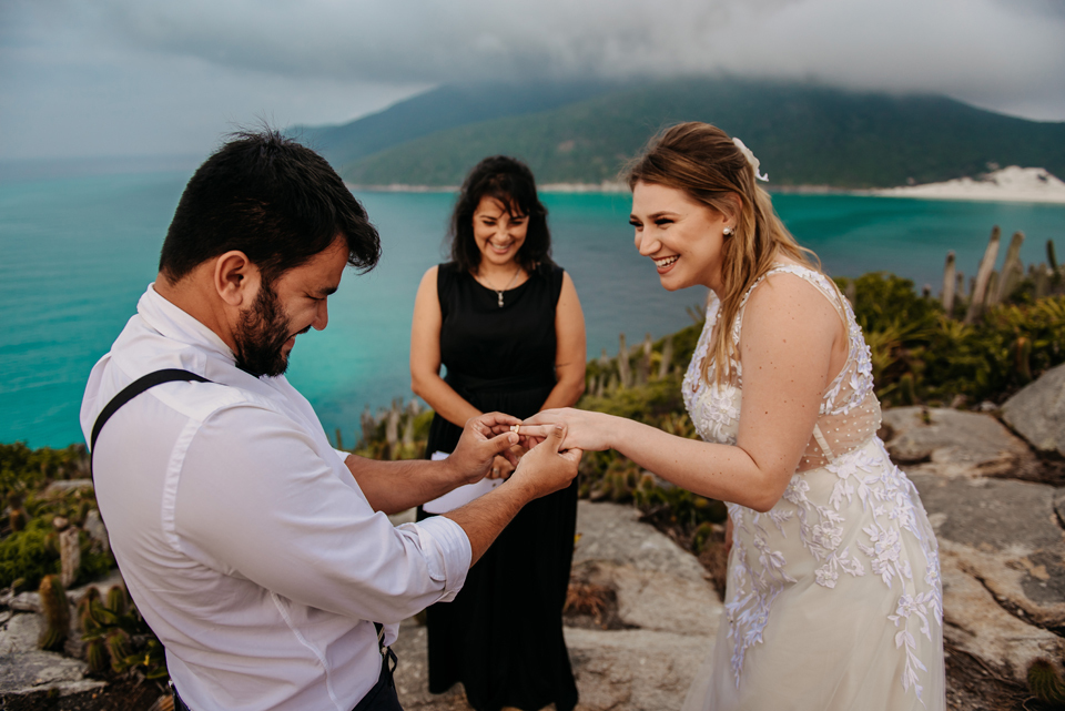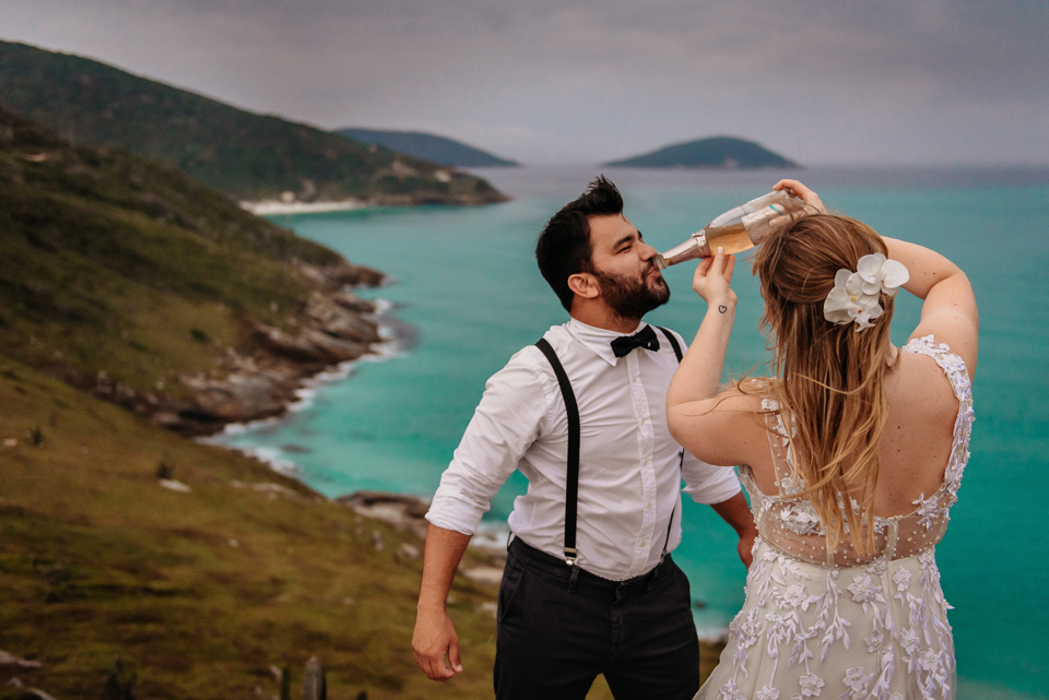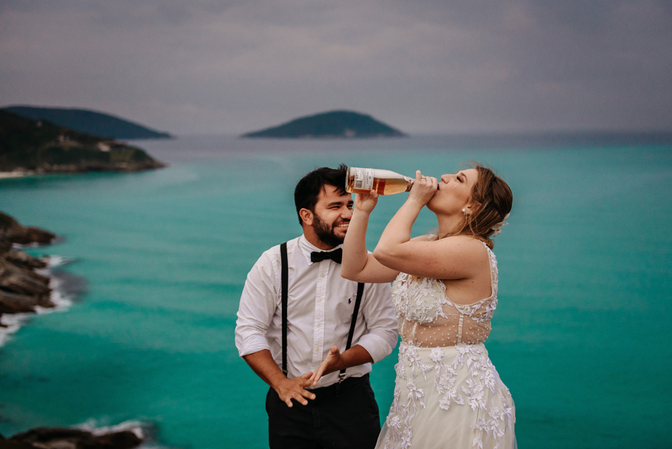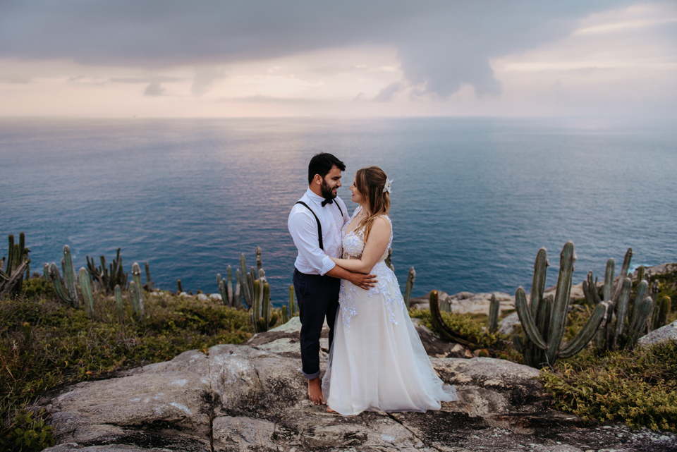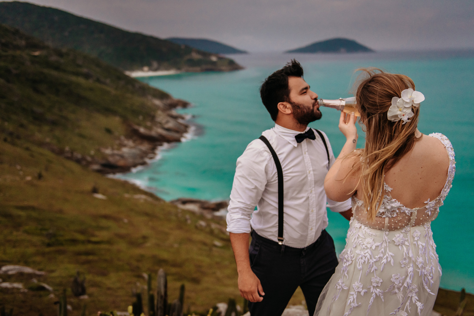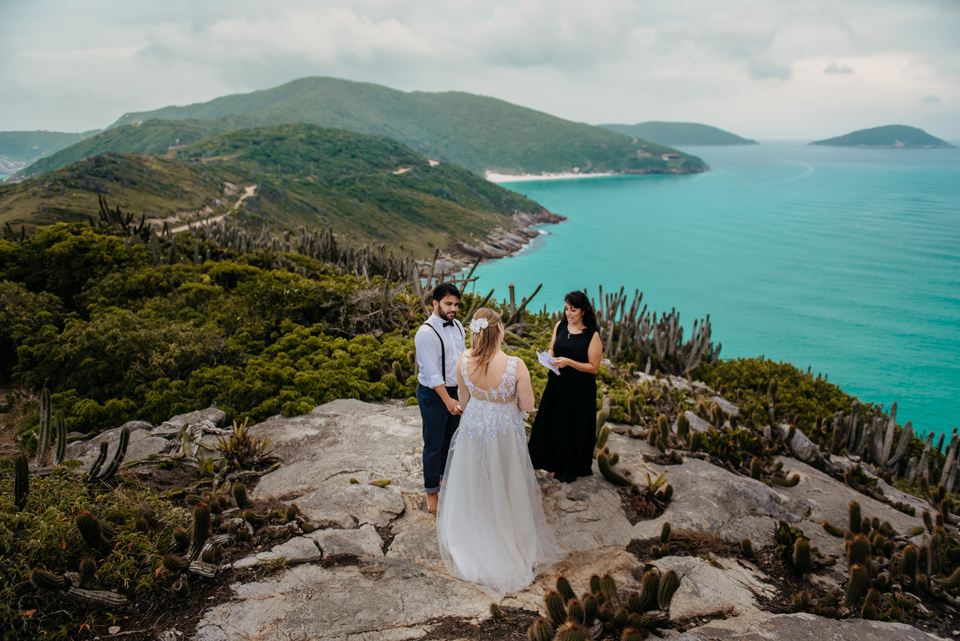 No mirante do Pontal do Atalaia, com o mar aberto e o vento soprando leve, Vivian e Pedro disseram “sim” do jeitinho deles: com risadas, leveza e aquela energia boa que só um casal divertido tem.
