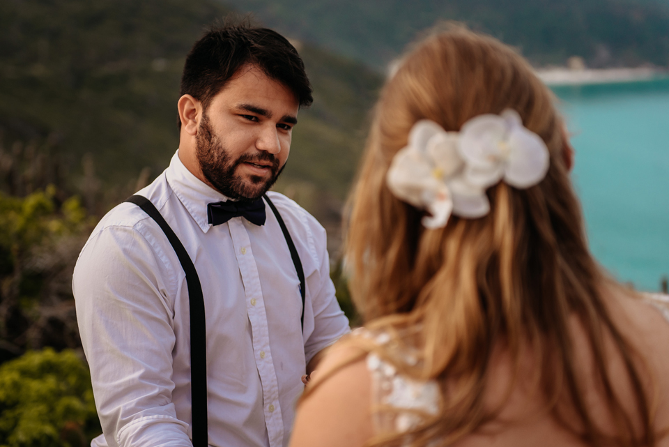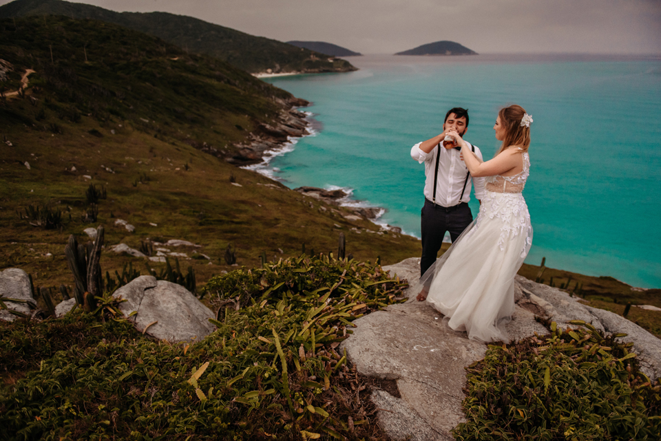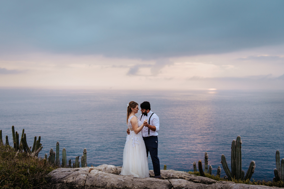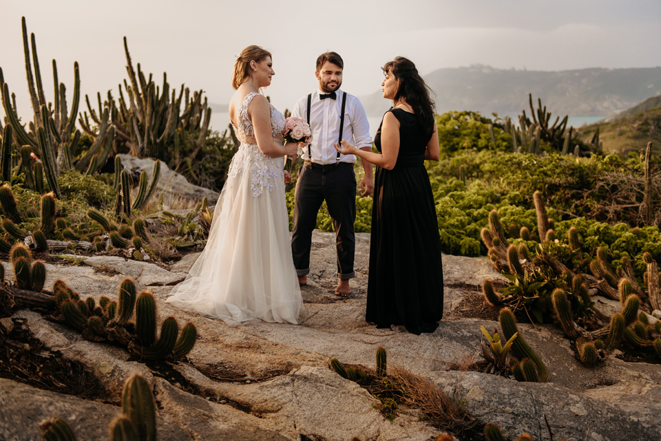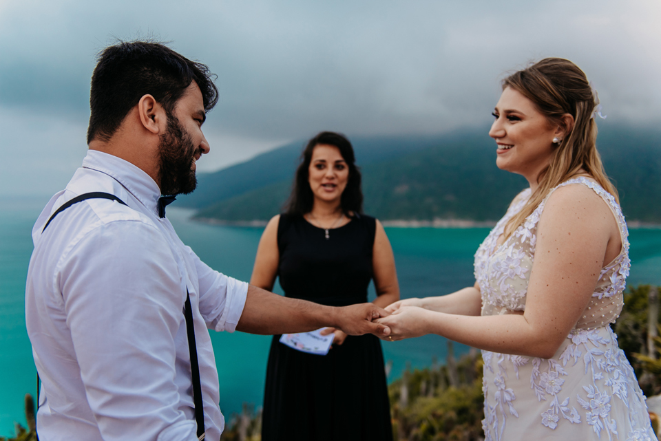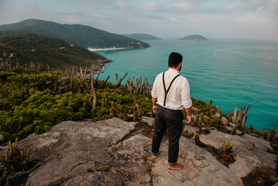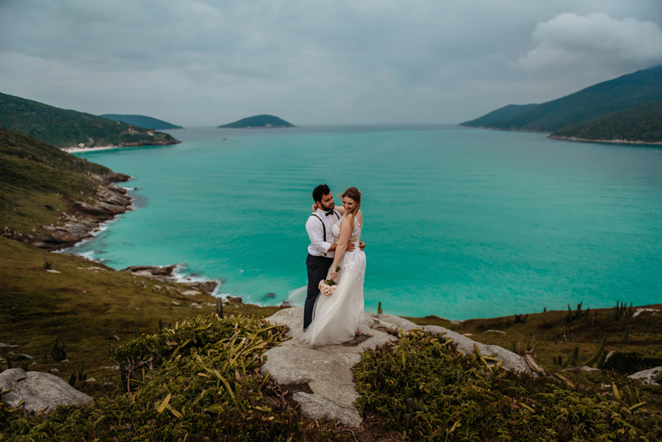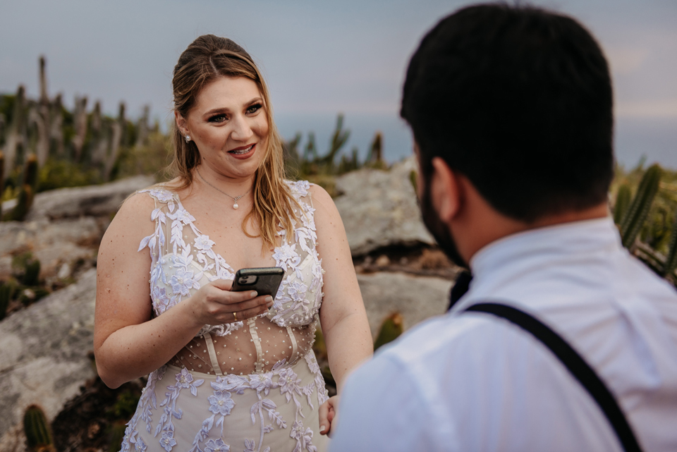No mirante do Pontal do Atalaia, com o mar aberto e o vento soprando leve, Vivian e Pedro disseram “sim” do jeitinho deles: com risadas, leveza e aquela energia boa que só um casal divertido tem.