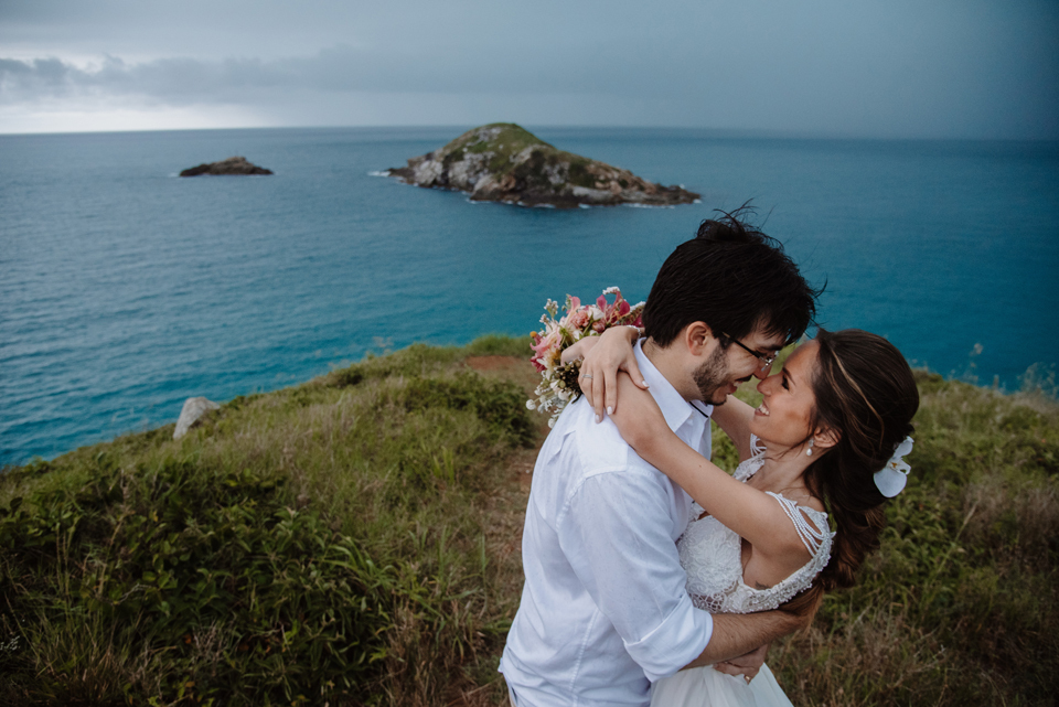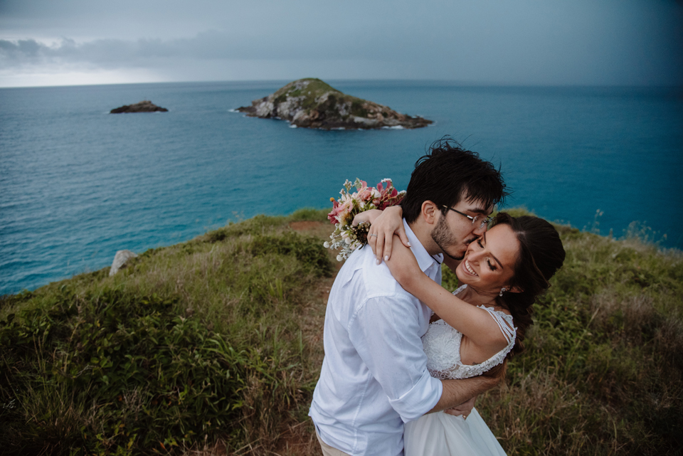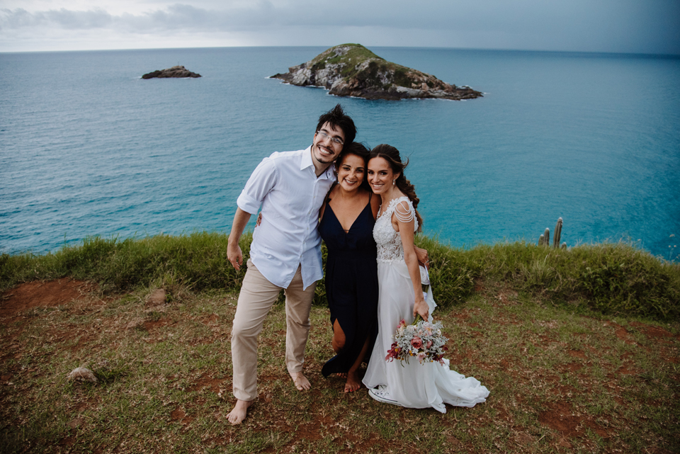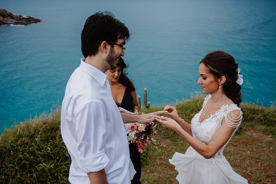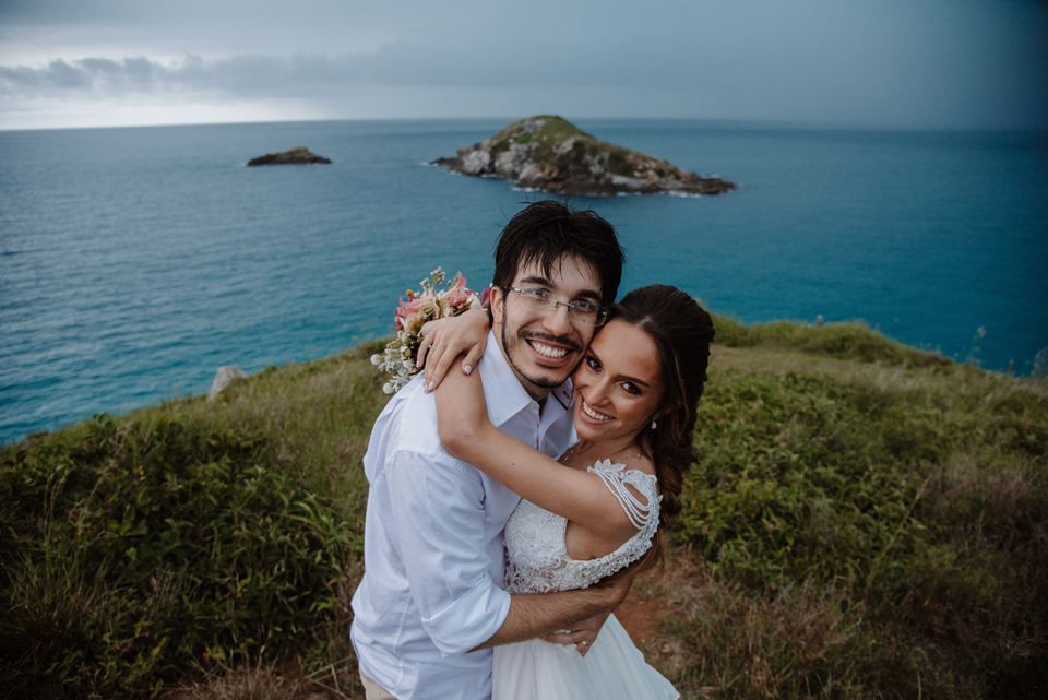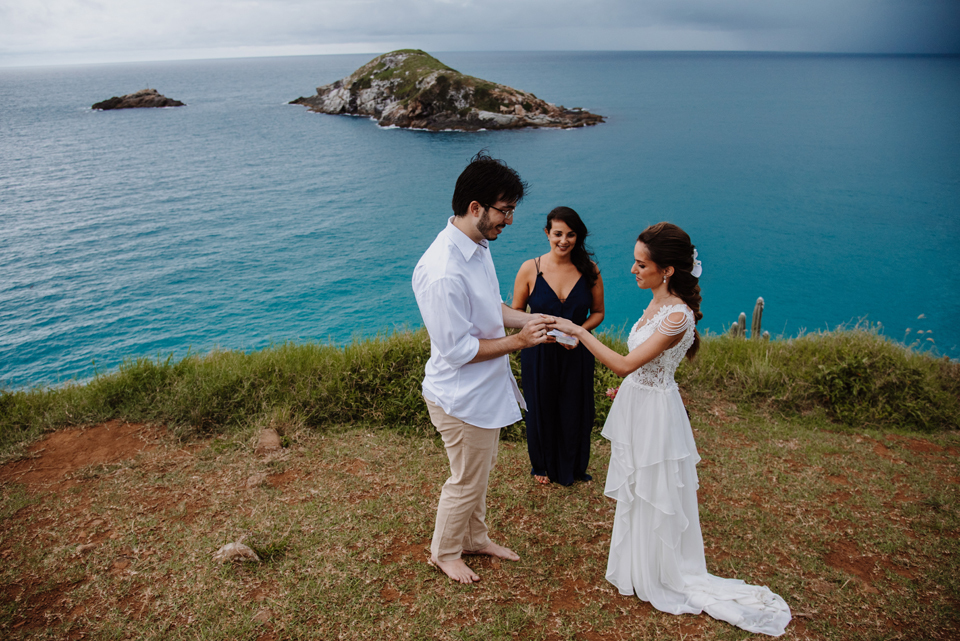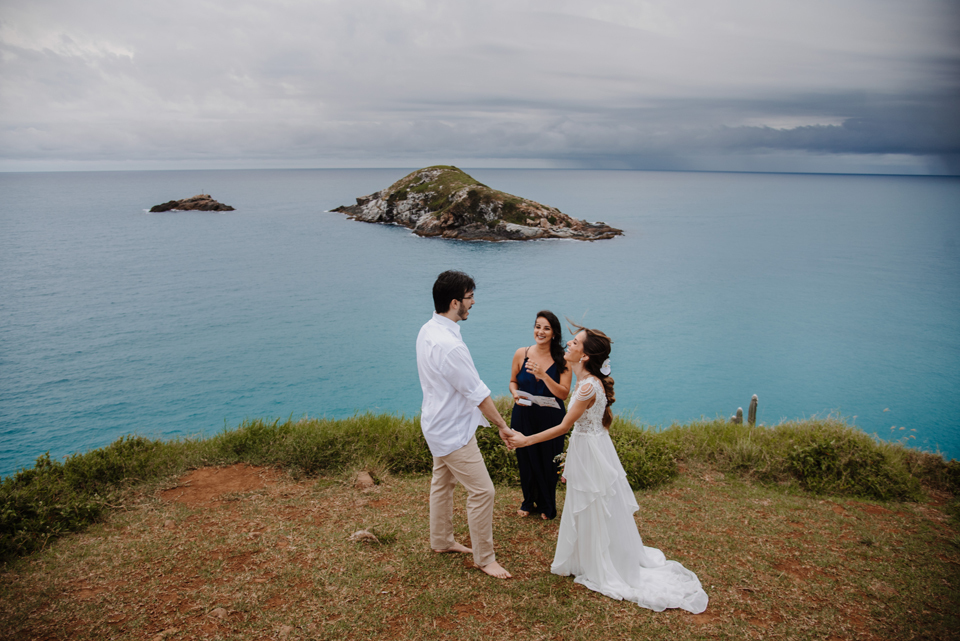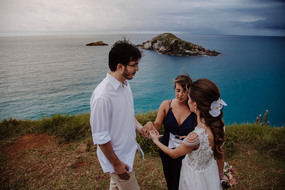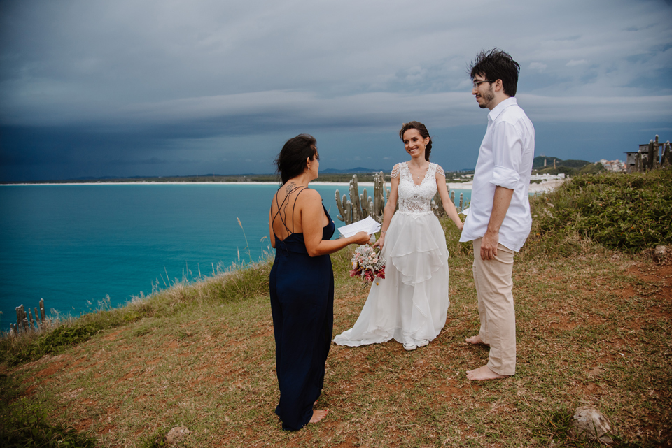 Larissa e Rodrigo escolheram um dos mirantes do Pontal do Atalaia para dizer “sim”, e o clima resolveu surpreender.