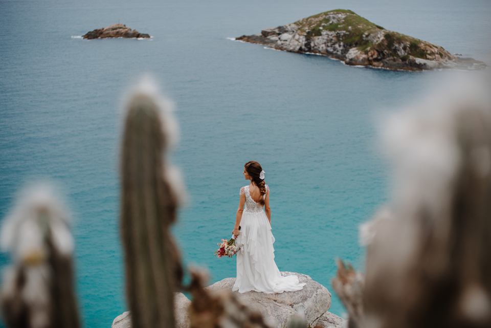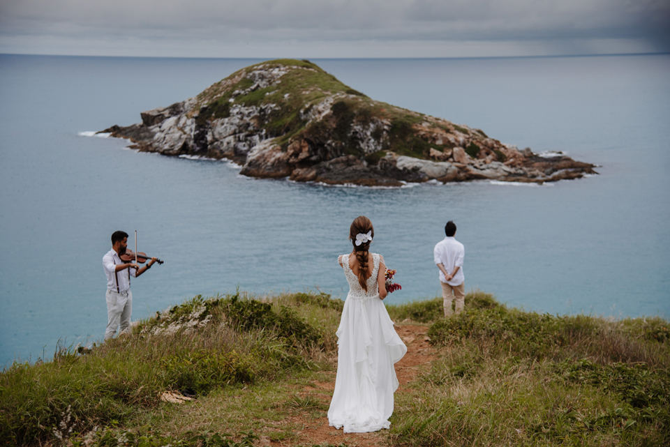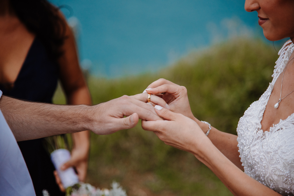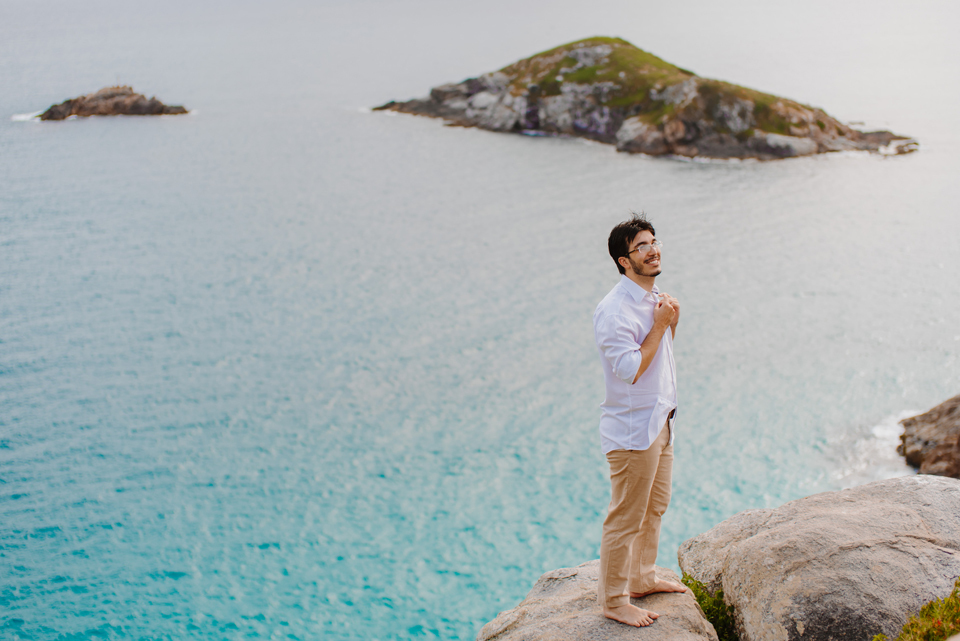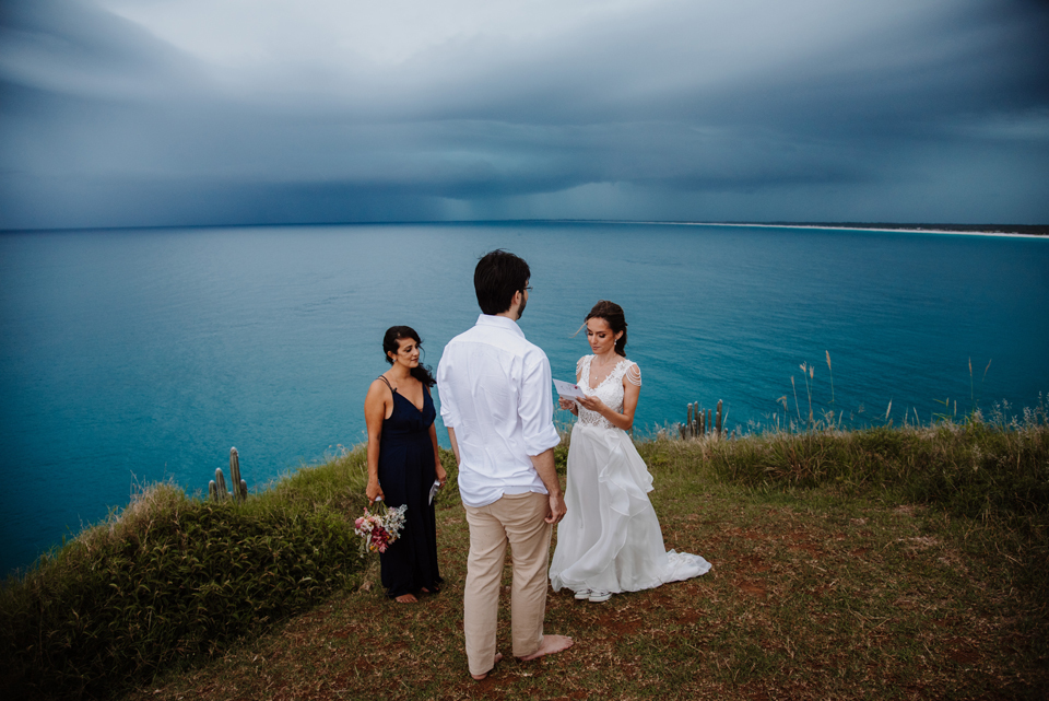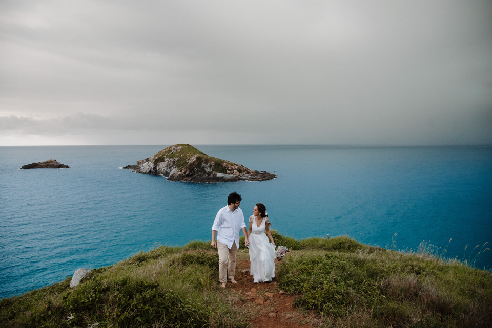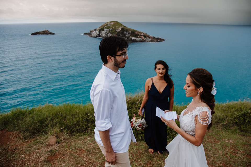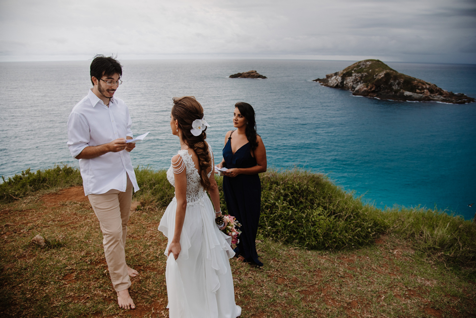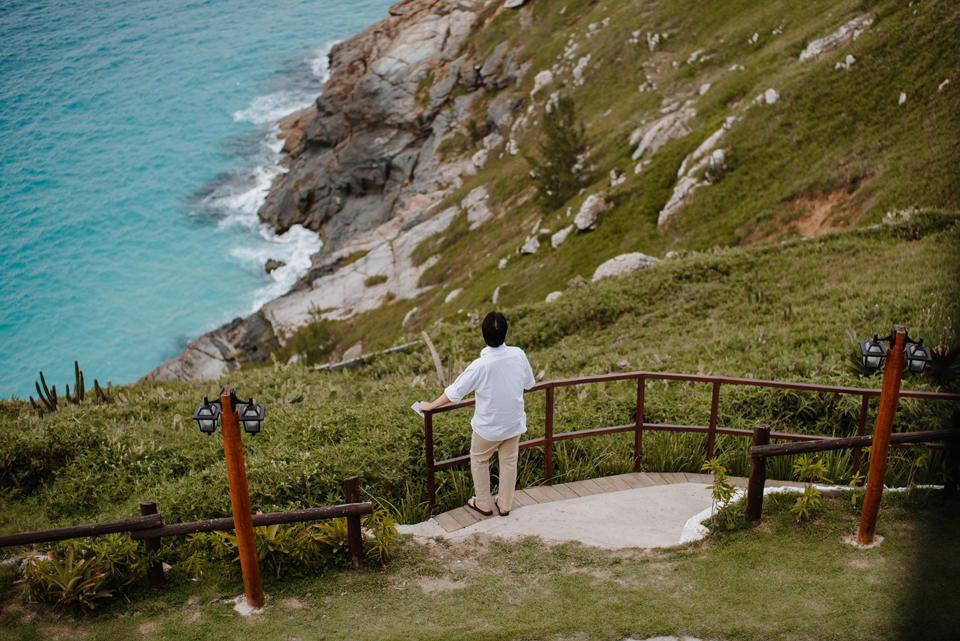 Larissa e Rodrigo escolheram um dos mirantes do Pontal do Atalaia para dizer “sim”, e o clima resolveu surpreender.
