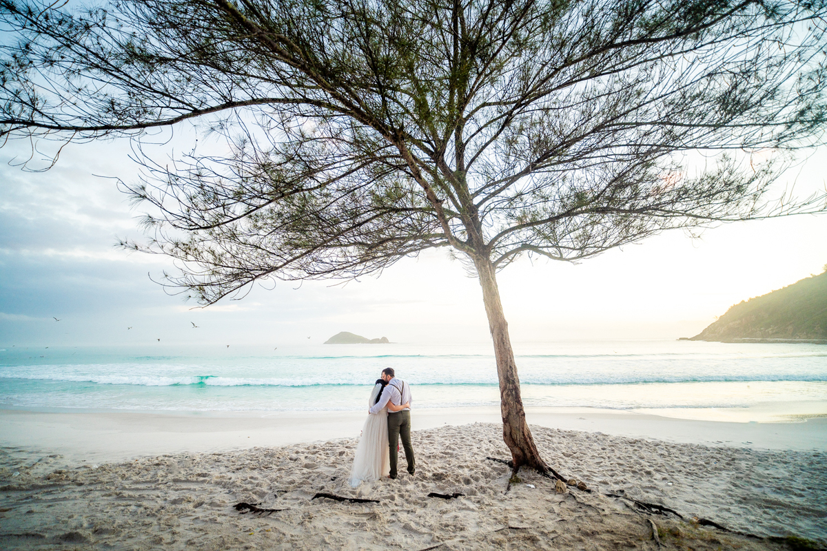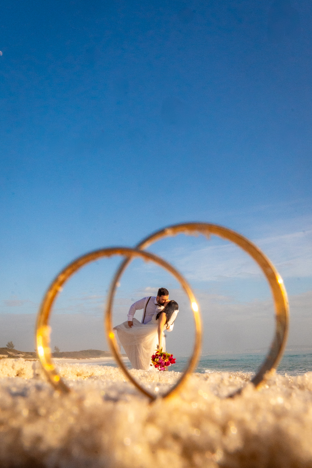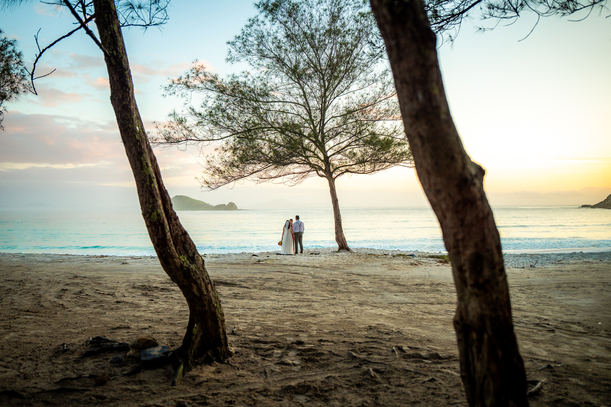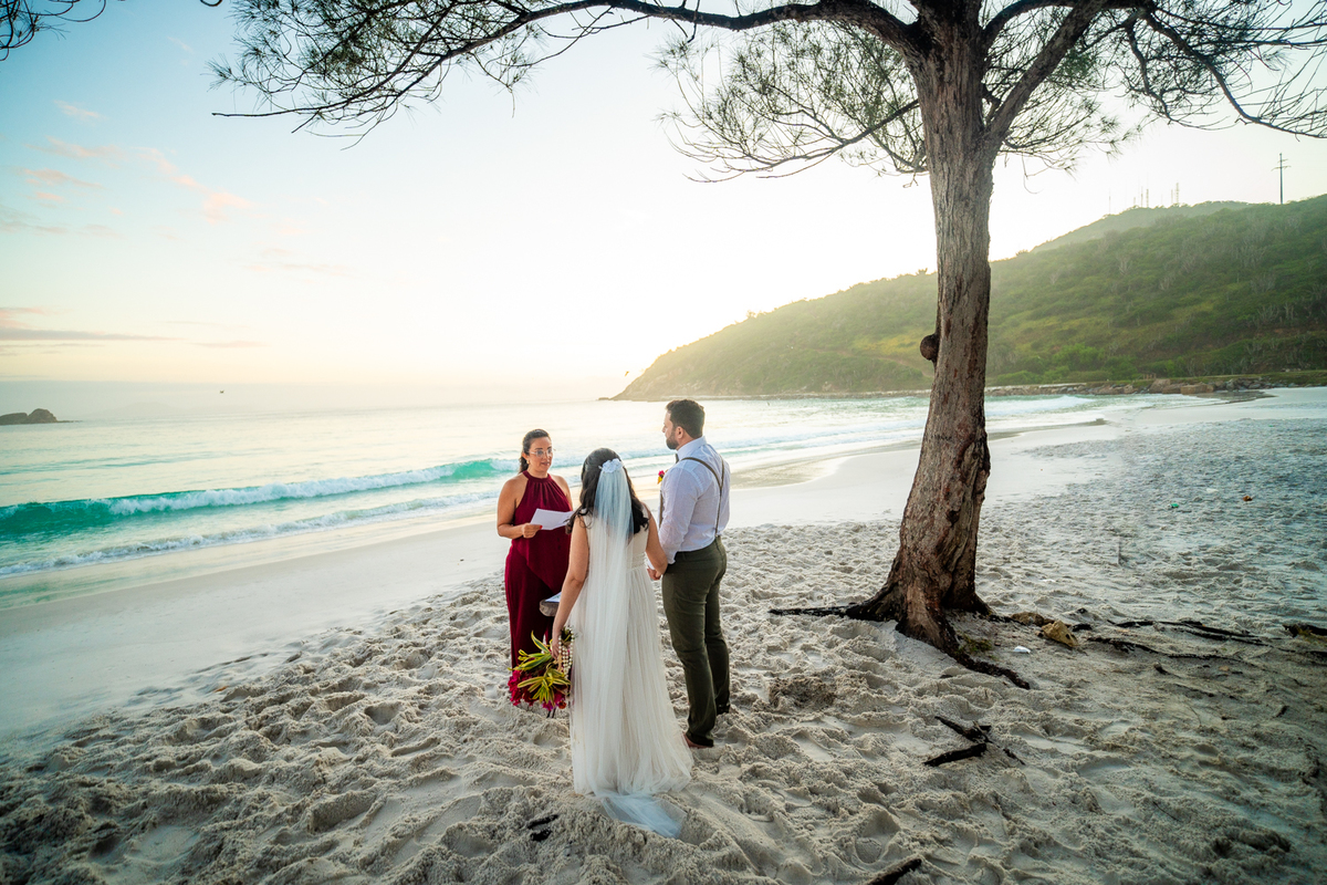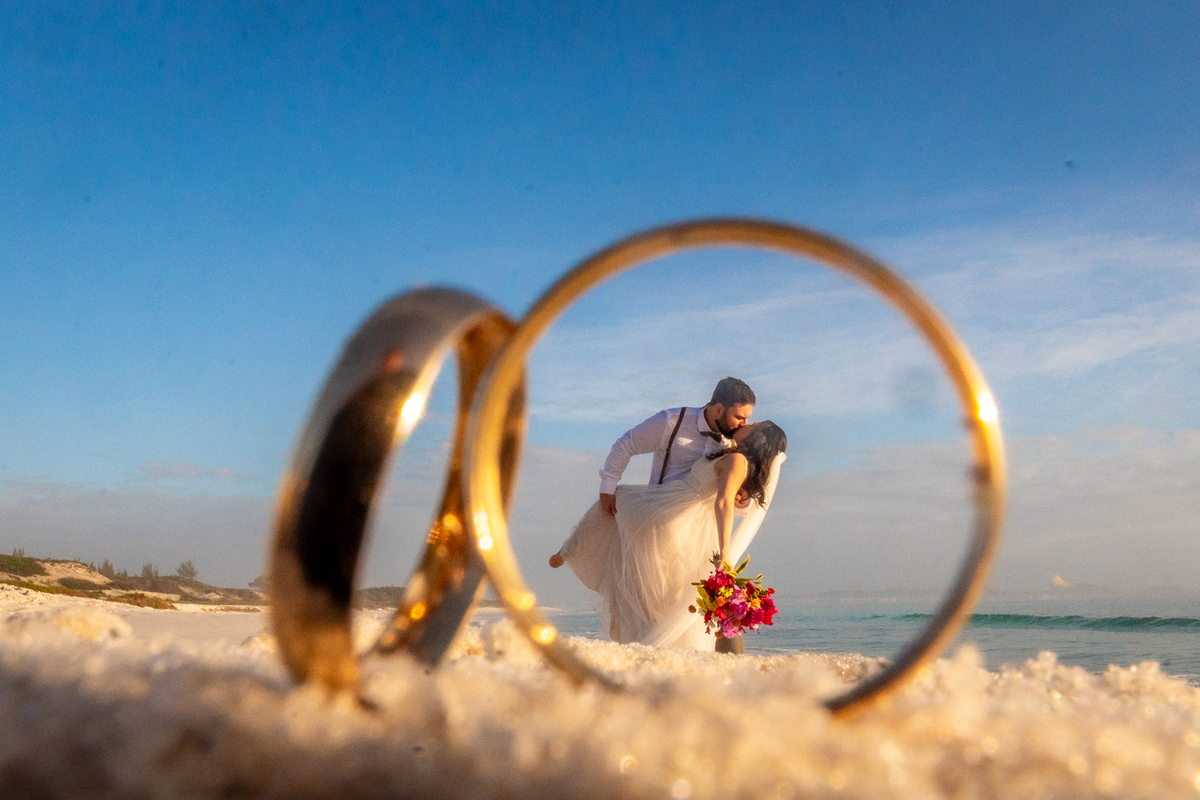 O casamento aconteceu na Prainha, em Arraial do Cabo, ao nascer do sol. Um cenário que traduz exatamente o que eles vivem hoje: calma, verdade e recomeço. A luz suave da manhã envolveu a cerimônia, enquanto o mar testemunhava uma história que não precisou correr — apenas esperar o tempo certo.