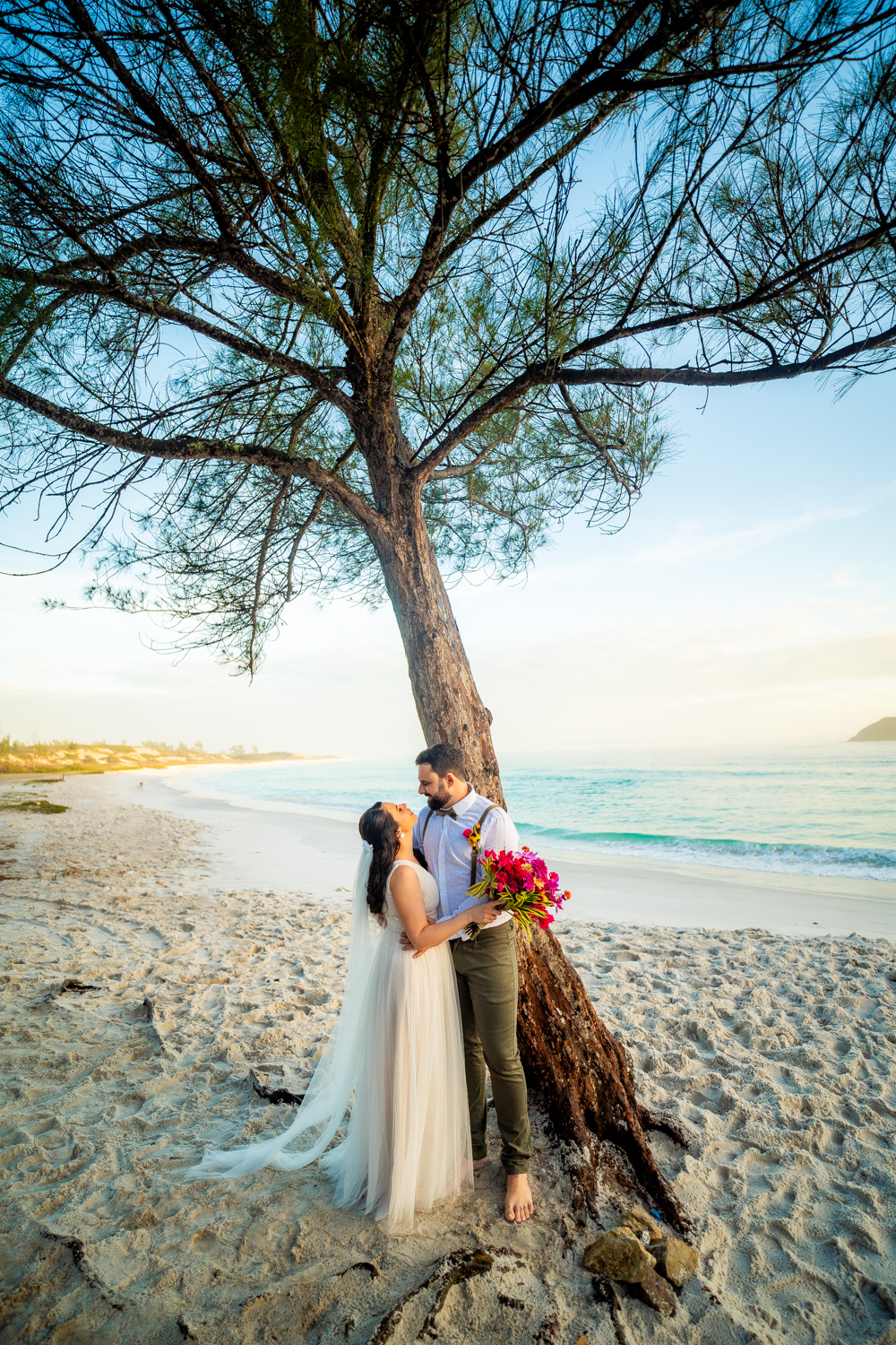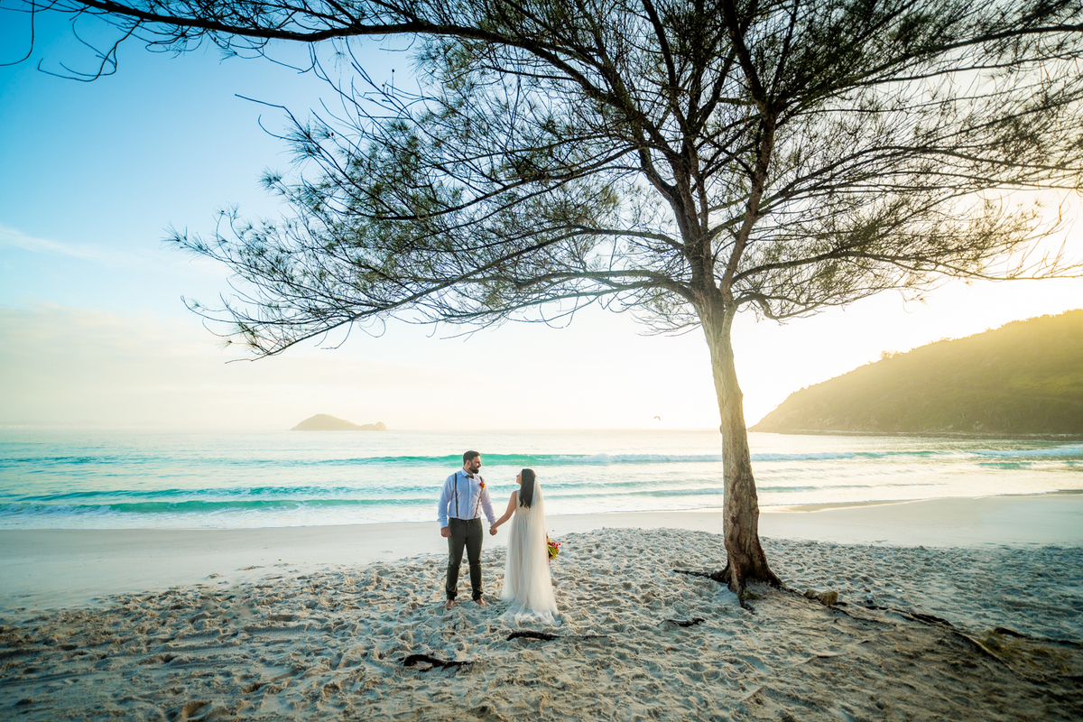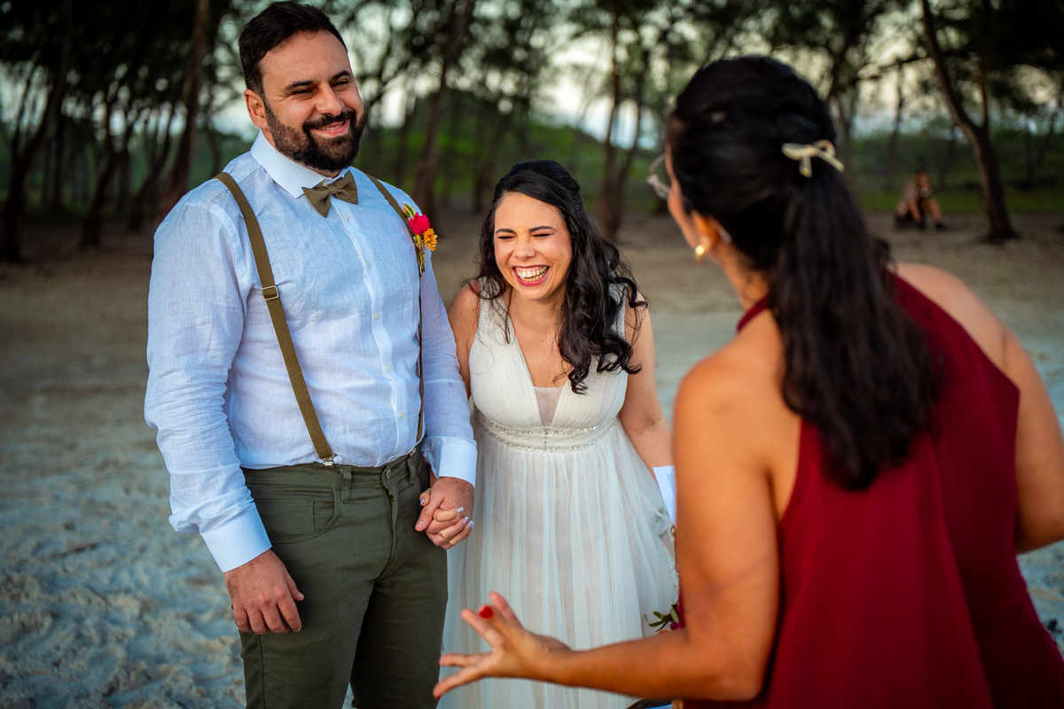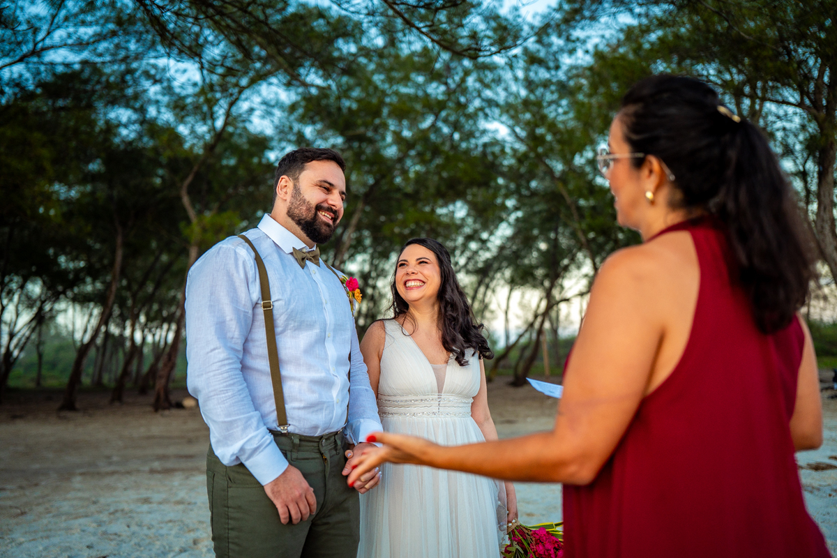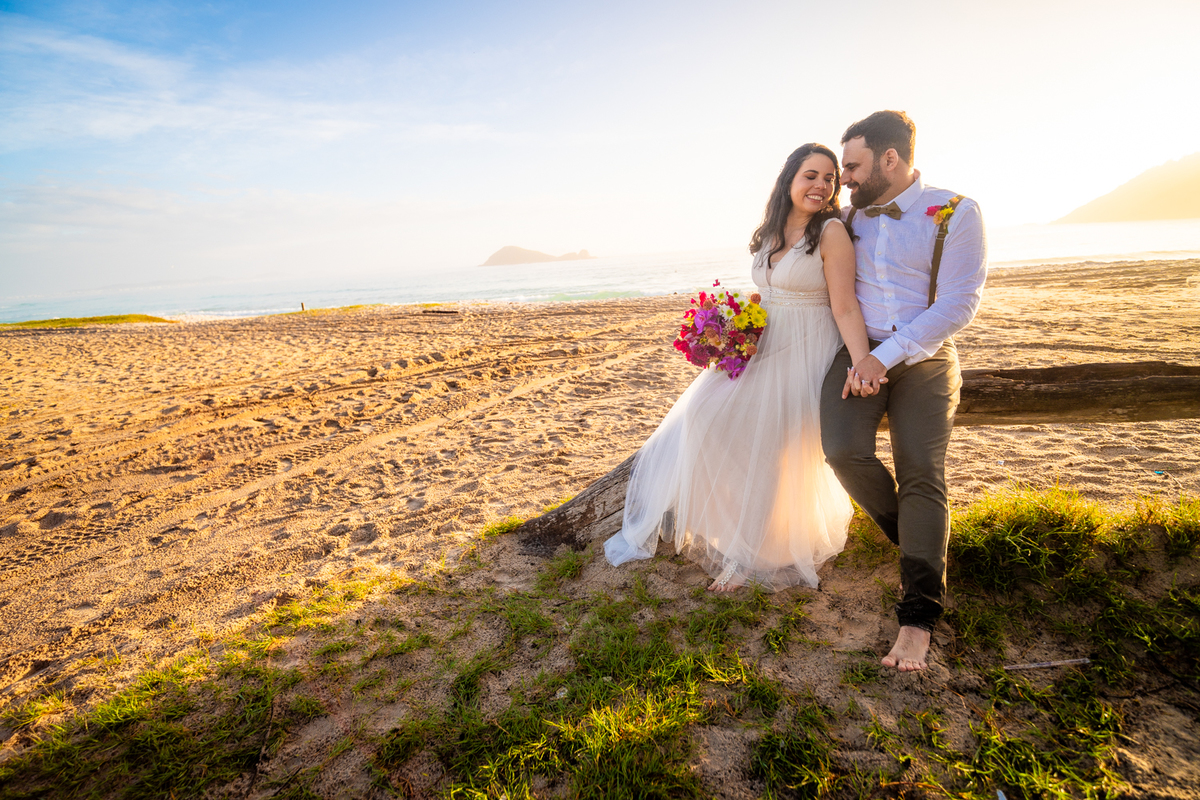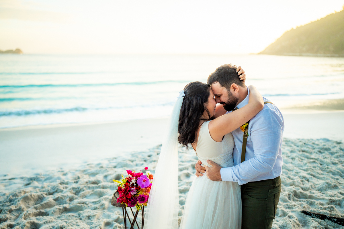 O casamento aconteceu na Prainha, em Arraial do Cabo, ao nascer do sol. Um cenário que traduz exatamente o que eles vivem hoje: calma, verdade e recomeço. A luz suave da manhã envolveu a cerimônia, enquanto o mar testemunhava uma história que não precisou correr — apenas esperar o tempo certo.