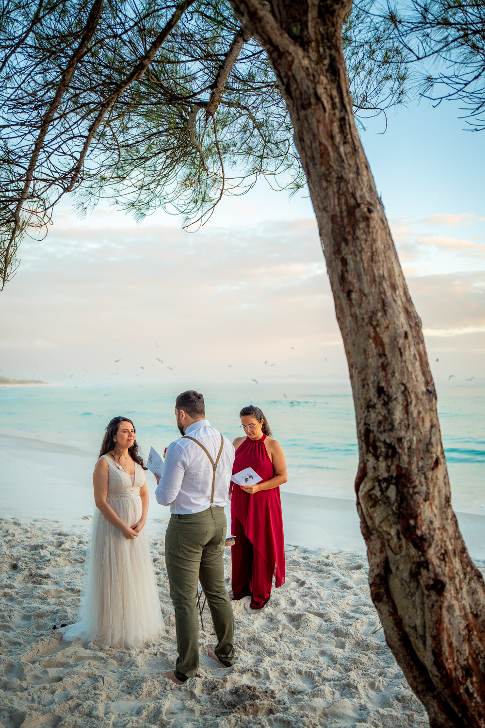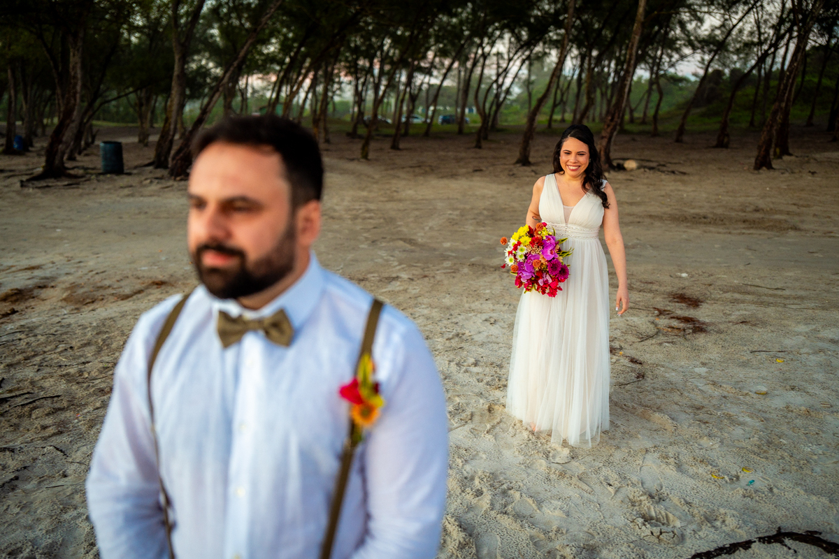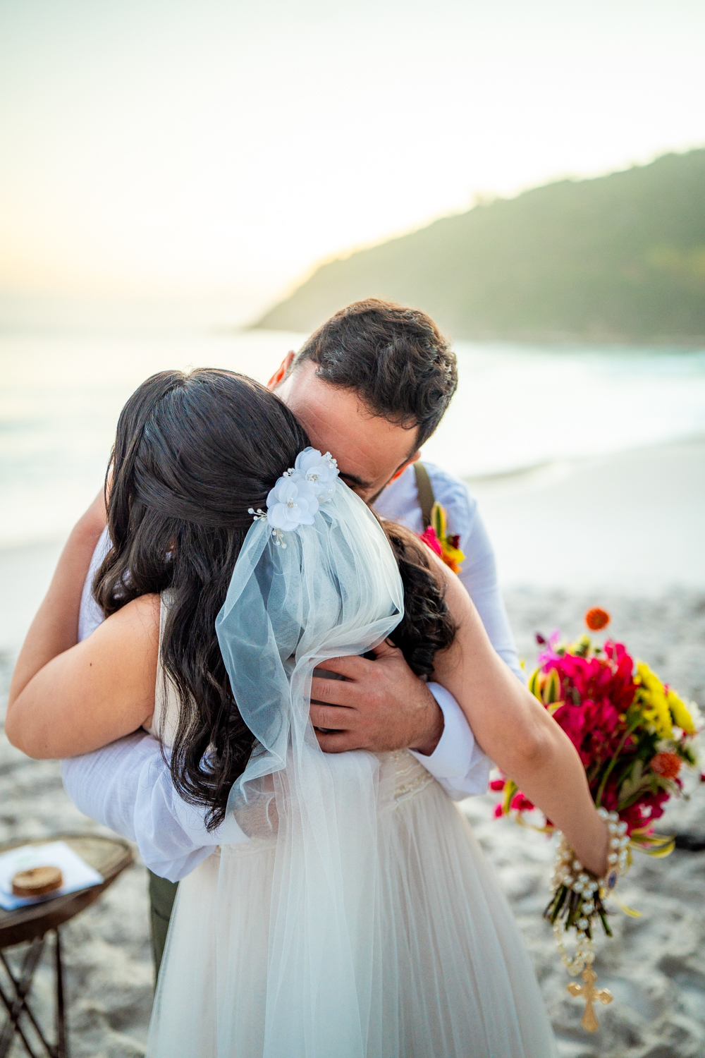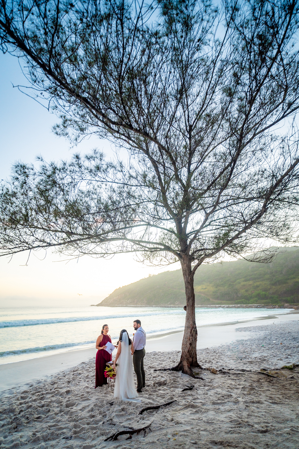 O casamento aconteceu na Prainha, em Arraial do Cabo, ao nascer do sol. Um cenário que traduz exatamente o que eles vivem hoje: calma, verdade e recomeço. A luz suave da manhã envolveu a cerimônia, enquanto o mar testemunhava uma história que não precisou correr — apenas esperar o tempo certo.