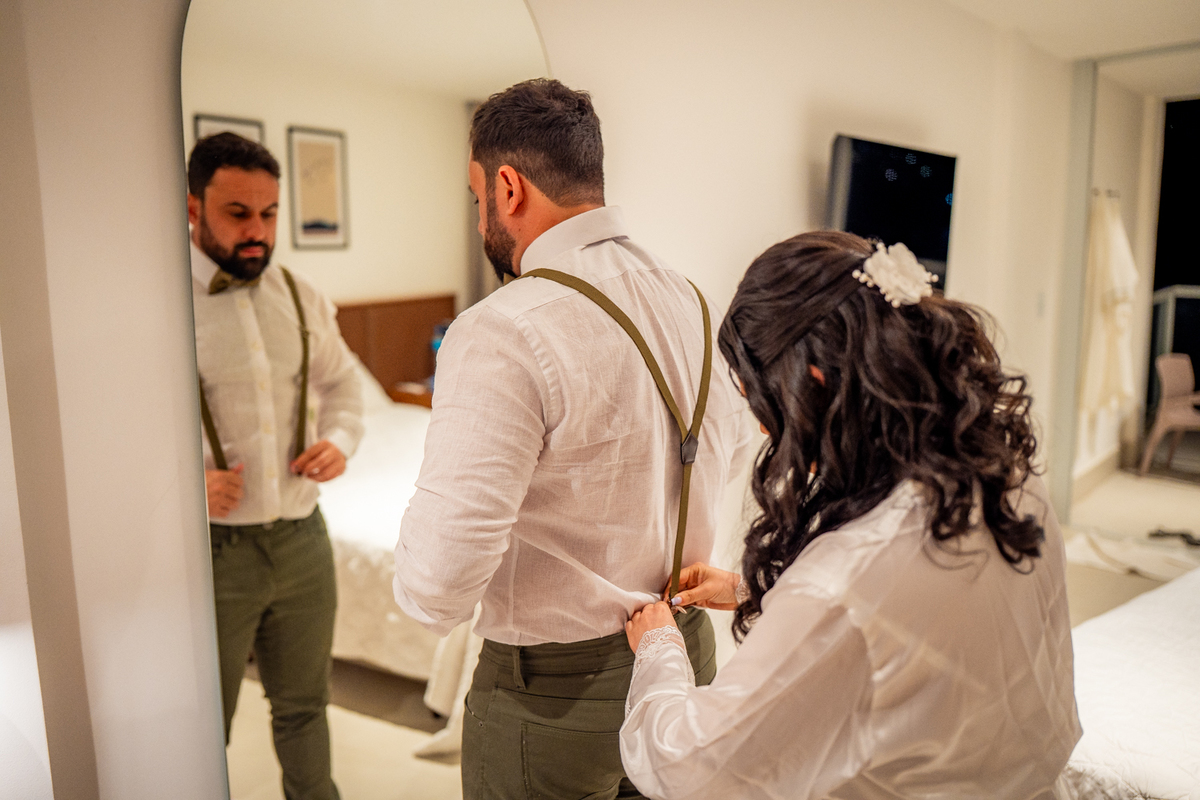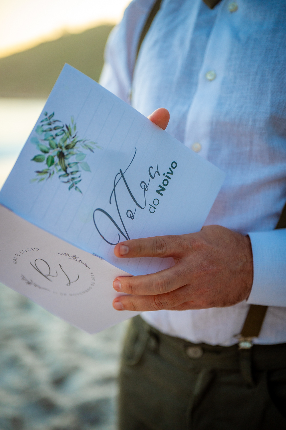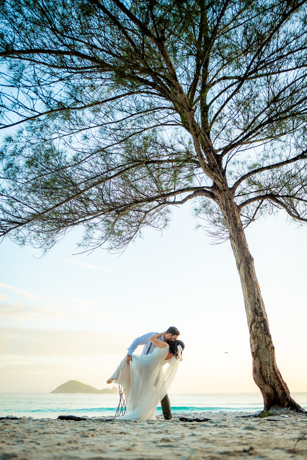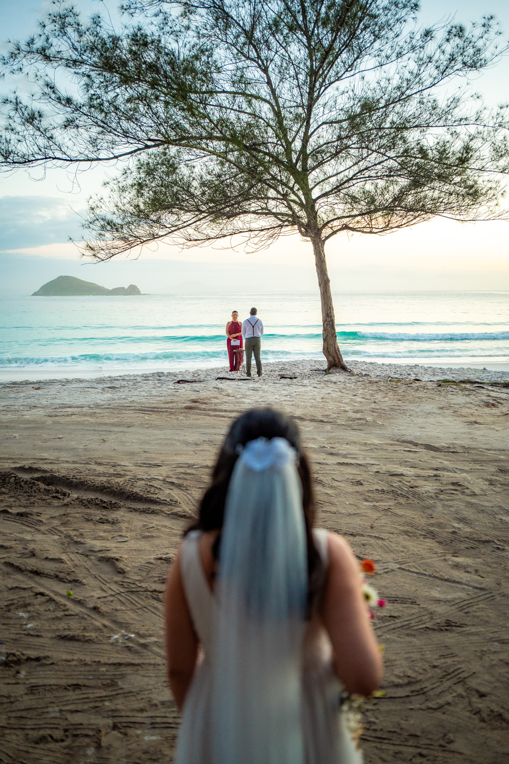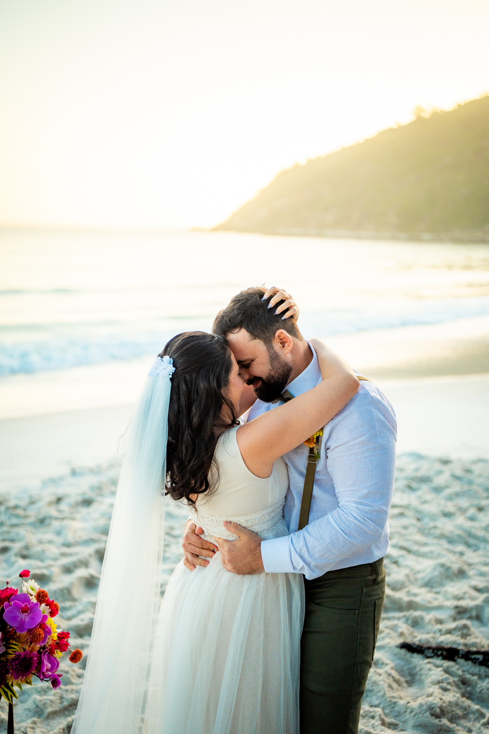 O casamento aconteceu na Prainha, em Arraial do Cabo, ao nascer do sol. Um cenário que traduz exatamente o que eles vivem hoje: calma, verdade e recomeço. A luz suave da manhã envolveu a cerimônia, enquanto o mar testemunhava uma história que não precisou correr — apenas esperar o tempo certo.