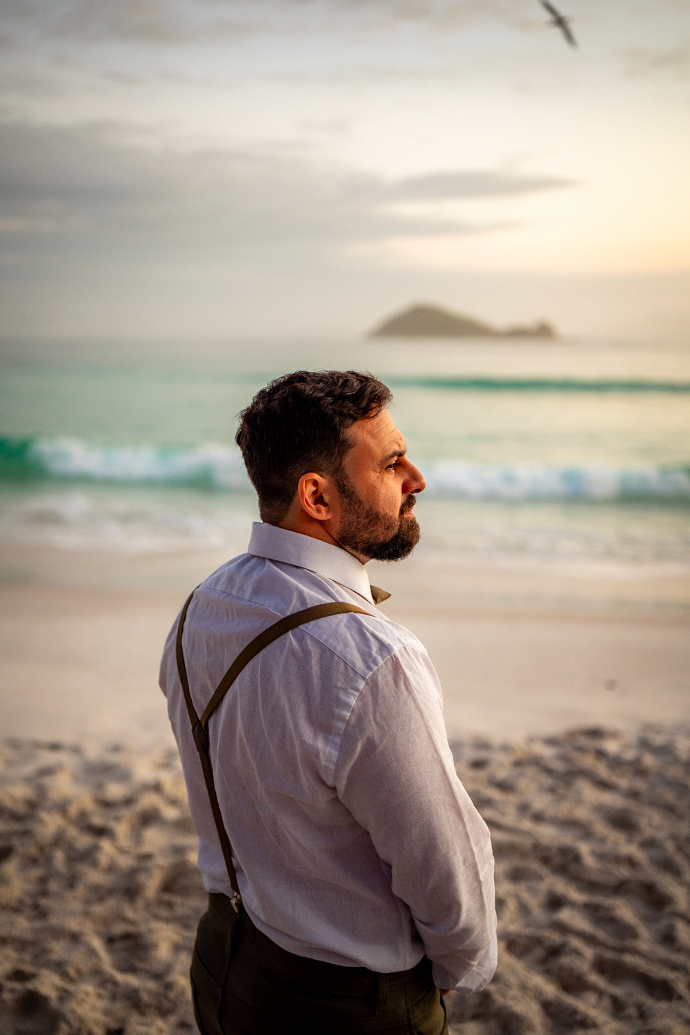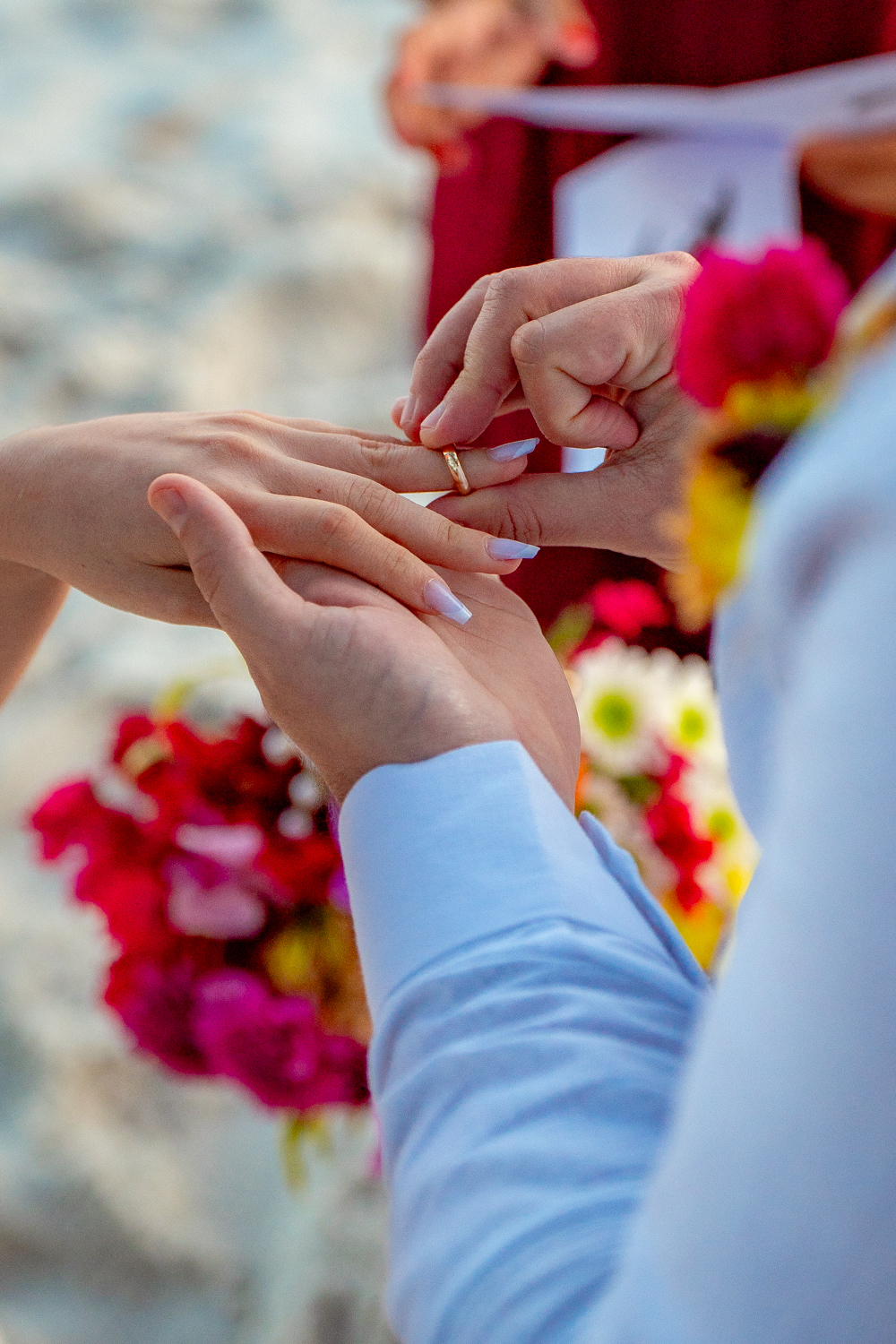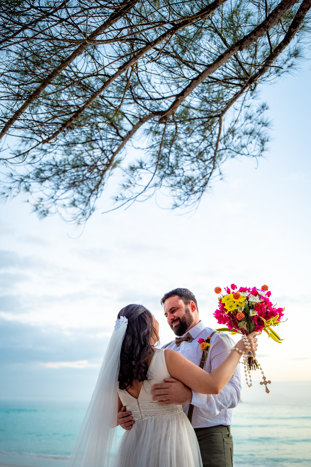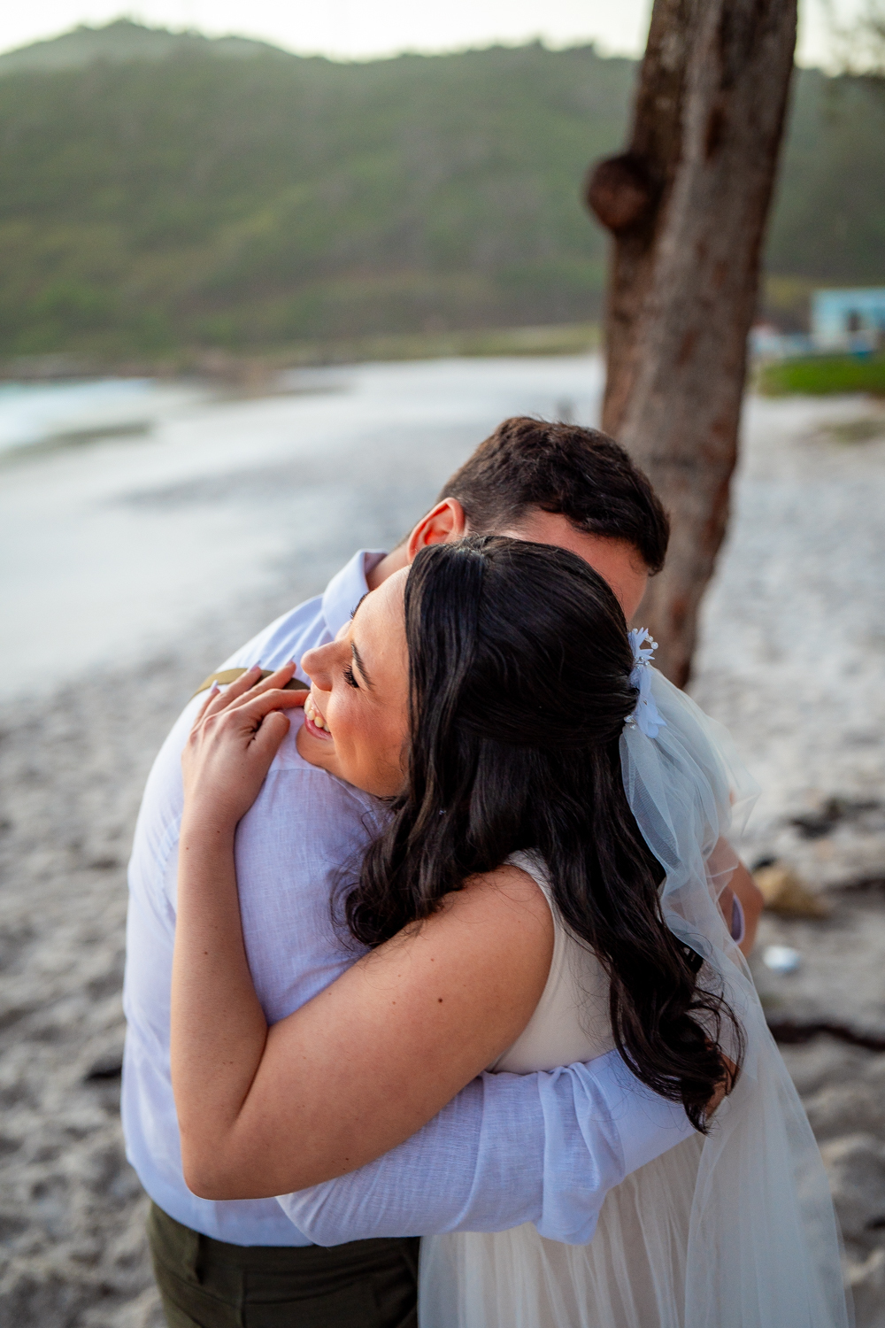 O casamento aconteceu na Prainha, em Arraial do Cabo, ao nascer do sol. Um cenário que traduz exatamente o que eles vivem hoje: calma, verdade e recomeço. A luz suave da manhã envolveu a cerimônia, enquanto o mar testemunhava uma história que não precisou correr — apenas esperar o tempo certo.