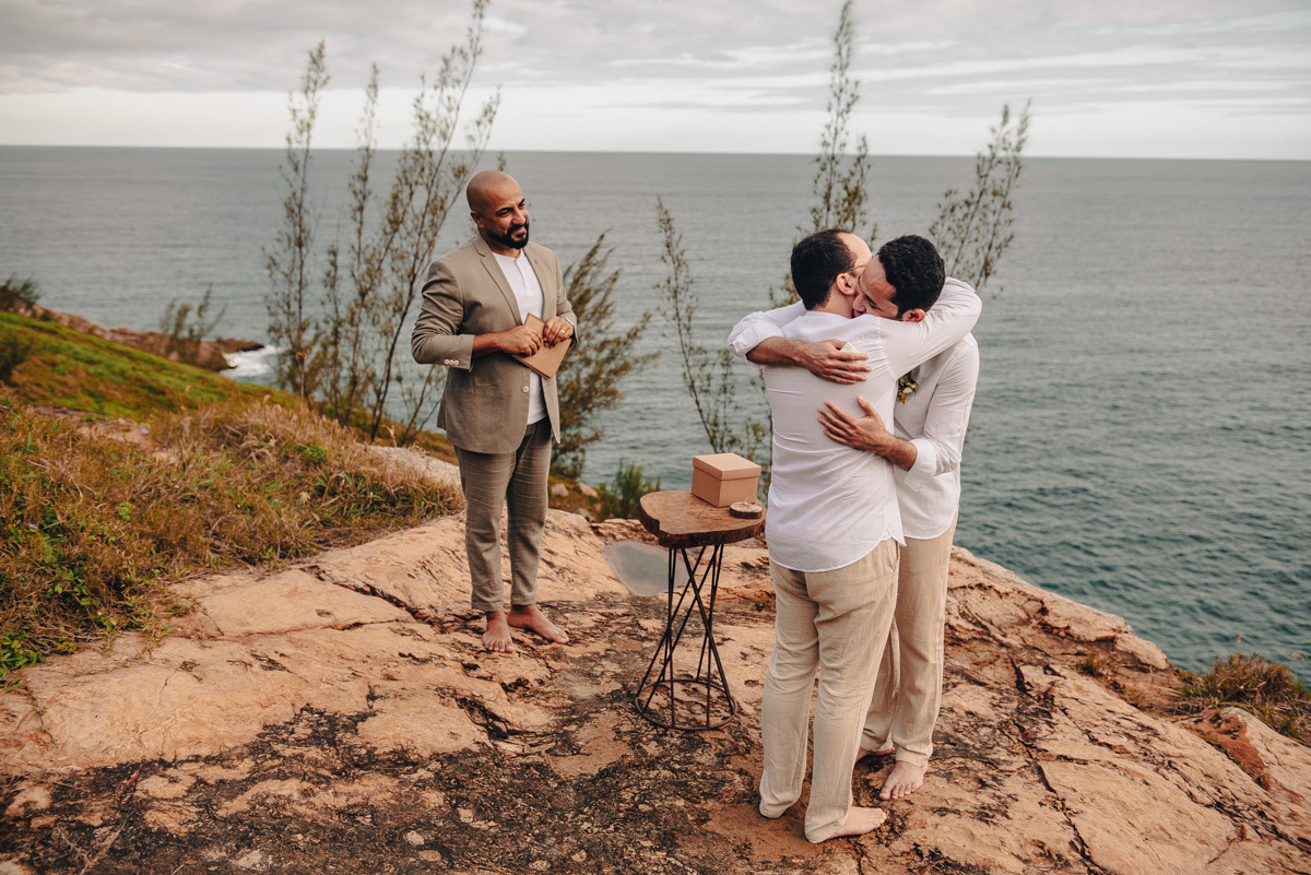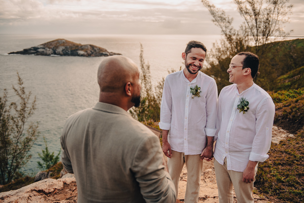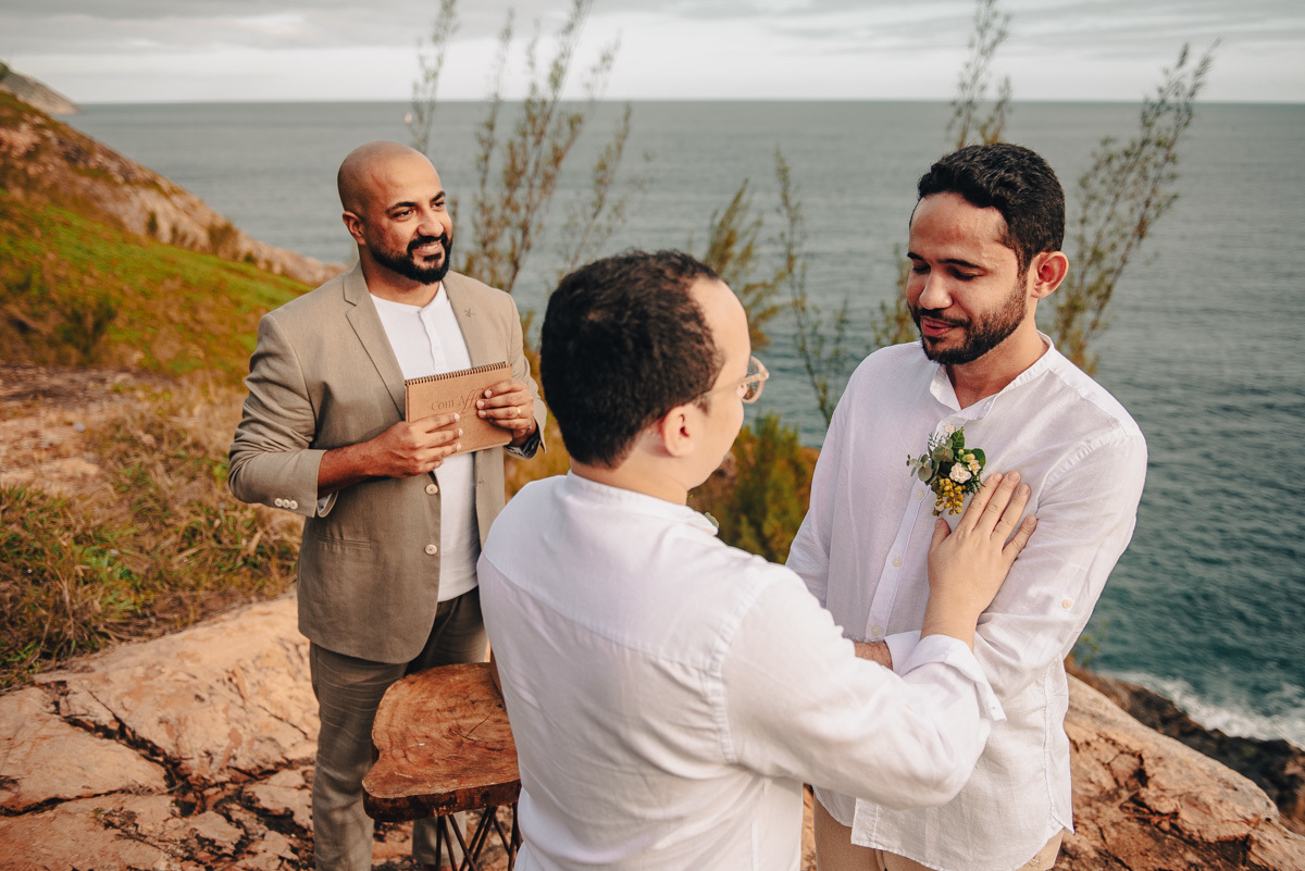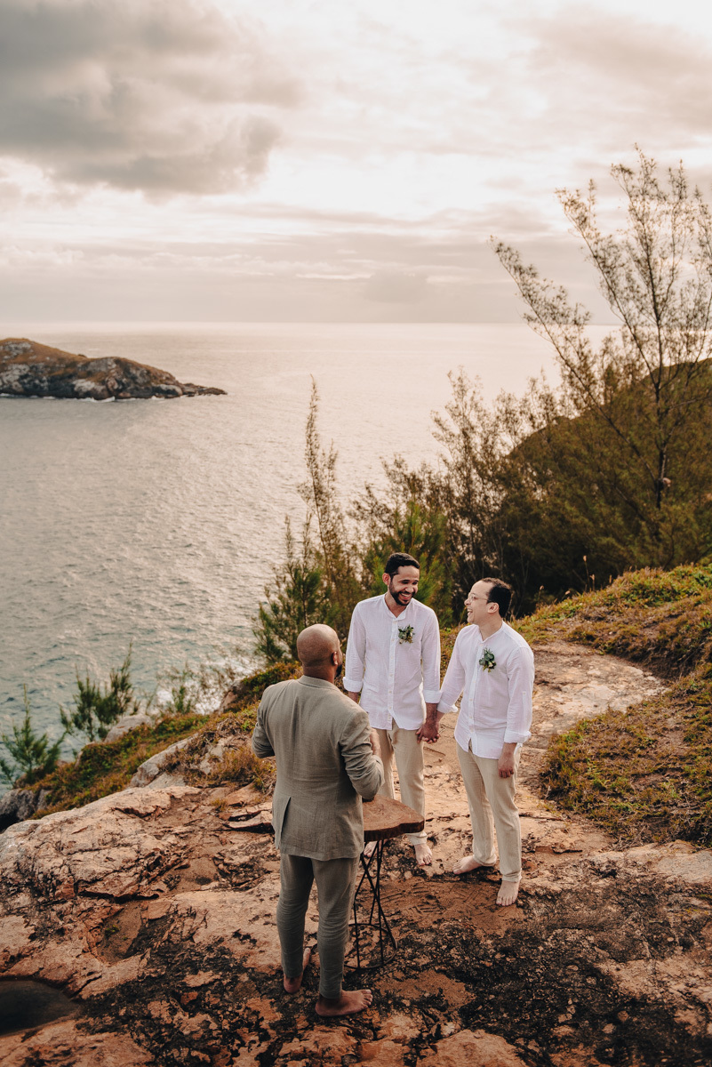 O “sim” aconteceu em uma tarde clara em um dos mirantes do Pontal do Atalaia, em Arraial do Cabo. O cenário aberto, o vento leve e a vista imensa emolduraram uma cerimônia simples, mas profundamente emocionante. Um amor tranquilo, seguro, que não precisa de grandes gestos para ser sentido.
