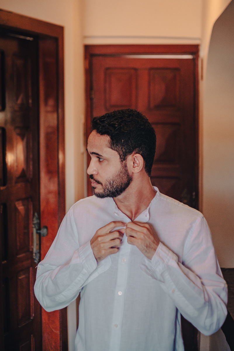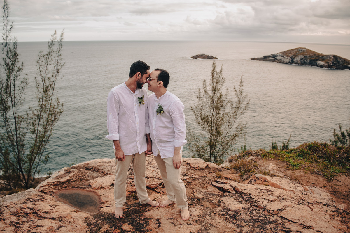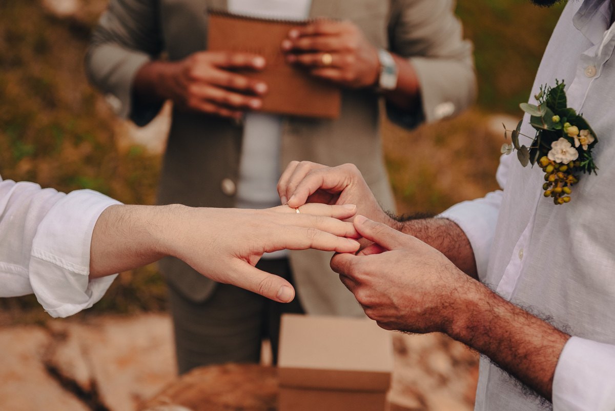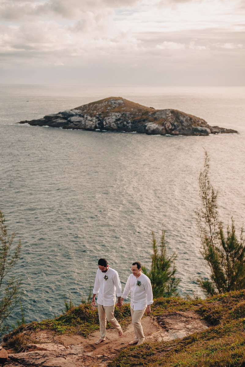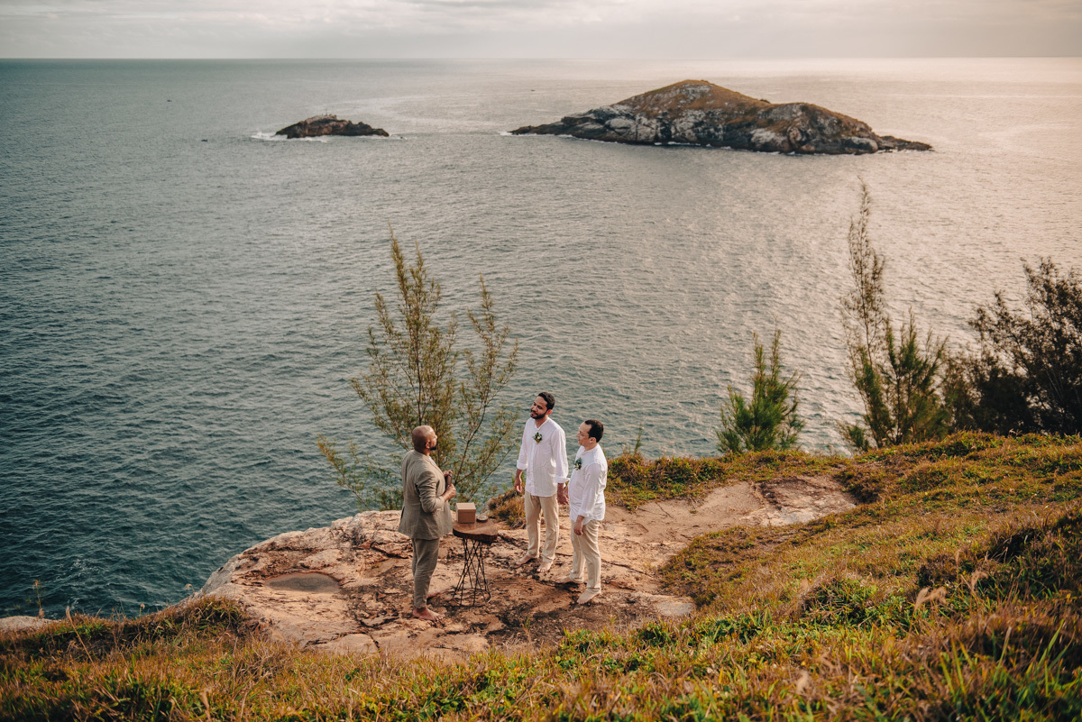 O “sim” aconteceu em uma tarde clara em um dos mirantes do Pontal do Atalaia, em Arraial do Cabo. O cenário aberto, o vento leve e a vista imensa emolduraram uma cerimônia simples, mas profundamente emocionante. Um amor tranquilo, seguro, que não precisa de grandes gestos para ser sentido.