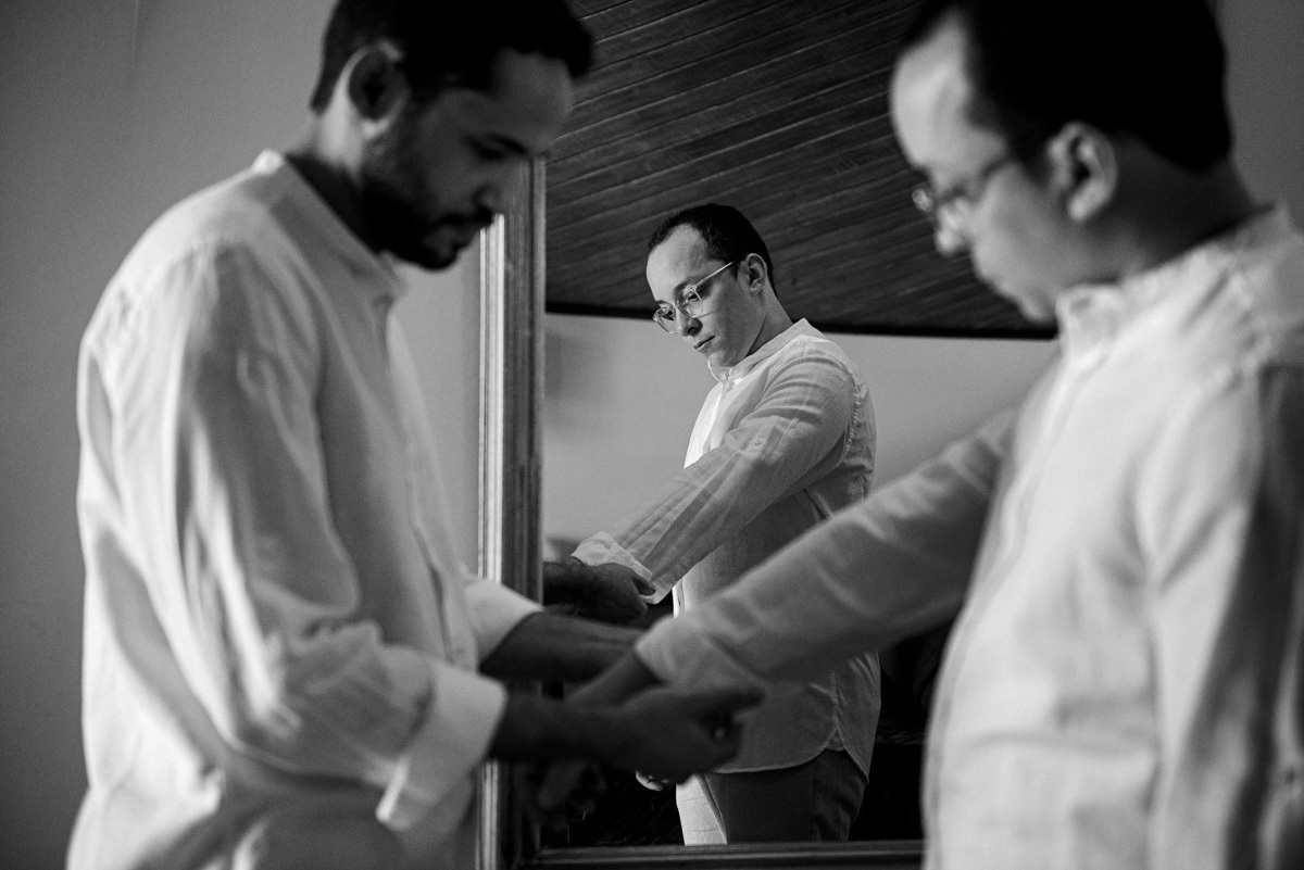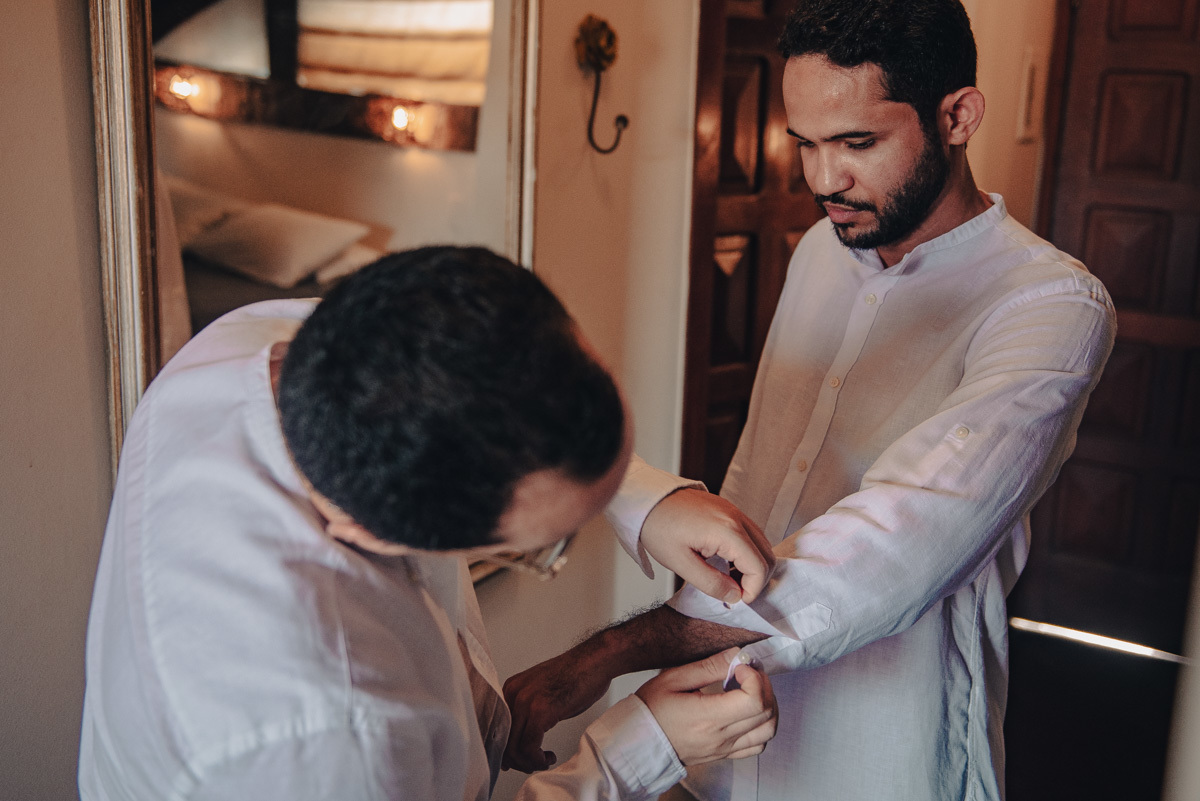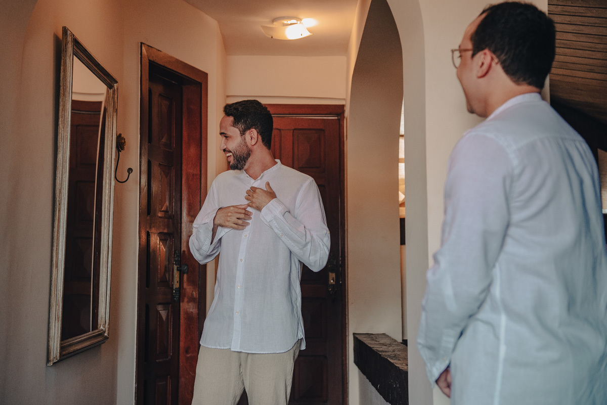 O making off foi compartilhado. Entre ajustes finais, taças de vinho e risadas discretas, eles se ajudaram, se olharam e dividiram o momento como quem já sabe caminhar junto. Não houve separação, não houve espera solitária. Eles entraram juntos na cerimônia, reafirmando, em silêncio, que o caminho é lado a lado.