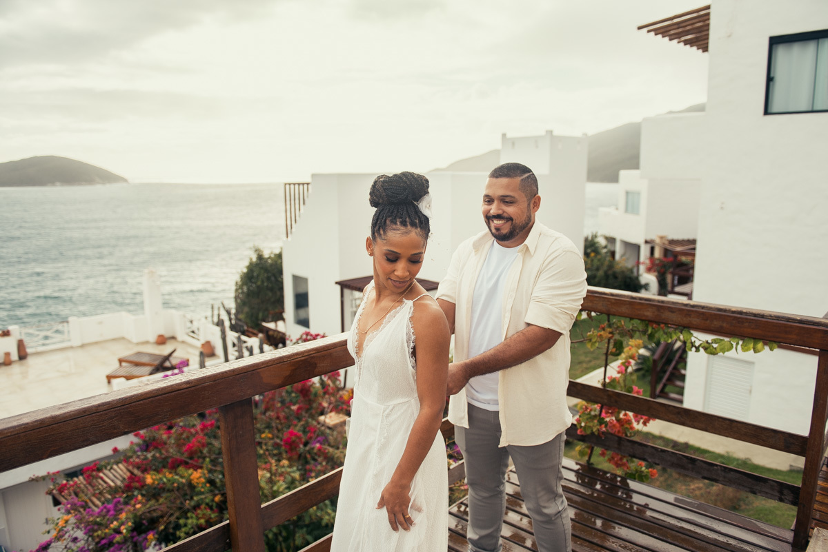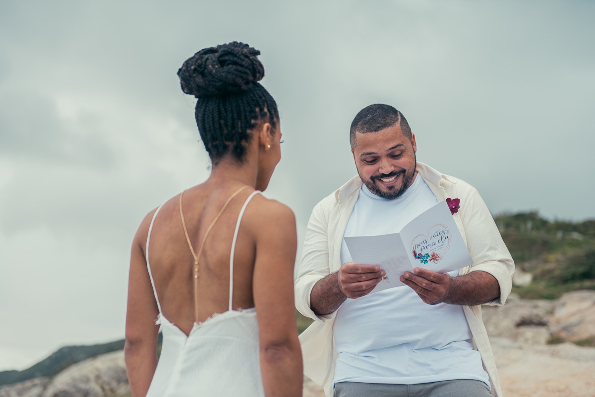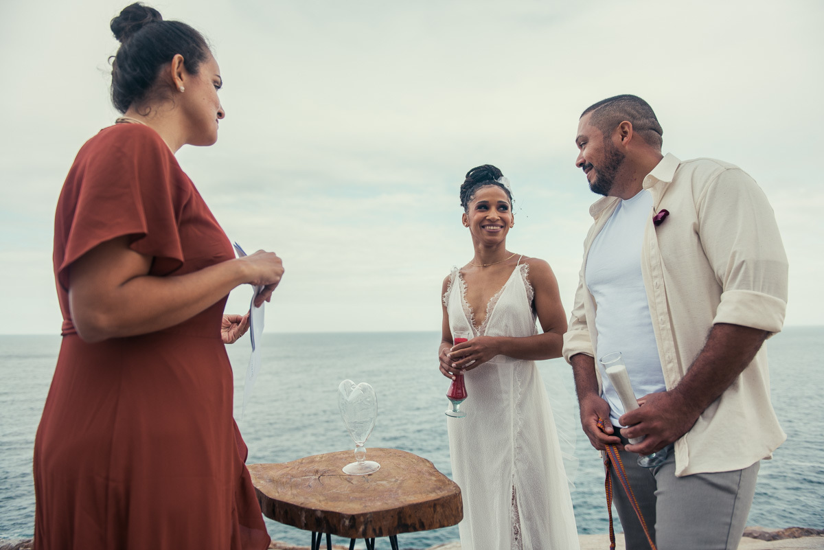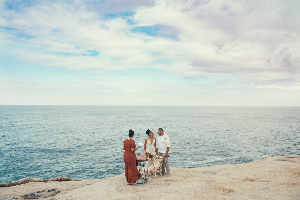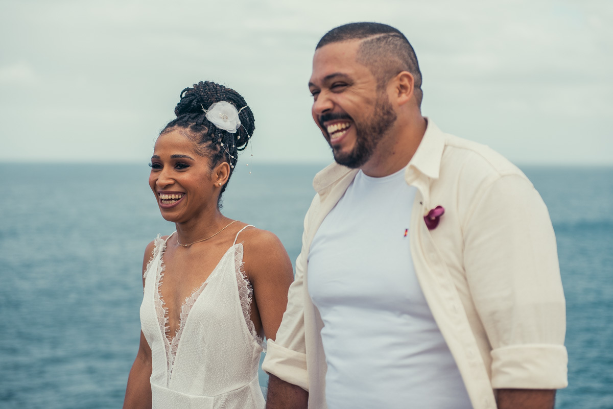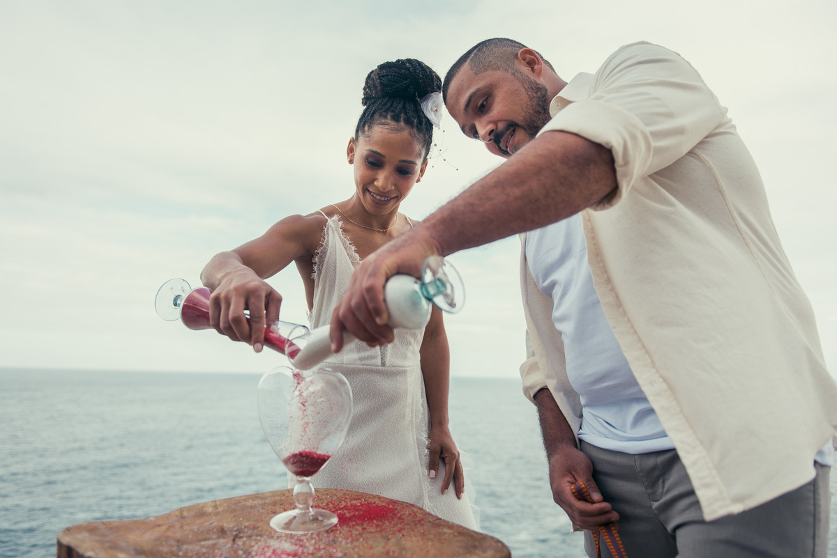 Em Arraial, de frente para o mar, Amanda e Ronaldo escolheram um cenário simples e impactante para celebrar o casamento. O céu estava levemente nublado, criando uma atmosfera suave que deixou tudo ainda mais singular.