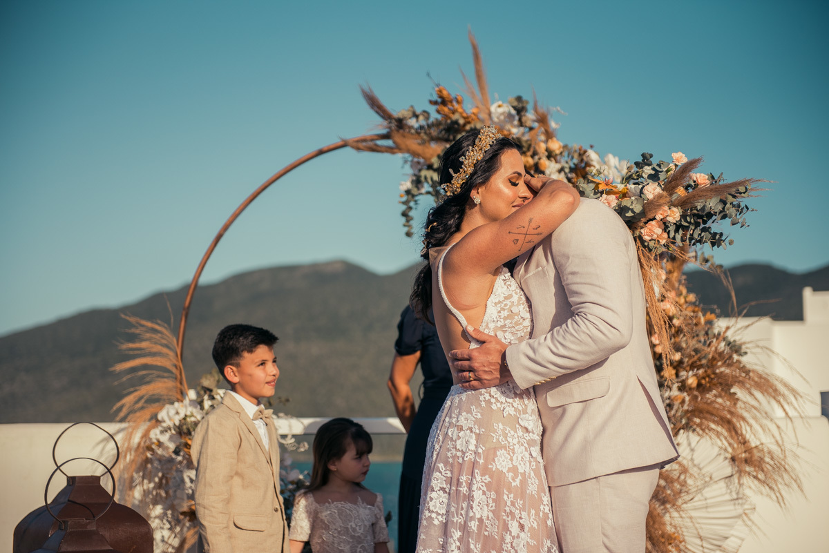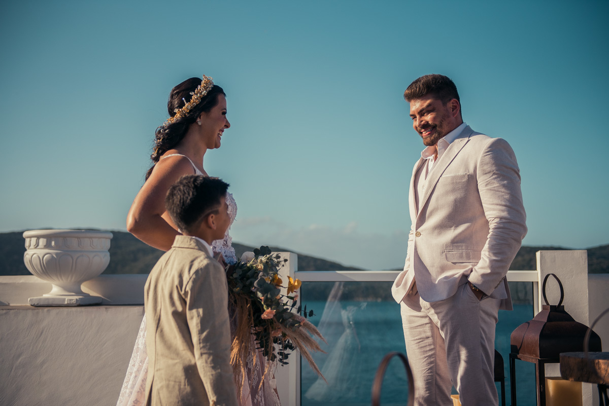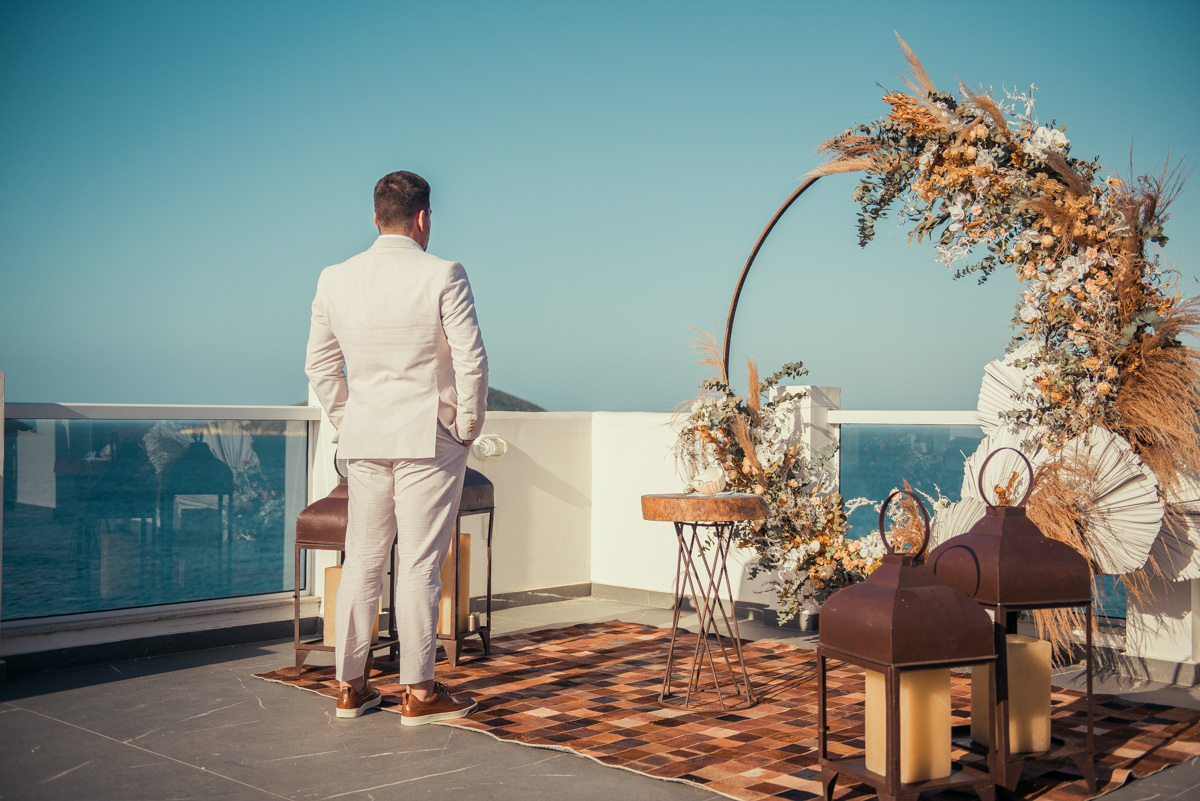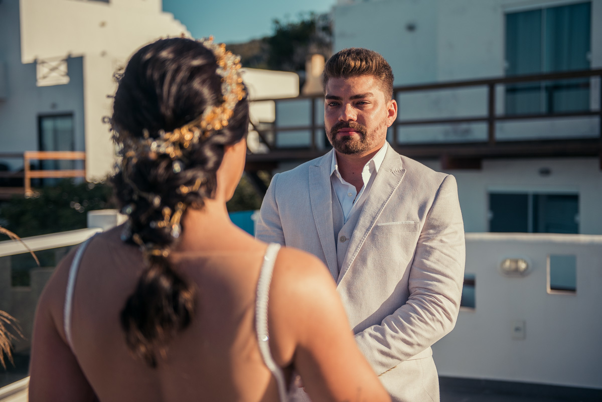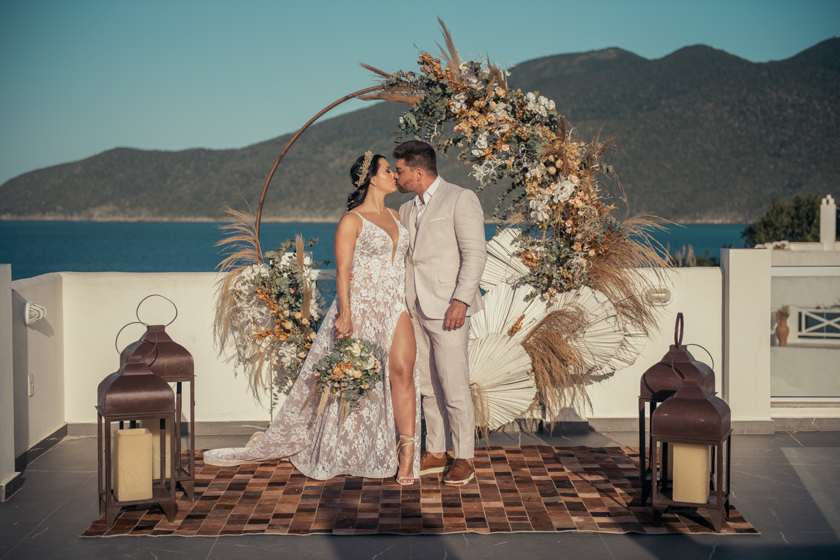 Nas casas gregas de Arraial, com o branco contrastando com o azul do céu e o mar ao fundo, Ana e Luis escolheram um cenário luminoso para celebrar o casamento. O dia estava aberto, de sol intenso, destacando ainda mais a beleza marcante dos dois — daqueles casais que parecem ter saído de um editorial.