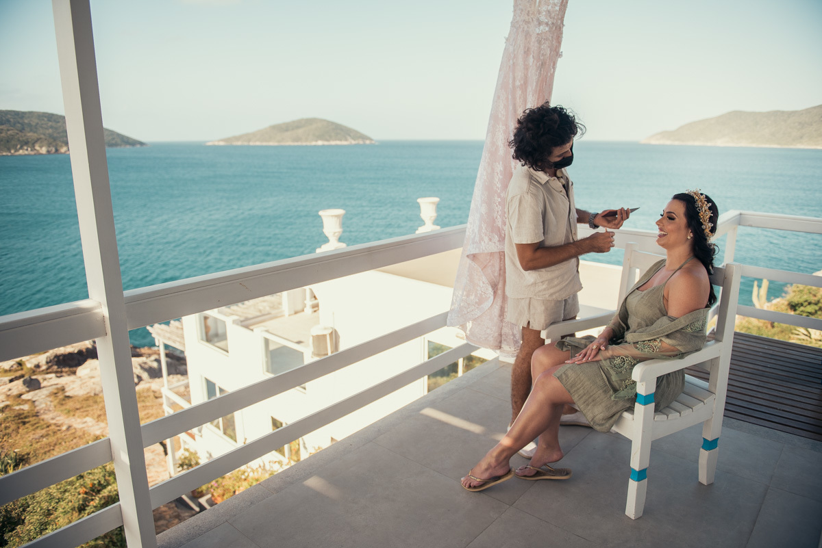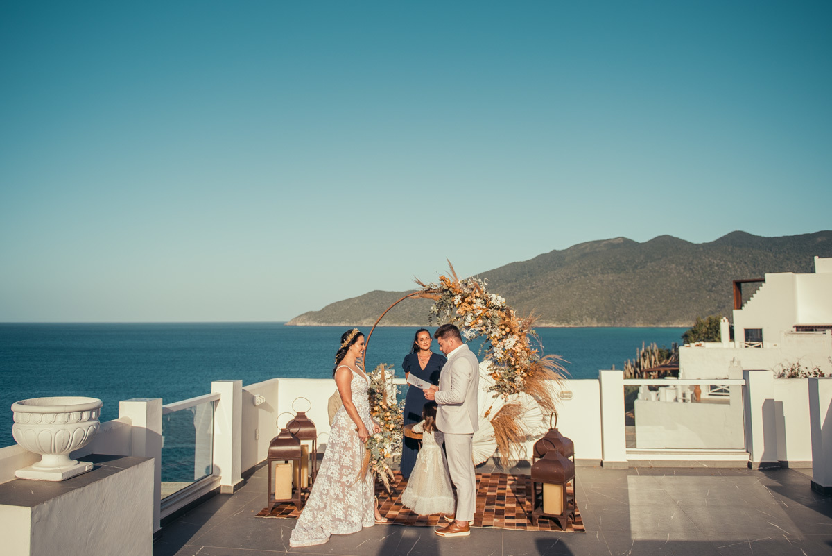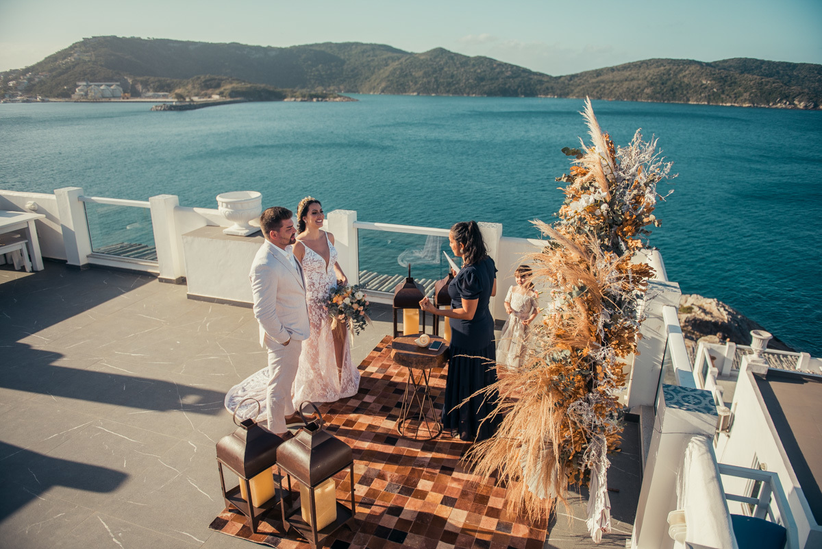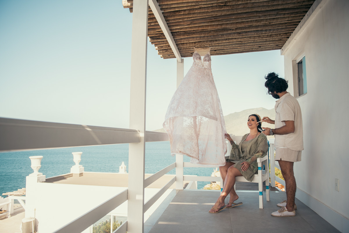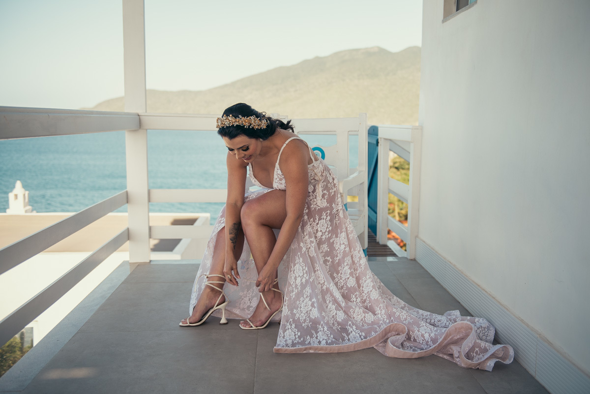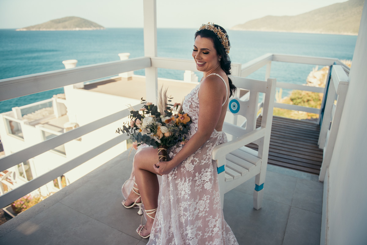 Nas casas gregas de Arraial, com o branco contrastando com o azul do céu e o mar ao fundo, Ana e Luis escolheram um cenário luminoso para celebrar o casamento. O dia estava aberto, de sol intenso, destacando ainda mais a beleza marcante dos dois — daqueles casais que parecem ter saído de um editorial.