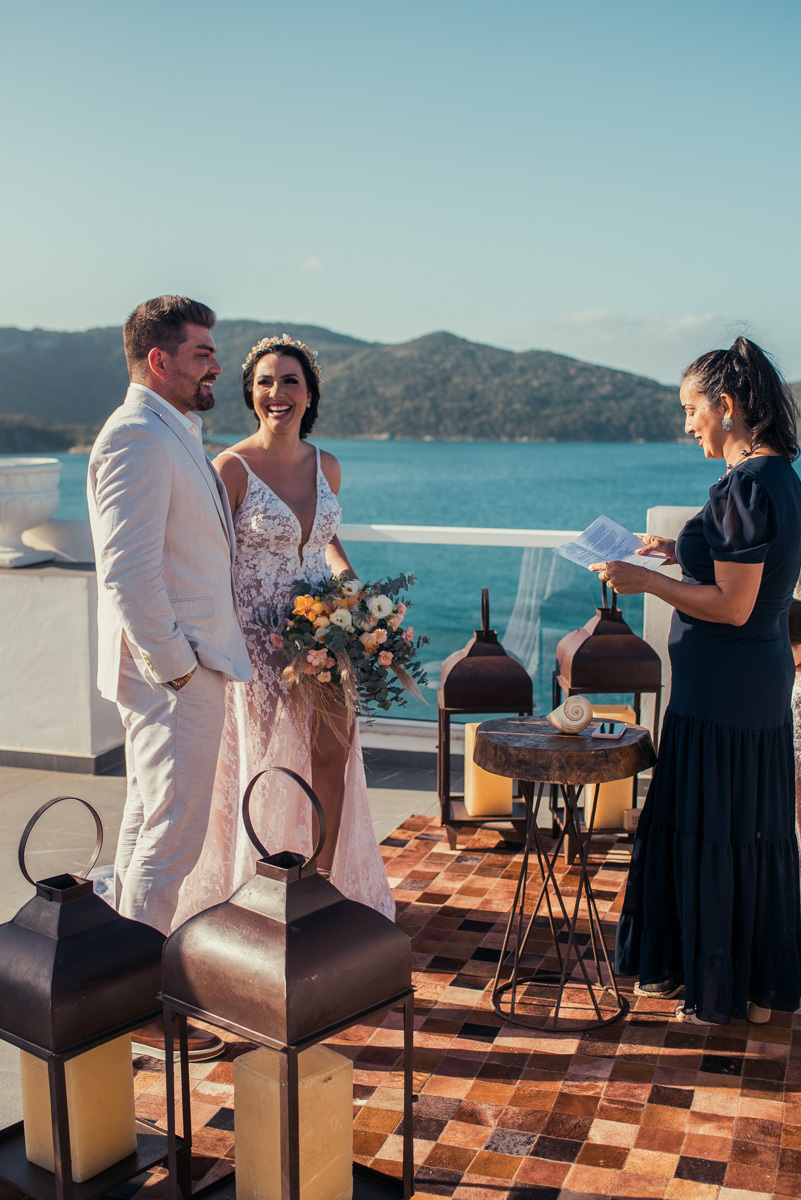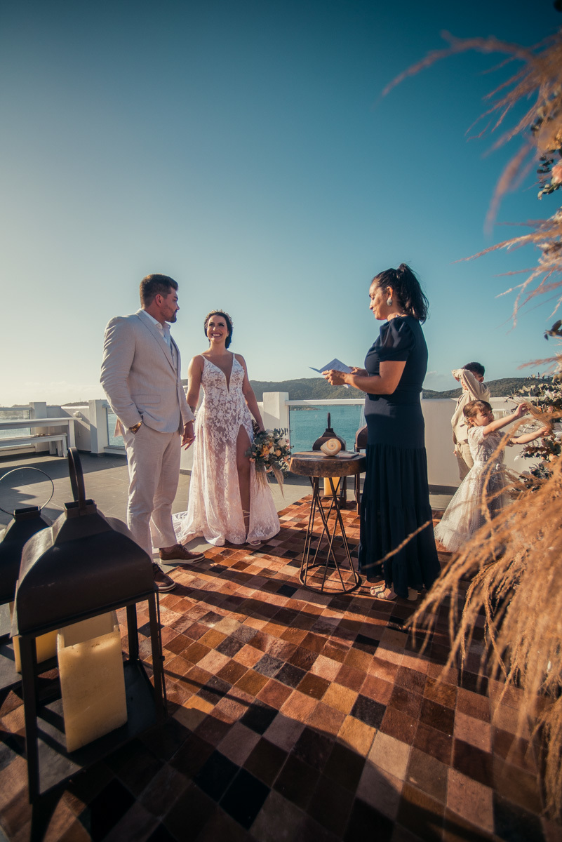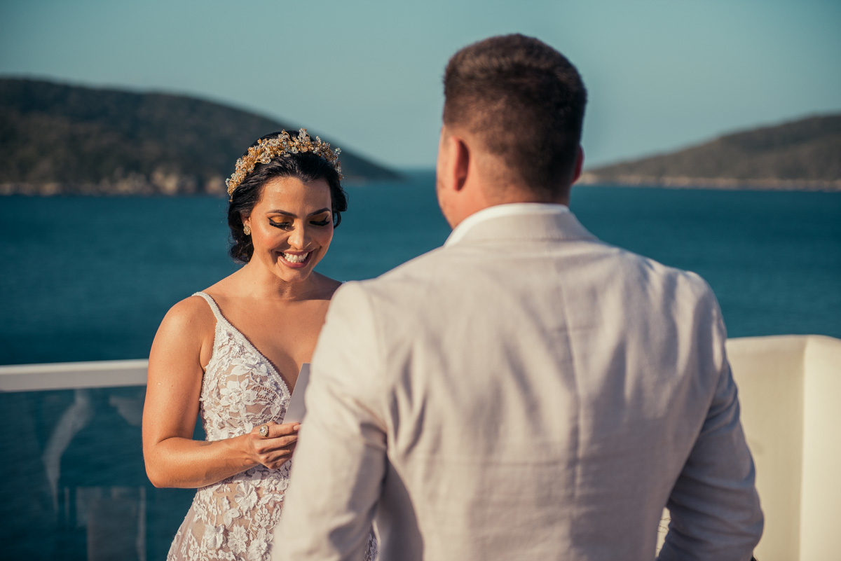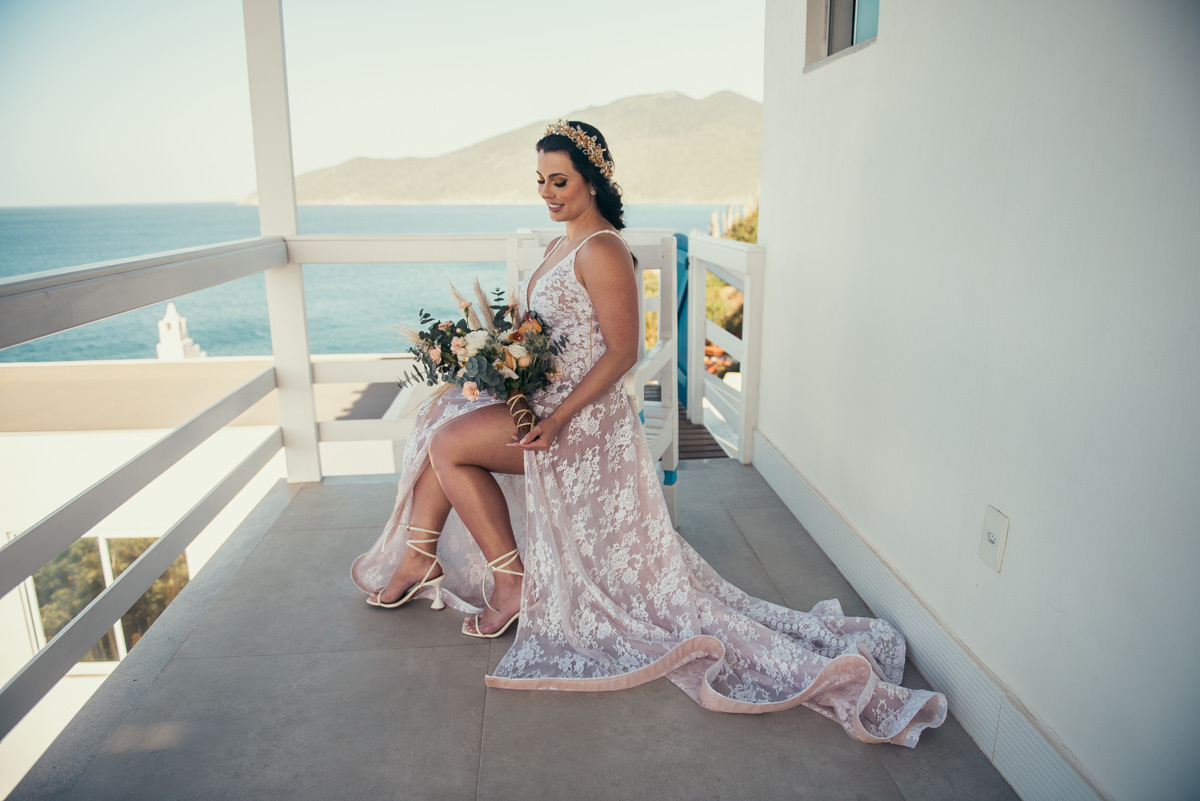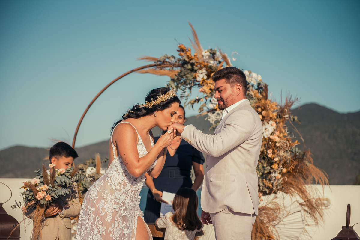 Nas casas gregas de Arraial, com o branco contrastando com o azul do céu e o mar ao fundo, Ana e Luis escolheram um cenário luminoso para celebrar o casamento. O dia estava aberto, de sol intenso, destacando ainda mais a beleza marcante dos dois — daqueles casais que parecem ter saído de um editorial.