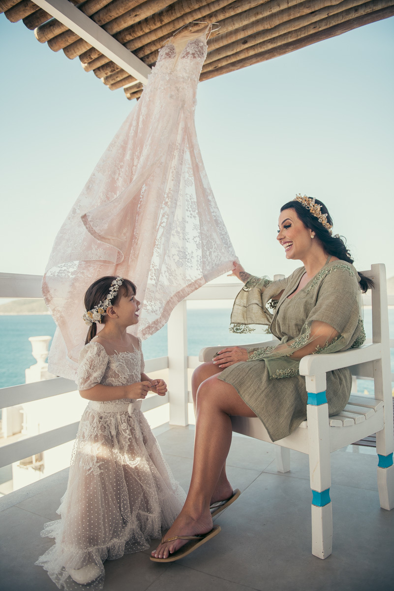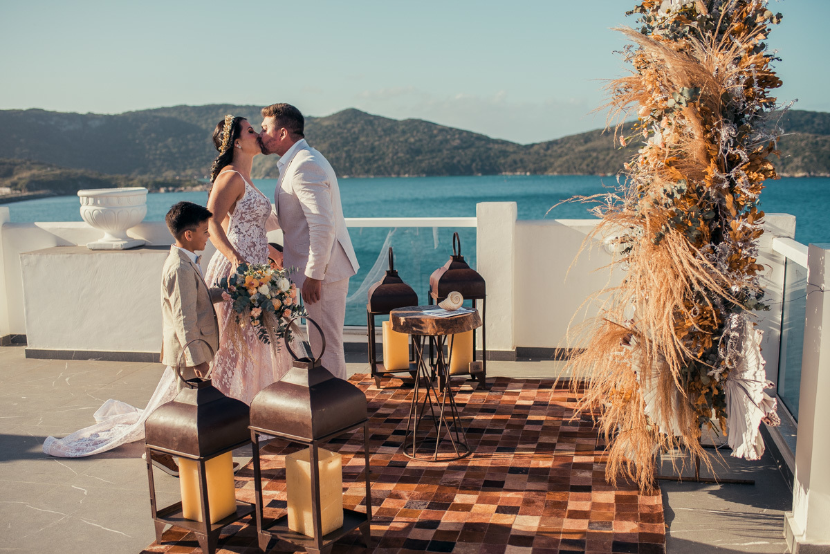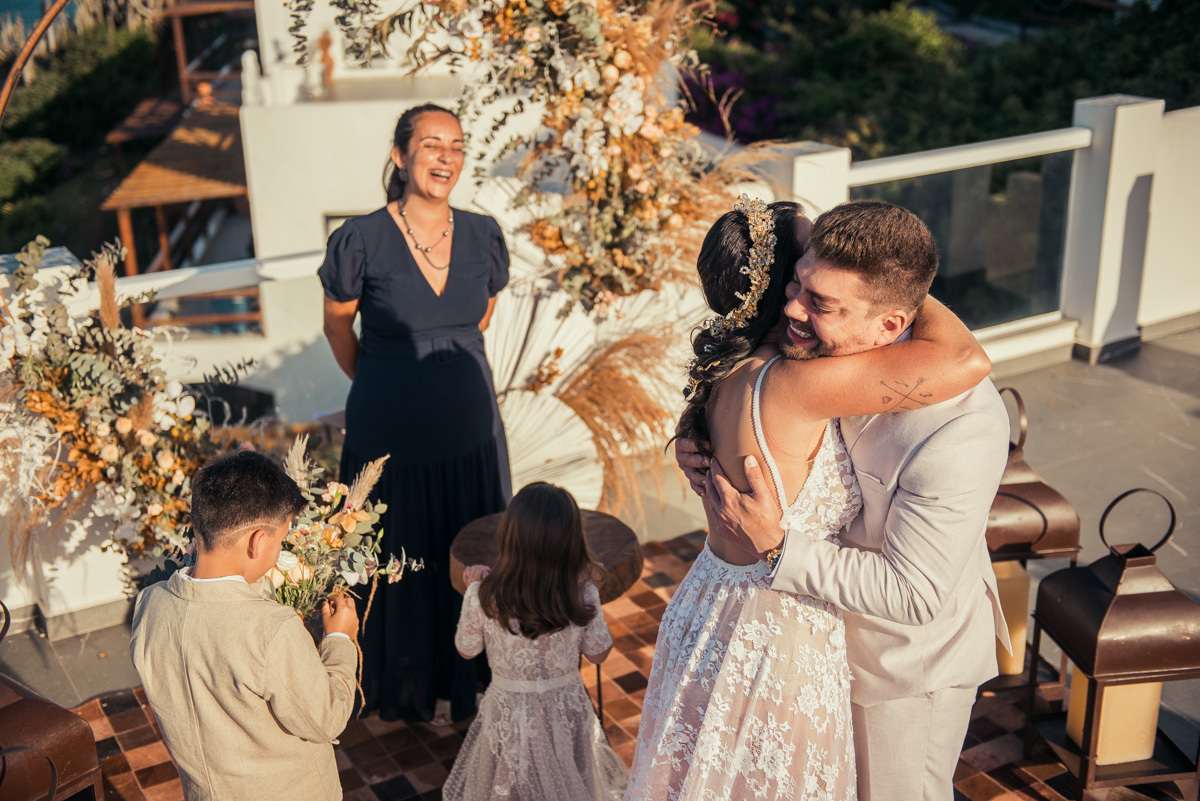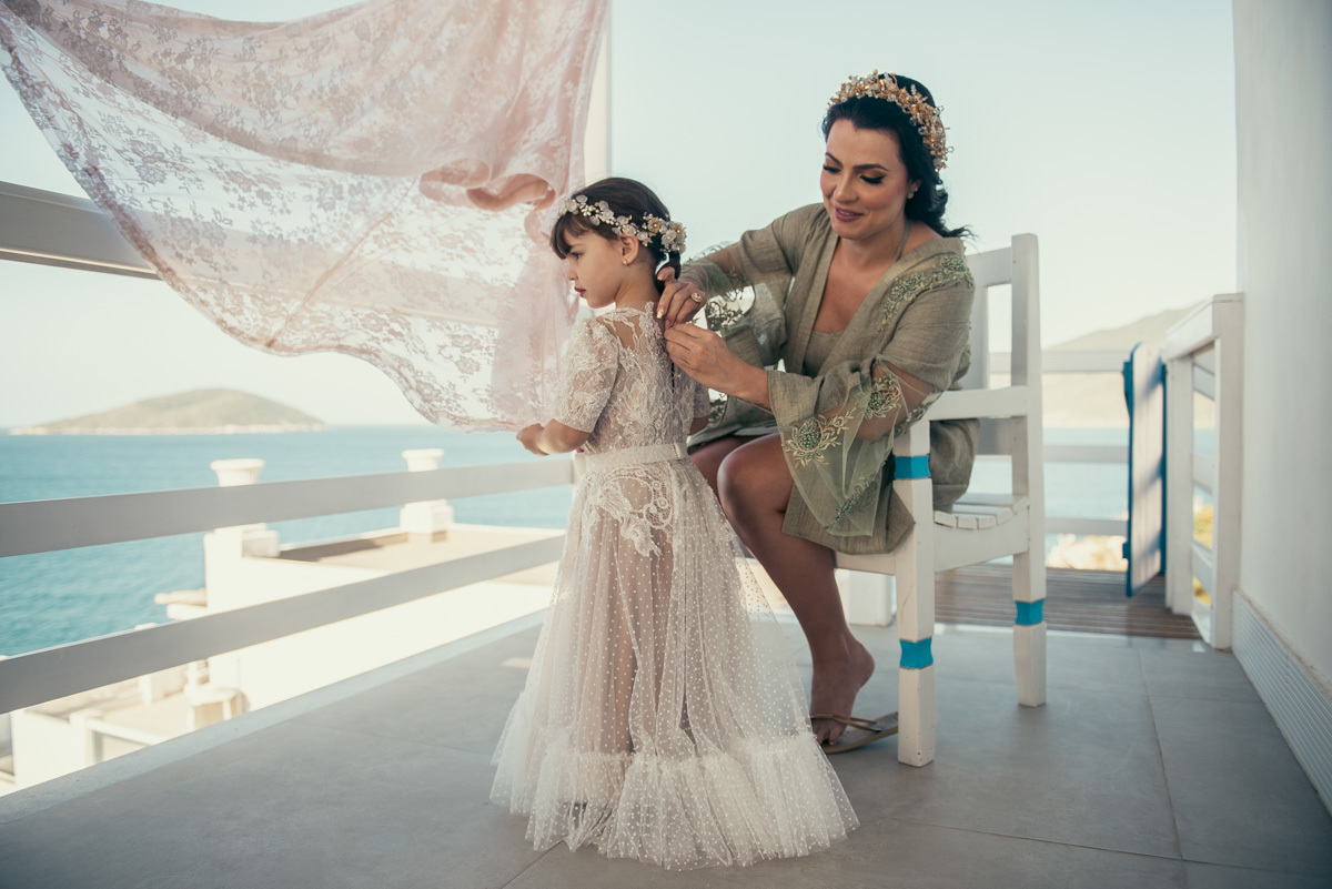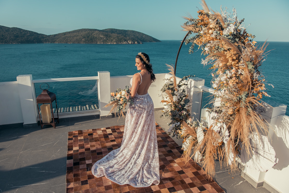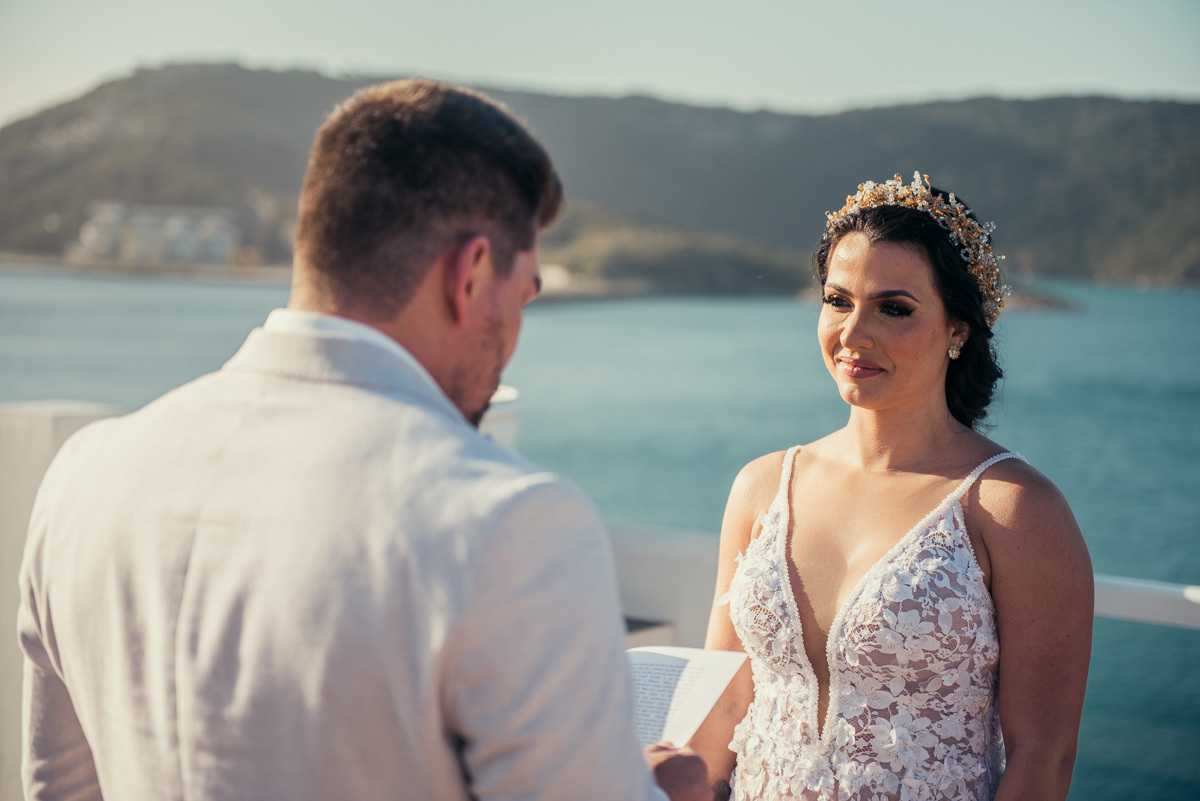 Nas casas gregas de Arraial, com o branco contrastando com o azul do céu e o mar ao fundo, Ana e Luis escolheram um cenário luminoso para celebrar o casamento. O dia estava aberto, de sol intenso, destacando ainda mais a beleza marcante dos dois — daqueles casais que parecem ter saído de um editorial.