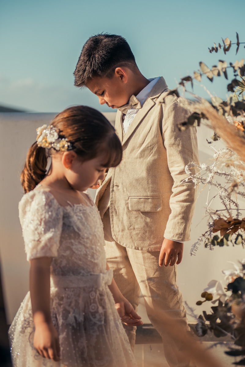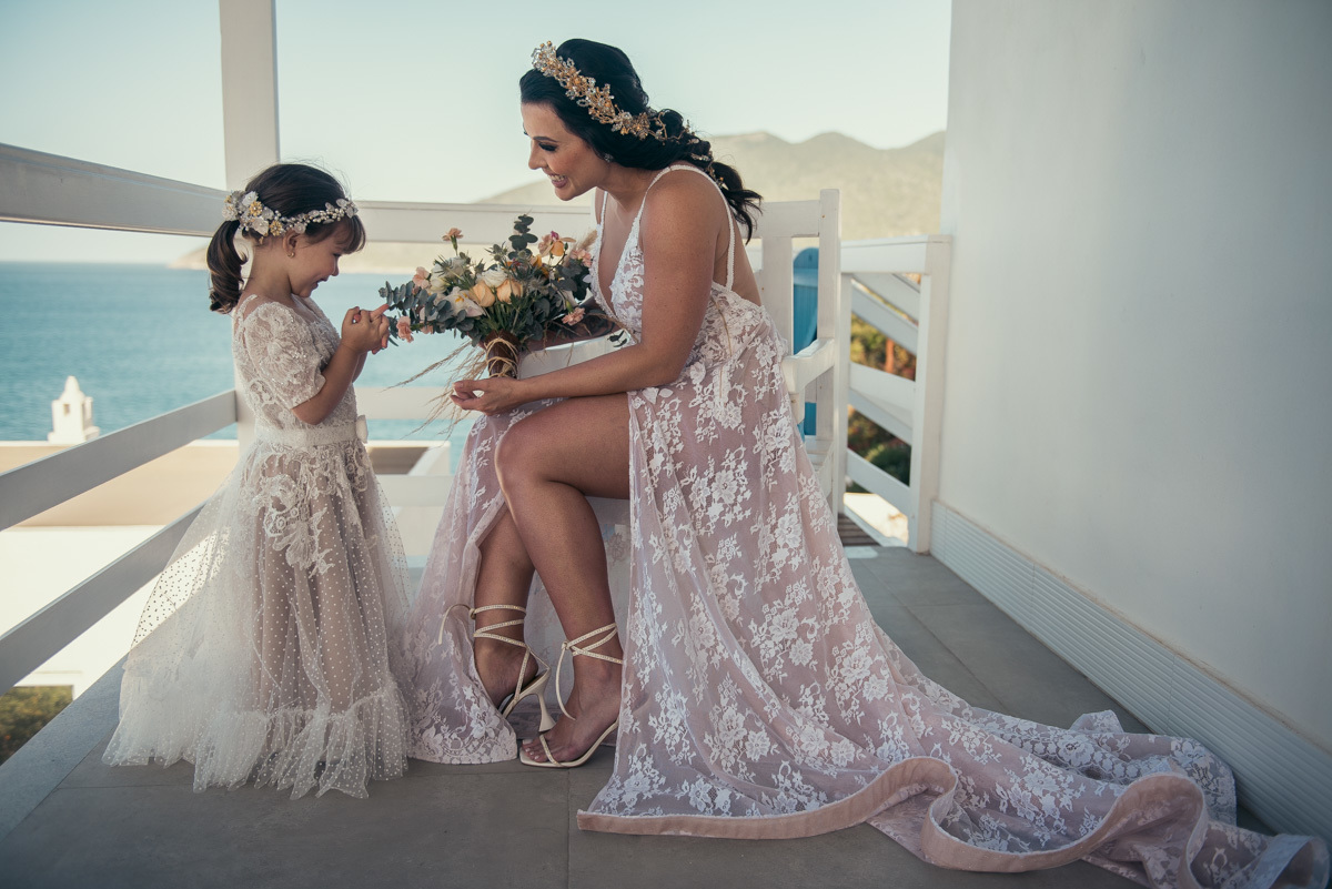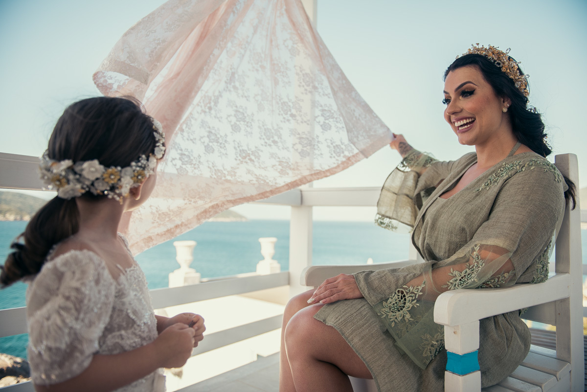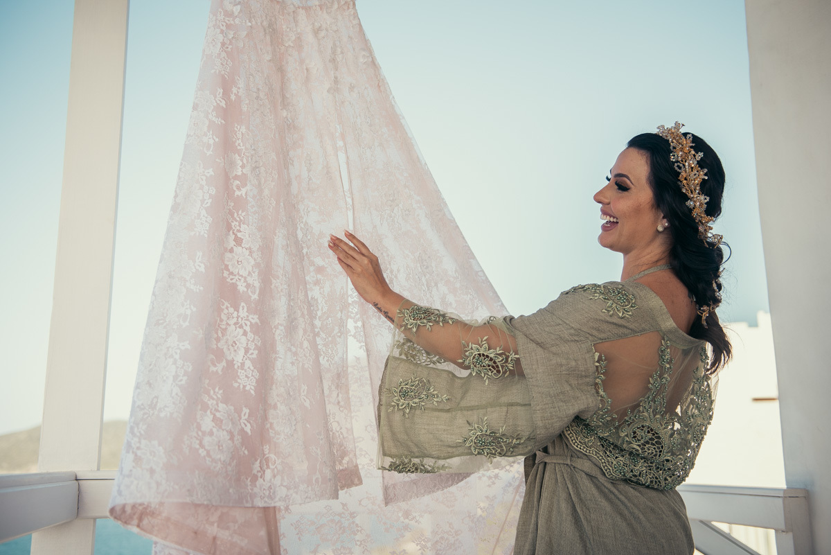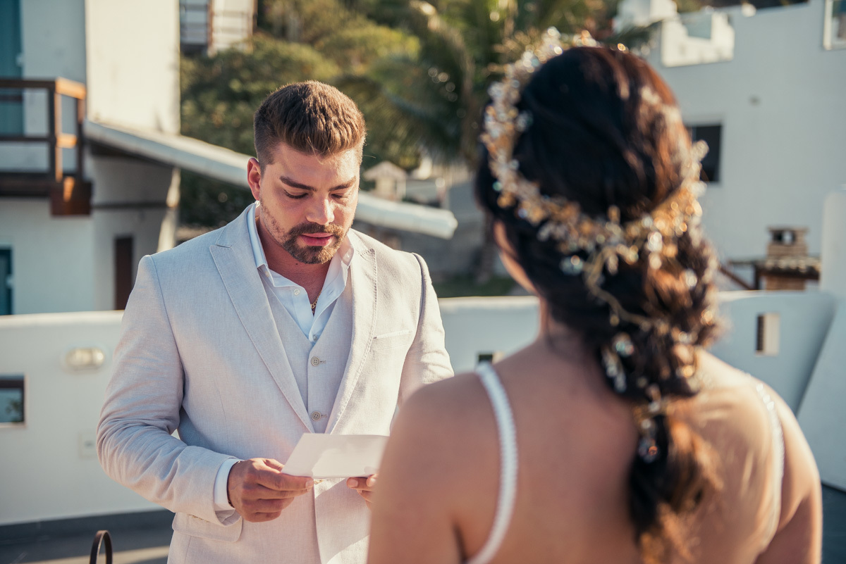 Nas casas gregas de Arraial, com o branco contrastando com o azul do céu e o mar ao fundo, Ana e Luis escolheram um cenário luminoso para celebrar o casamento. O dia estava aberto, de sol intenso, destacando ainda mais a beleza marcante dos dois — daqueles casais que parecem ter saído de um editorial.