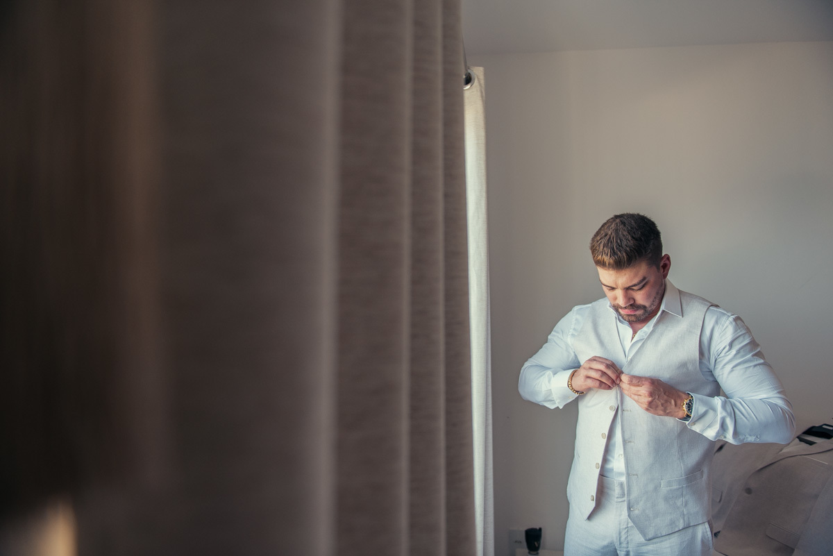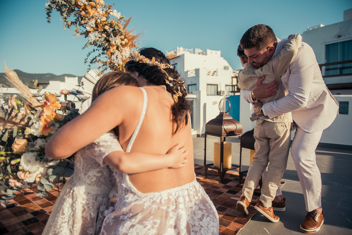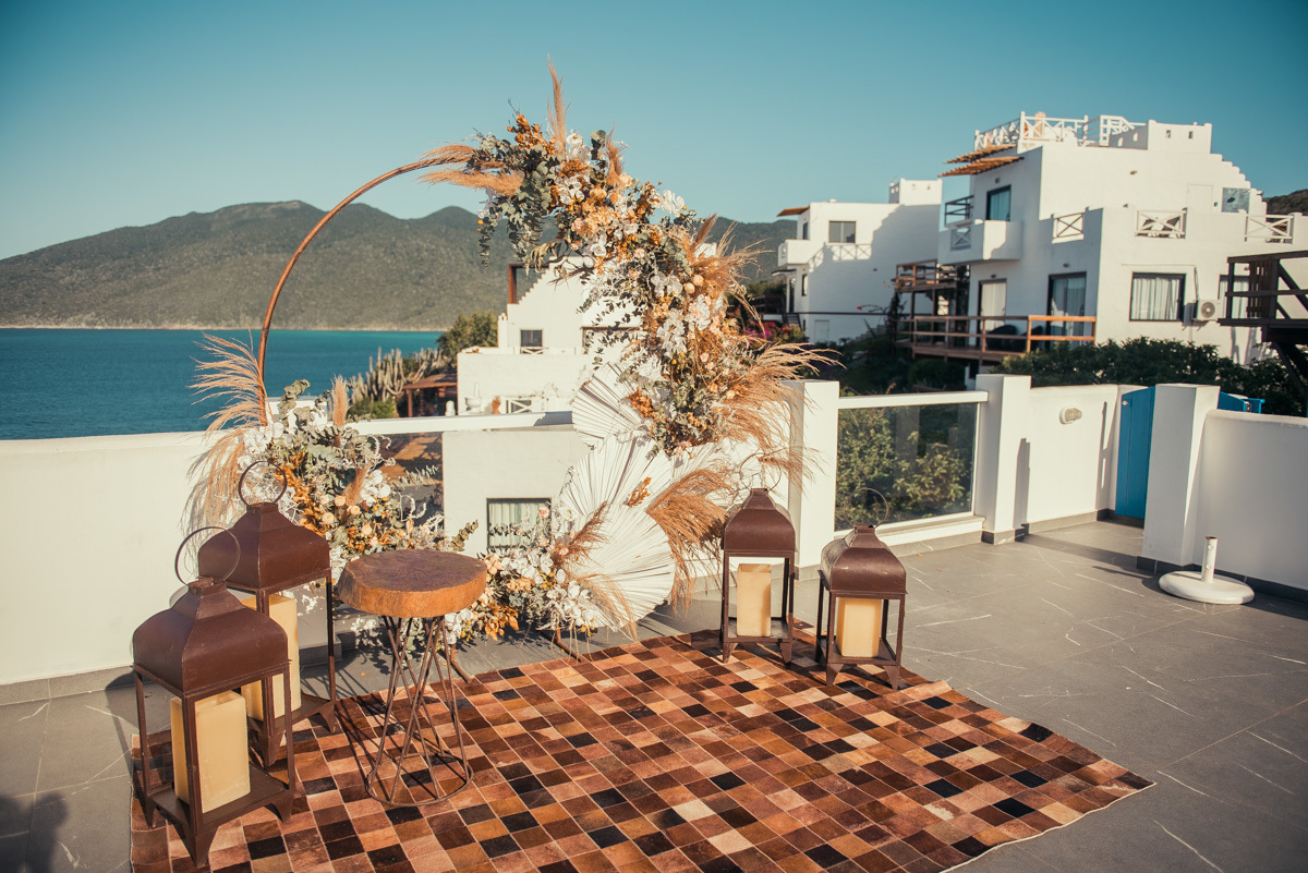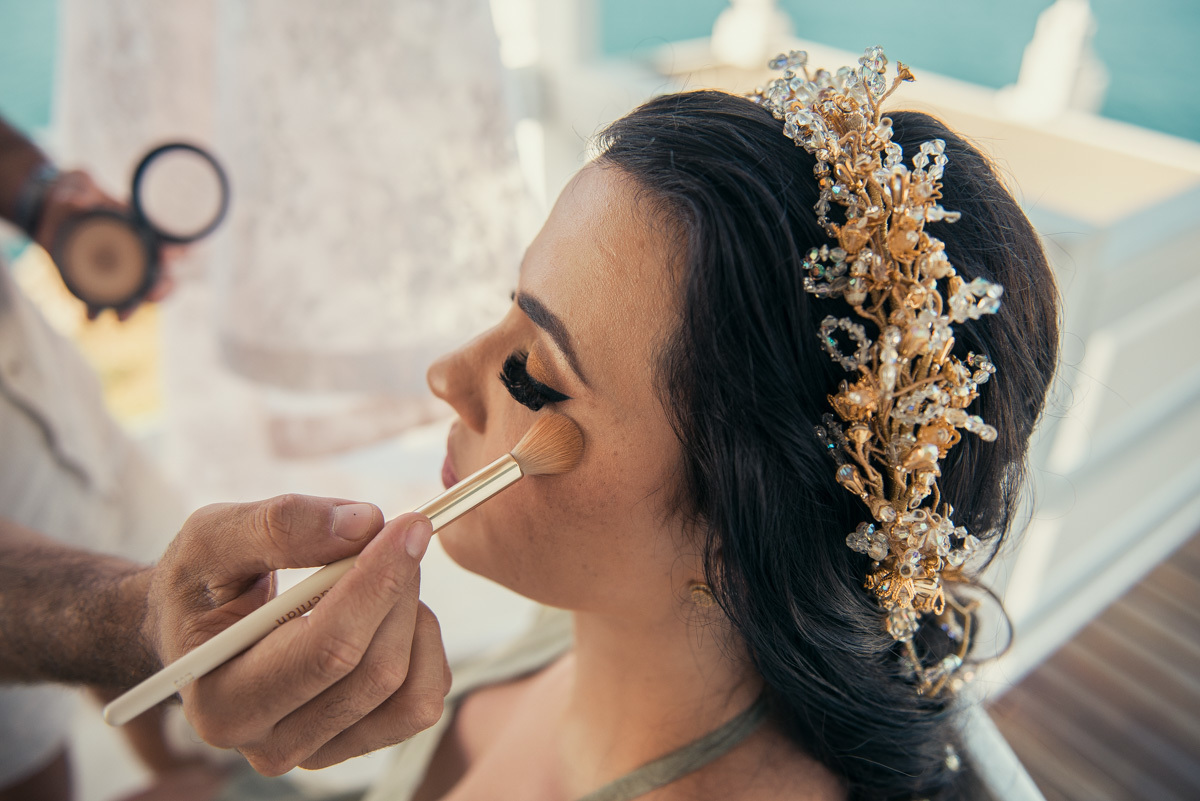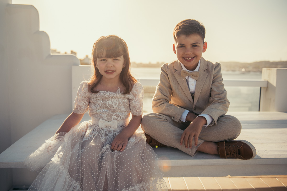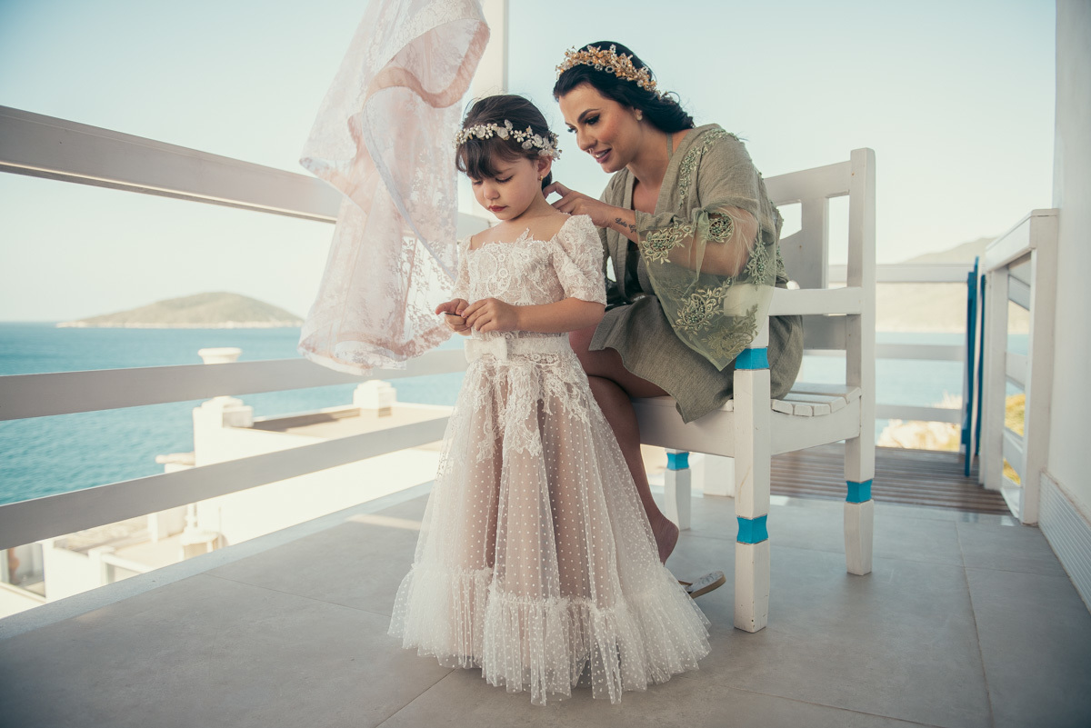 Nas casas gregas de Arraial, com o branco contrastando com o azul do céu e o mar ao fundo, Ana e Luis escolheram um cenário luminoso para celebrar o casamento. O dia estava aberto, de sol intenso, destacando ainda mais a beleza marcante dos dois — daqueles casais que parecem ter saído de um editorial.