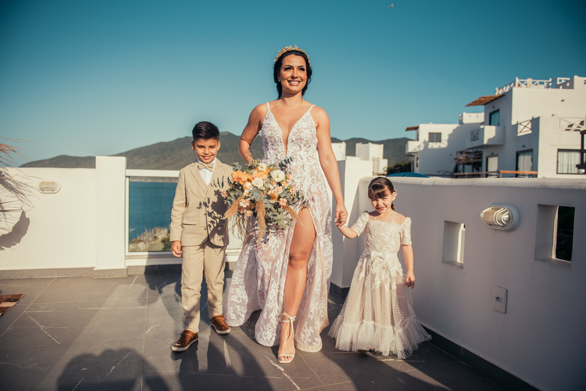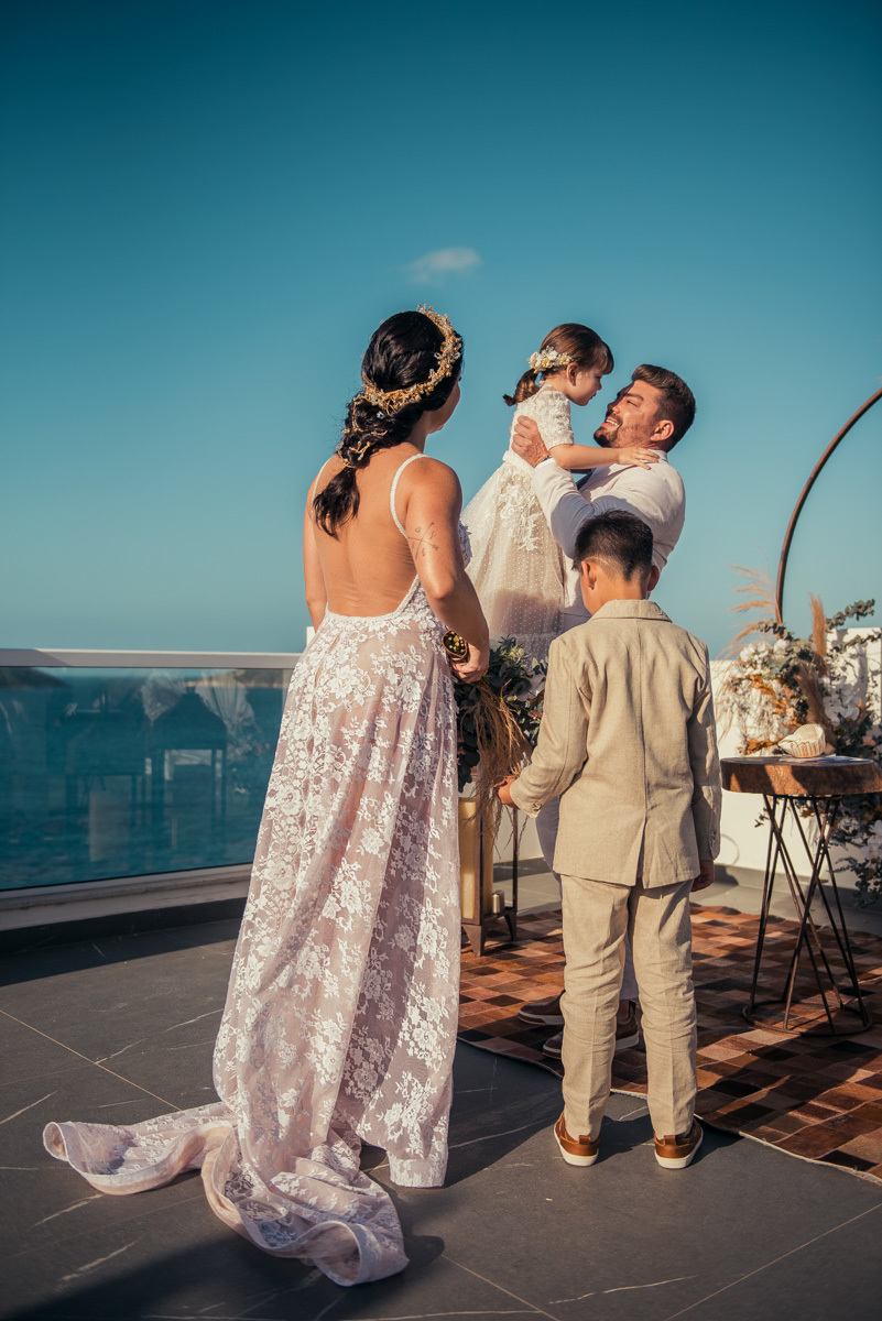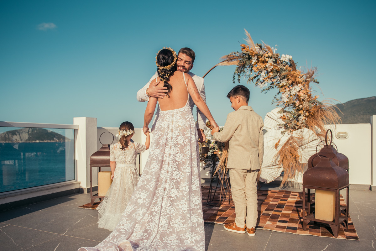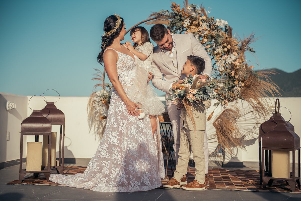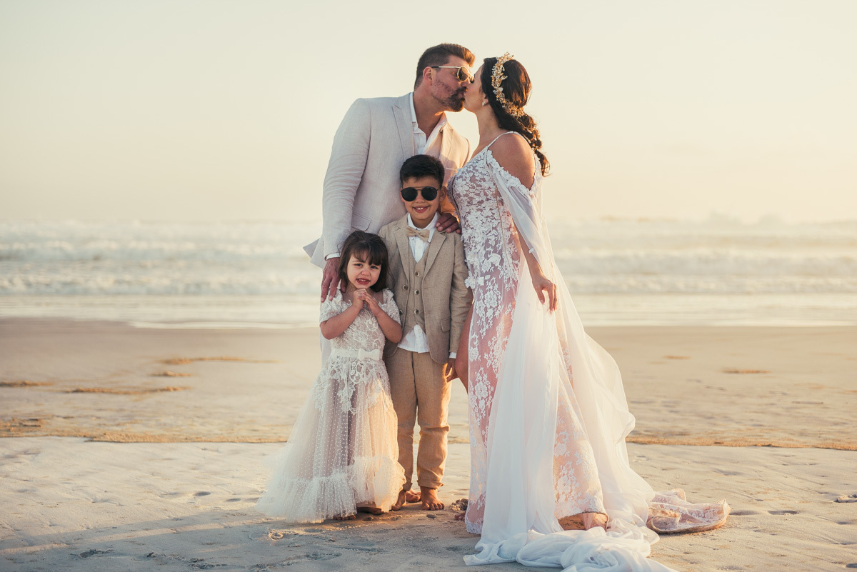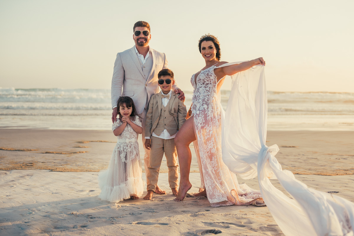 Durante o “sim”, eles foram plateia atenta. Depois, correram para os braços dos pais e participaram das fotos na areia, já com o mar e a luz dourada encerrando o dia.