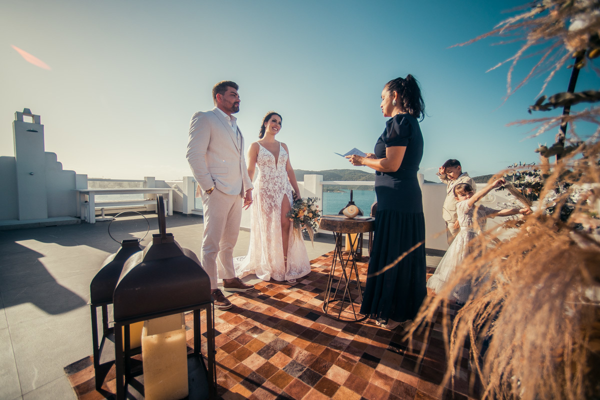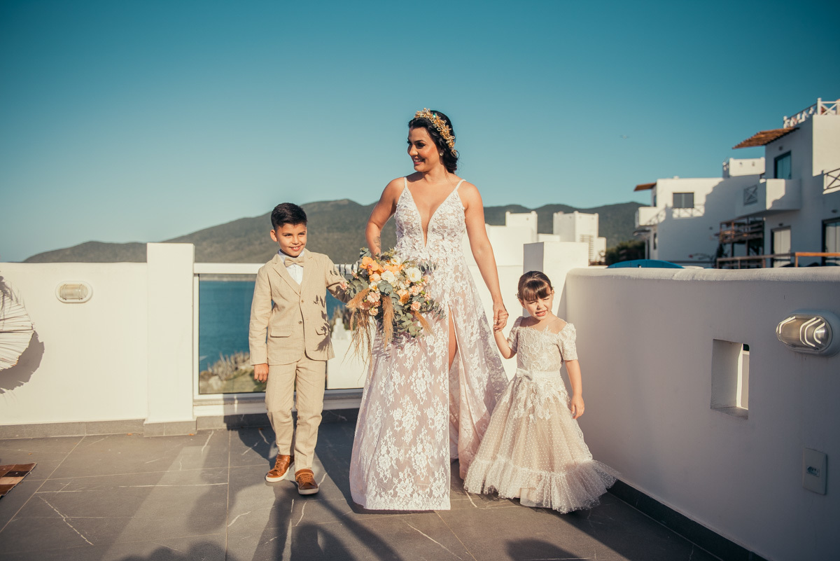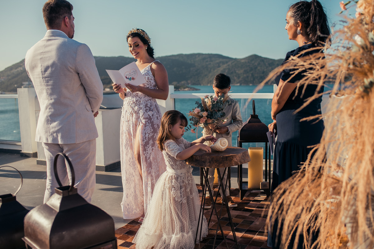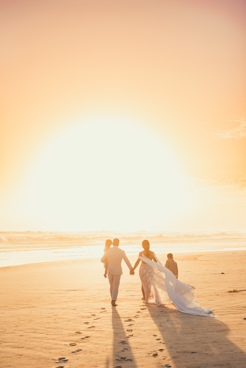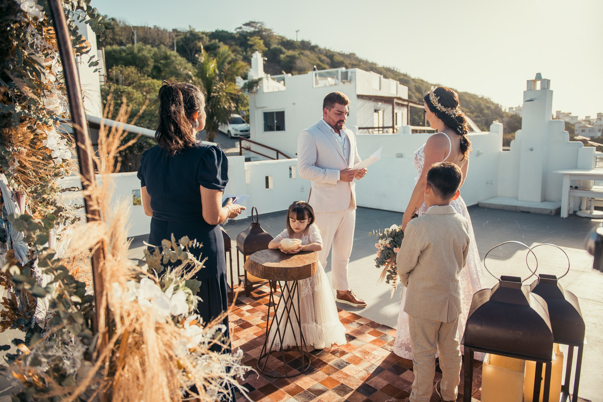 Durante o “sim”, eles foram plateia atenta. Depois, correram para os braços dos pais e participaram das fotos na areia, já com o mar e a luz dourada encerrando o dia.