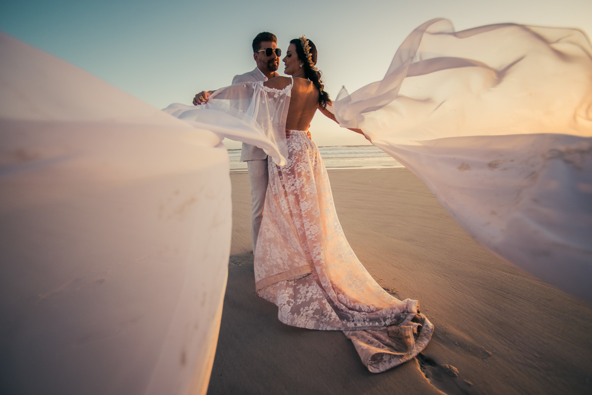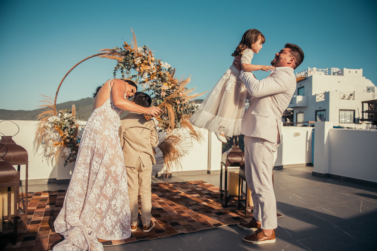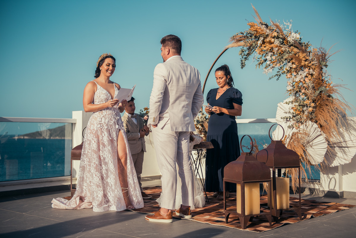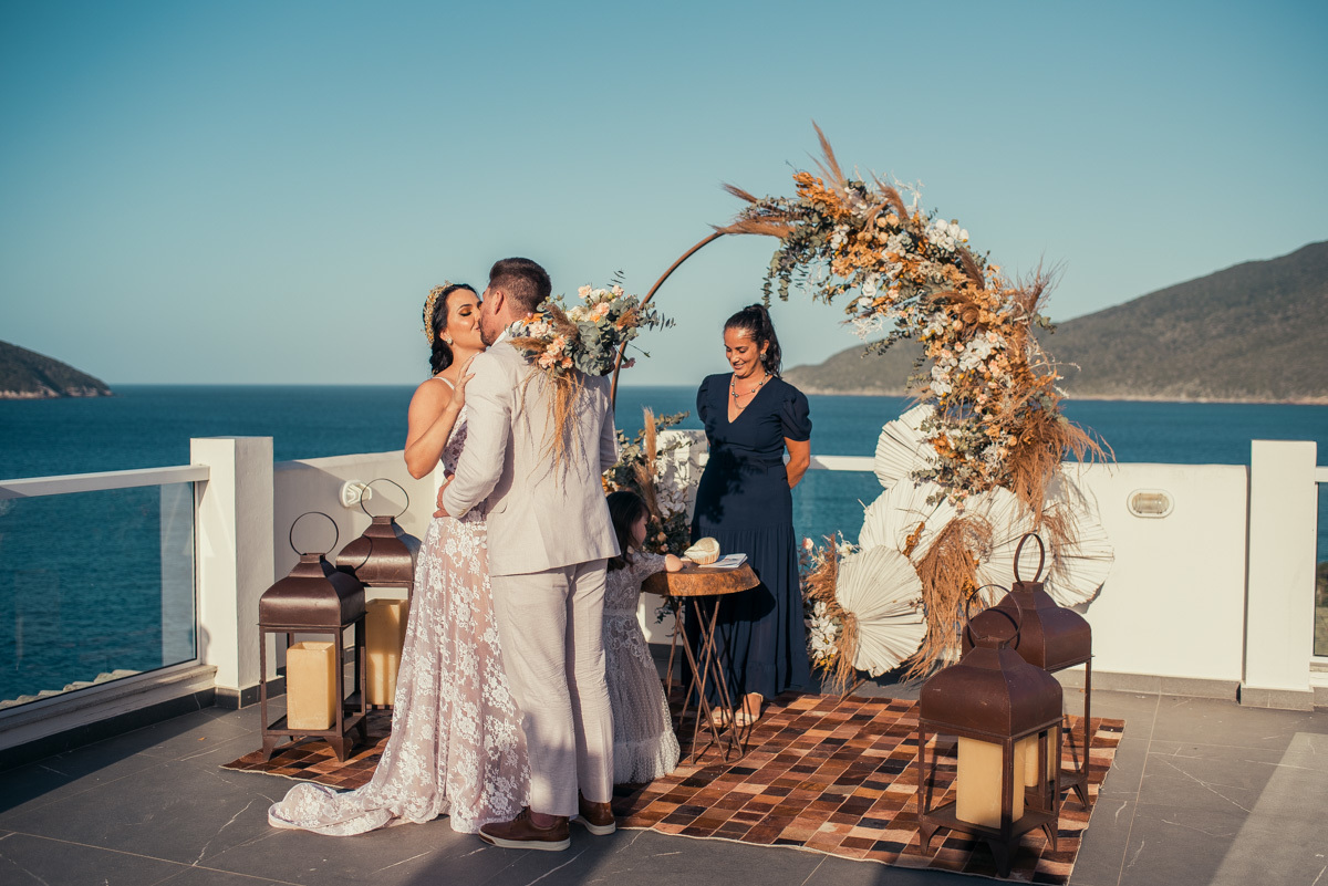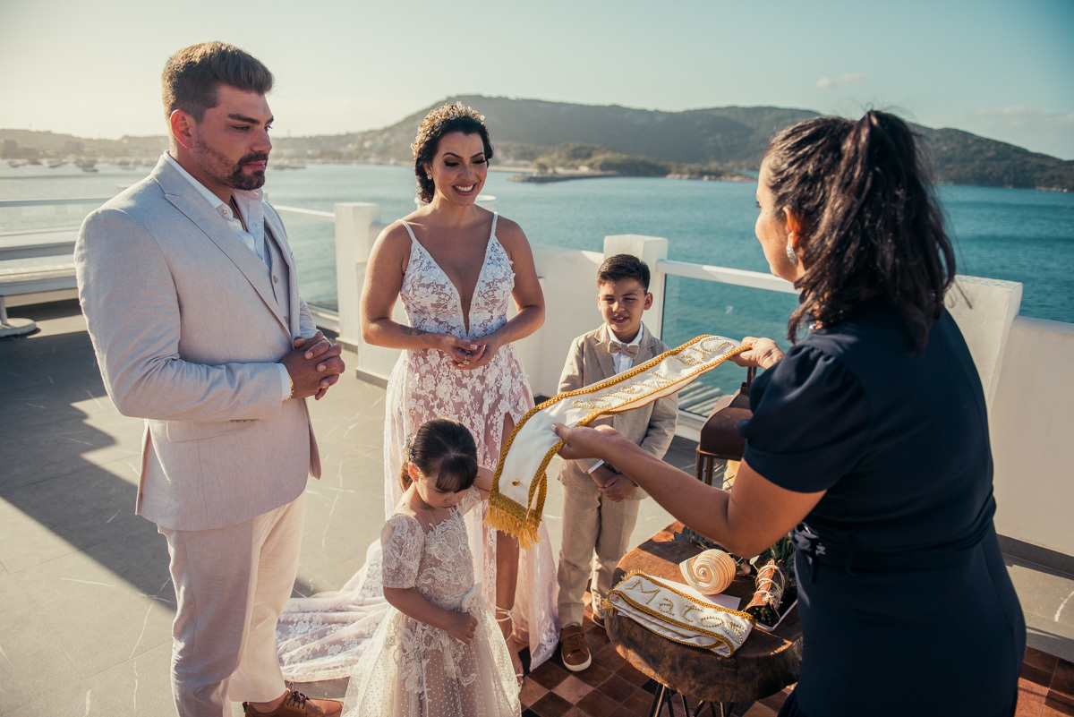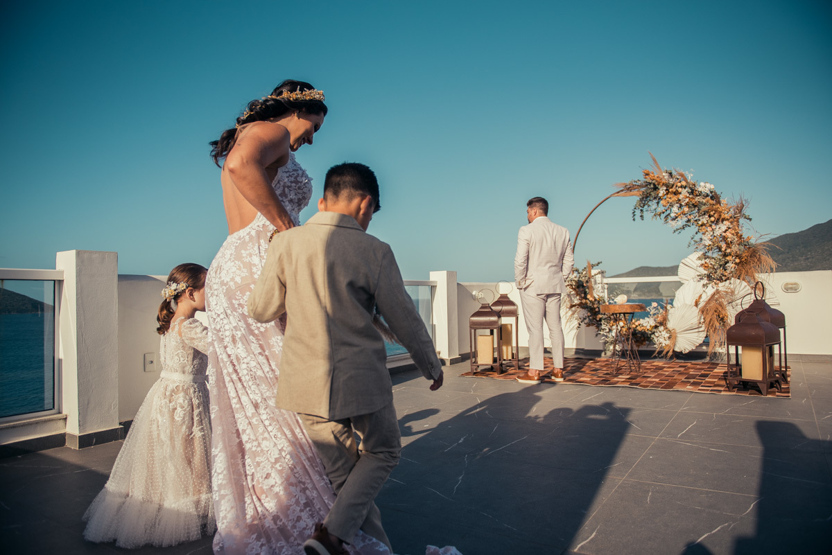 Durante o “sim”, eles foram plateia atenta. Depois, correram para os braços dos pais e participaram das fotos na areia, já com o mar e a luz dourada encerrando o dia.