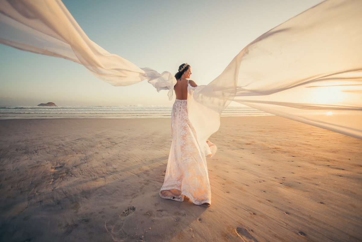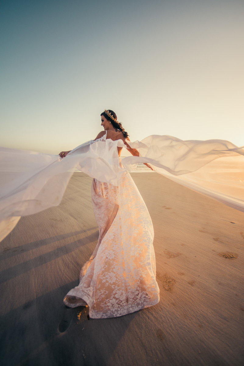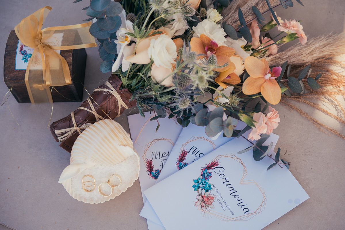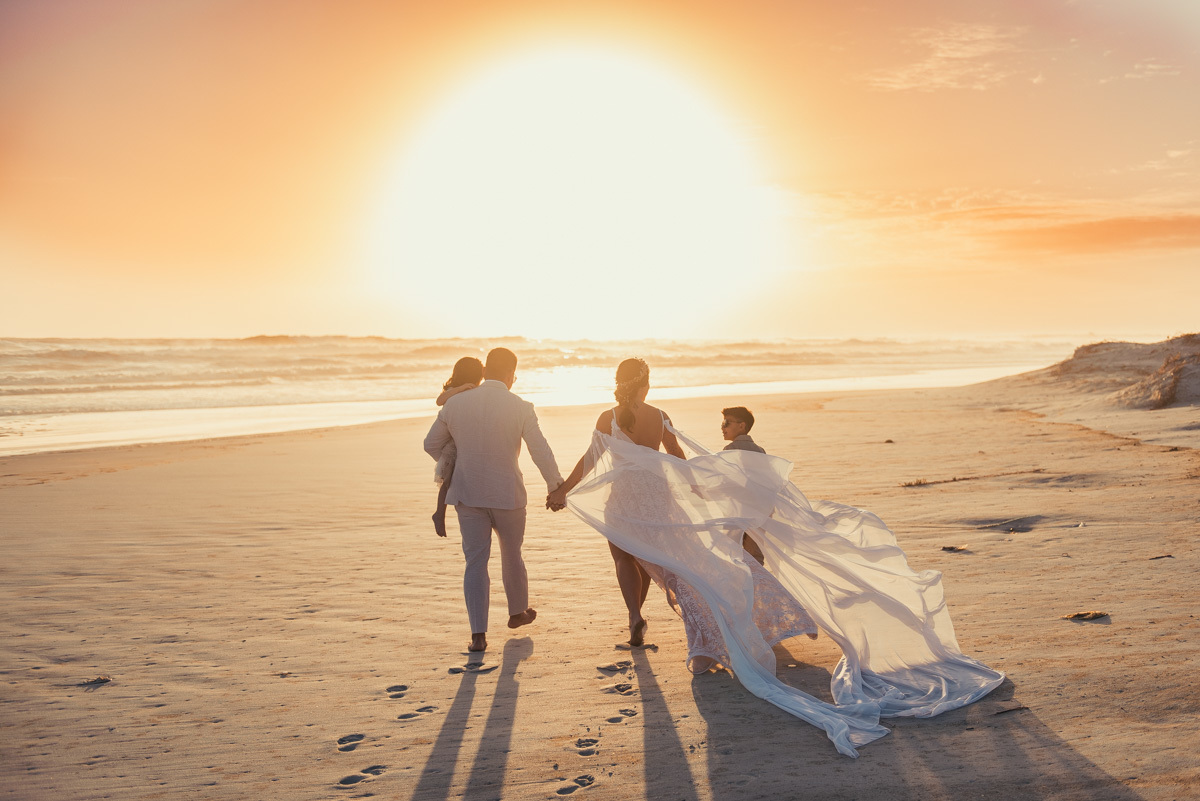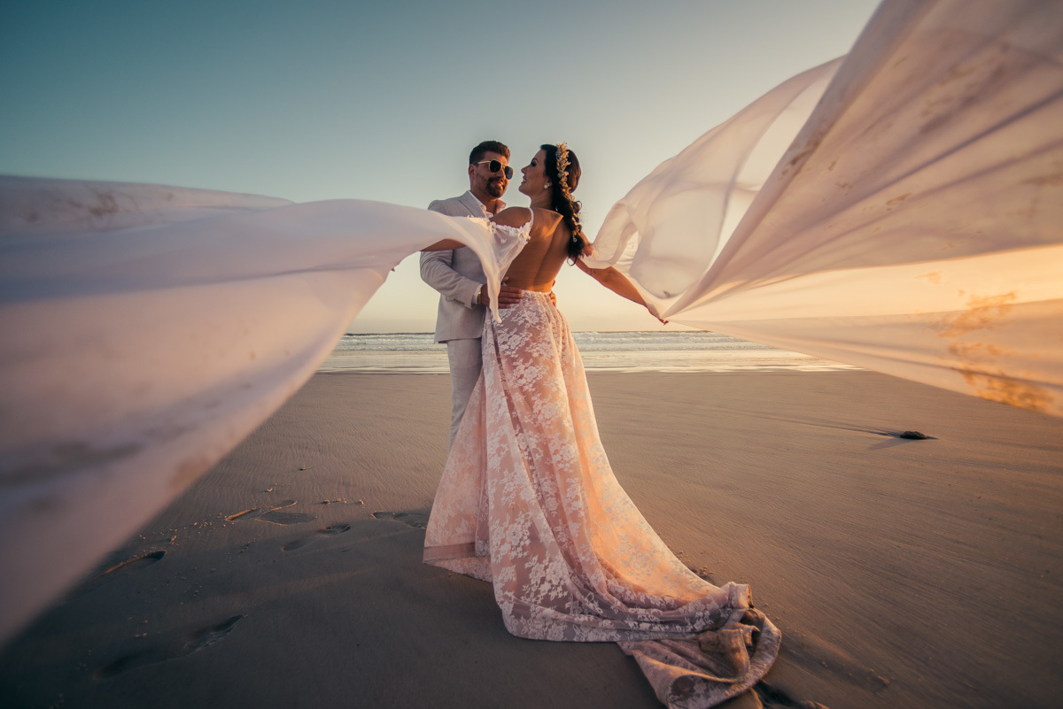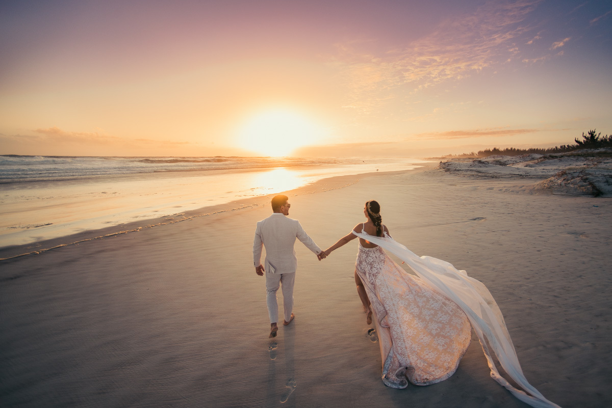 Durante o “sim”, eles foram plateia atenta. Depois, correram para os braços dos pais e participaram das fotos na areia, já com o mar e a luz dourada encerrando o dia.