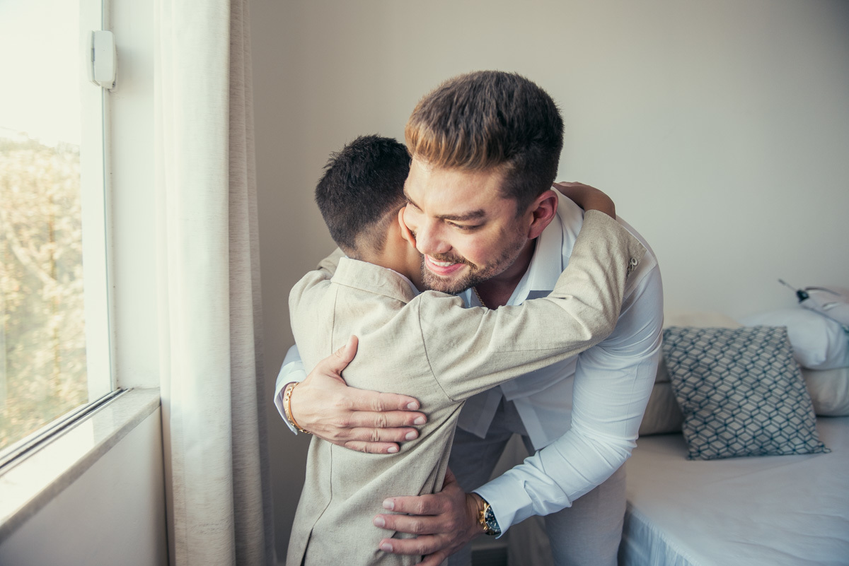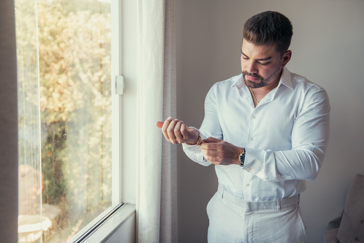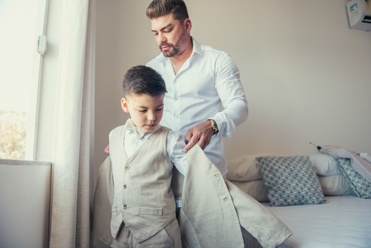 Mas o que tornou tudo ainda mais especial foi a presença dos filhos. O making of foi dividido em dois momentos cheios de significado: pai e filho se arrumando juntos, mãe e filha compartilhando os últimos detalhes antes da cerimônia. Uma preparação leve, afetiva e cheia de conexão.